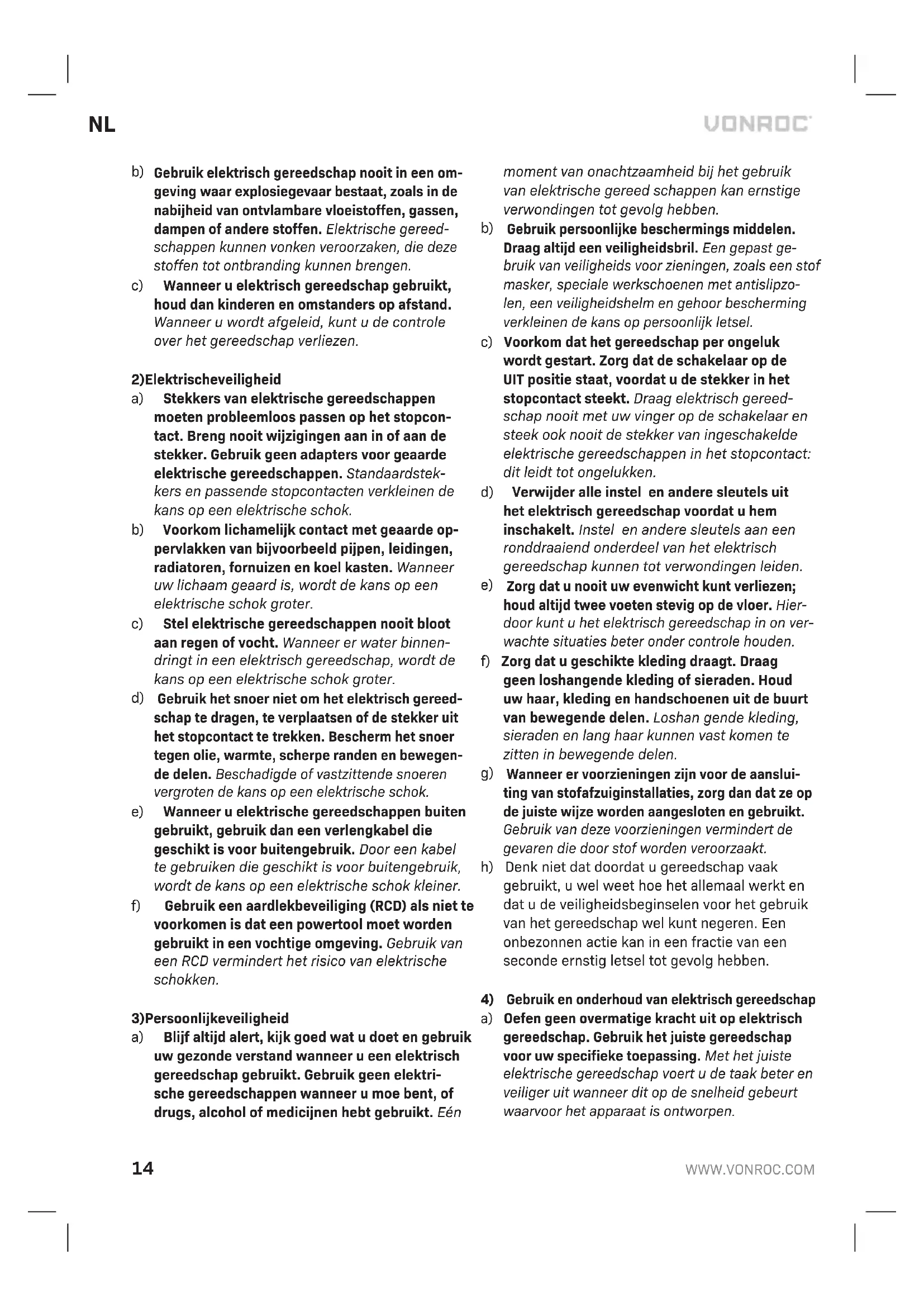 Zorg dat de machine niet onder spanning staat wanneer onderhoudswerkzaamheden aan het mechaniek worden uitgevoerd. Reinig de machinebehuizing regelmatig met een zachte doek, bij voorkeur iedere keer na gebruik. Zorg dat de ventilatiesleuven vrij van stof en vuil zijn. Gebruik bij hardnekkig vuil een zachte doek bevochtigd met zeepwater. Gebruik geen oplosmid- delen als benzine, alcohol, ammonia, etc. Dergelijke stoffen beschadigen de kunststof onderdelen. MILIEU Defecte en/of afgedankte elektrische of elektronische gereedschappen dienen ter verwerking te worden aangeboden aan een daarvoor verantwoordelijke instantie. Uitsluitend voor EG-landen Werp elektrisch gereedschap niet weg bij het huisvuil. Conform de Europese Richtlijn 2012/19/ EG voor Afgedankte Elektrische en Elektronische Apparatuur en de implementatie ervan in nationaal recht moet niet langer te gebruiken elektrisch gereedschap gescheiden worden verzameld en op een milieuvriendelijke wijze worden verwerkt. GARANTIE VONROC producten zijn ontworpen volgens de hoogste kwaliteitsstandaarden en gegarandeerd vrij van defecten, zowel materieel als fabrieksfouten, tijdens de wettelijk vastgestelde garantieperiode vanaf de eerste aankoopdatum. Mocht het product tijdens deze periode gebreken vertonen veroorzaakt door defecte materialen en/of fabrieksfouten, neem dan rechtstreeks contact op met VONROC. De volgende situaties vallen niet onder de garantie: