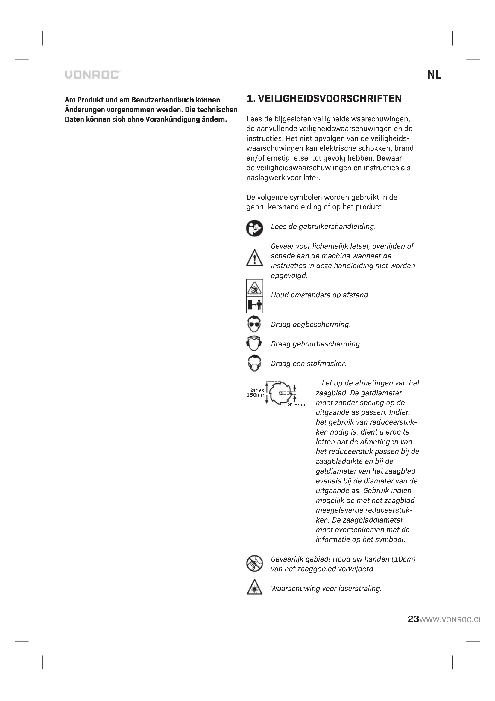 Gevaar voor lichamelijk letsel, overlijden of schade aan de machine wanneer de instructies in deze handleiding niet worden opgevolgd. Houd omstanders op afstand. Draag oogbescherming. Draag gehoorbescherming. Draag een stofmasker. Ø16mm Ømax. 150mm Let op de afmetingen van het zaagblad. De gatdiameter moet zonder speling op de uitgaande as passen. Indien het gebruik van reduceerstuk- ken nodig is, dient u erop te letten dat de afmetingen van het reduceerstuk passen bij de zaagbladdikte en bij de gatdiameter van het zaagblad evenals bij de diameter van de uitgaande as. Gebruik indien mogelijk de met het zaagblad meegeleverde reduceerstuk- ken. De zaagbladdiameter moet overeenkomen met de informatie op het symbool. Gevaarlijk gebied! Houd uw handen (10cm) van het zaaggebied verwijderd. Waarschuwing voor laserstraling.24