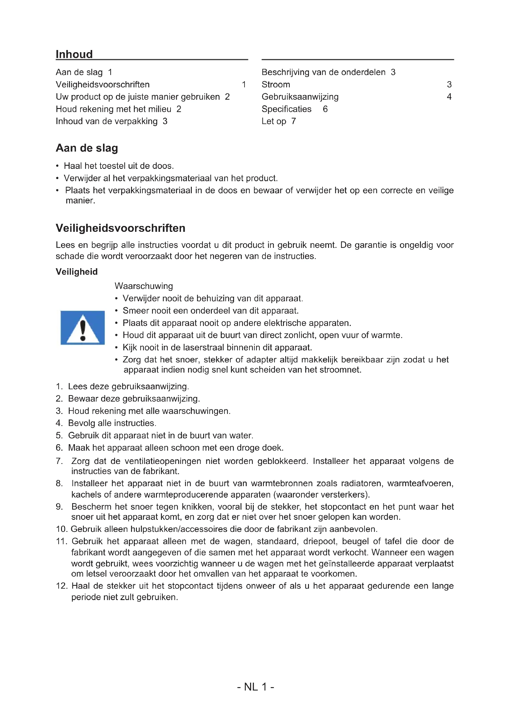 - Plaats het verpakkingsmateriaal in de doos en bewaar of verwijder het op een correcte en veilige manier. Veiligheidsvoorschriften Lees en begrijp alle instructies voordat u dit product in gebruik neemt. De garantie is ongeldig voor schade die wordt veroorzaakt door het negeren van de instructies. Veiligheid Waarschuwing