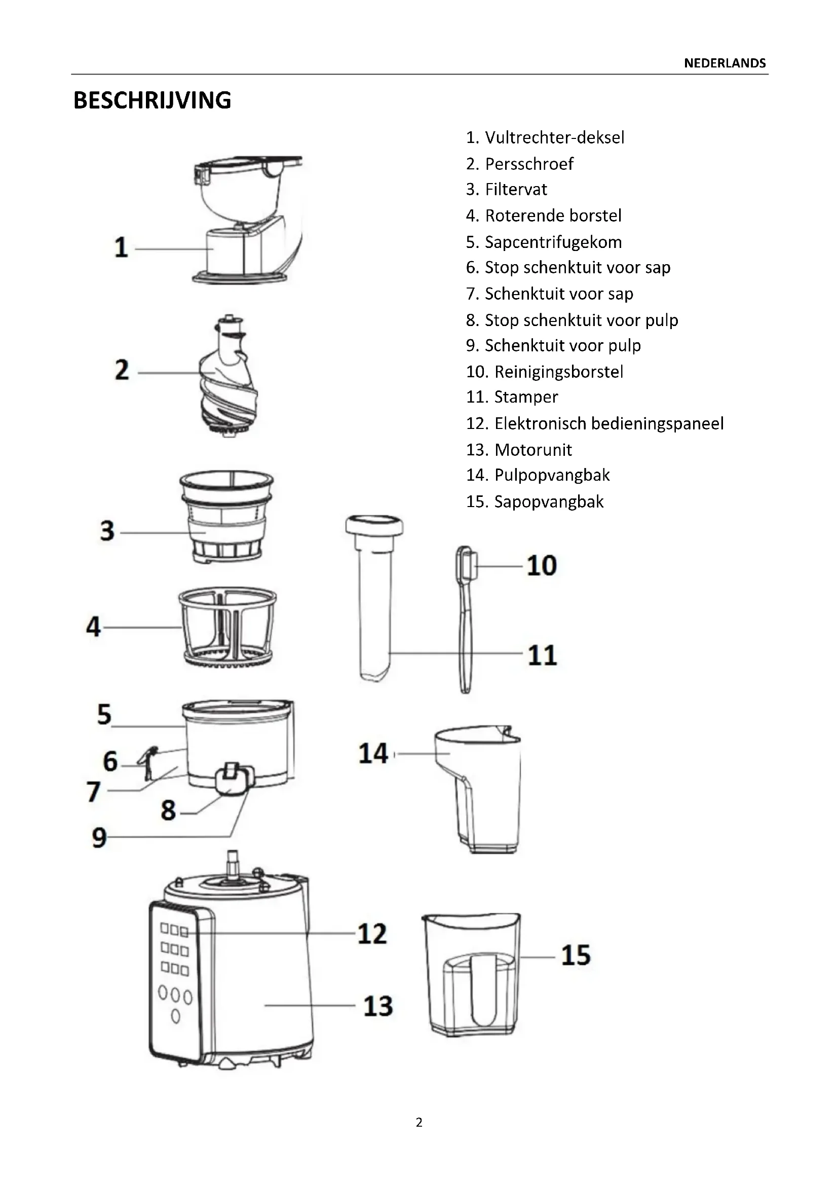 Stap 1: Plaats de sapcentrifugekom bovenaan op de motorunit en let erop dat het merkteken " " van de kom overeenkomt met het merkteken " " van de motorunit. Draai de kom dan rechtsom totdat ze vastzit. Stap 2: Plaats het filtervat in de roterende borstel. Stap 3: Plaats het geheel van het filtervat en de roterende borstel in de sapcentrifugekom en let erop dat het merkteken " van de filter overeenkomt met het merkteken " " van de kom. Stap 4: Plaats de persschroef middenin het filtervat, draai de schroef en duw ze in de opening totdat ze tot stilstand komt. Let wel: het deksel kan niet dicht zolang de schroef niet voldoende is ingeduwd. Opgelet: Let erop dat uw vinger niet in de ruimte tussen het vat en de schroef gekneld raakt. Stap 5: Plaats het vultrechter-deksel boven de centrifugekom en let erop dat het merkteken " " van het deksel overeenkomt met het merkteken " " van de kom. Draai het deksel dan rechtsom totdat het vastzit. Stap 6: Plaats de pulpopvangbak onder de schenktuit voor de pulp. Plaats dan de sapopvangbak onder de schenktuit voor het sap. Opgelet: Controleer of alle elementen zorgvuldig op het apparaat zijn gemonteerd. Bij verkeerde montage zal het apparaat niet functioneren.NEDERLANDS