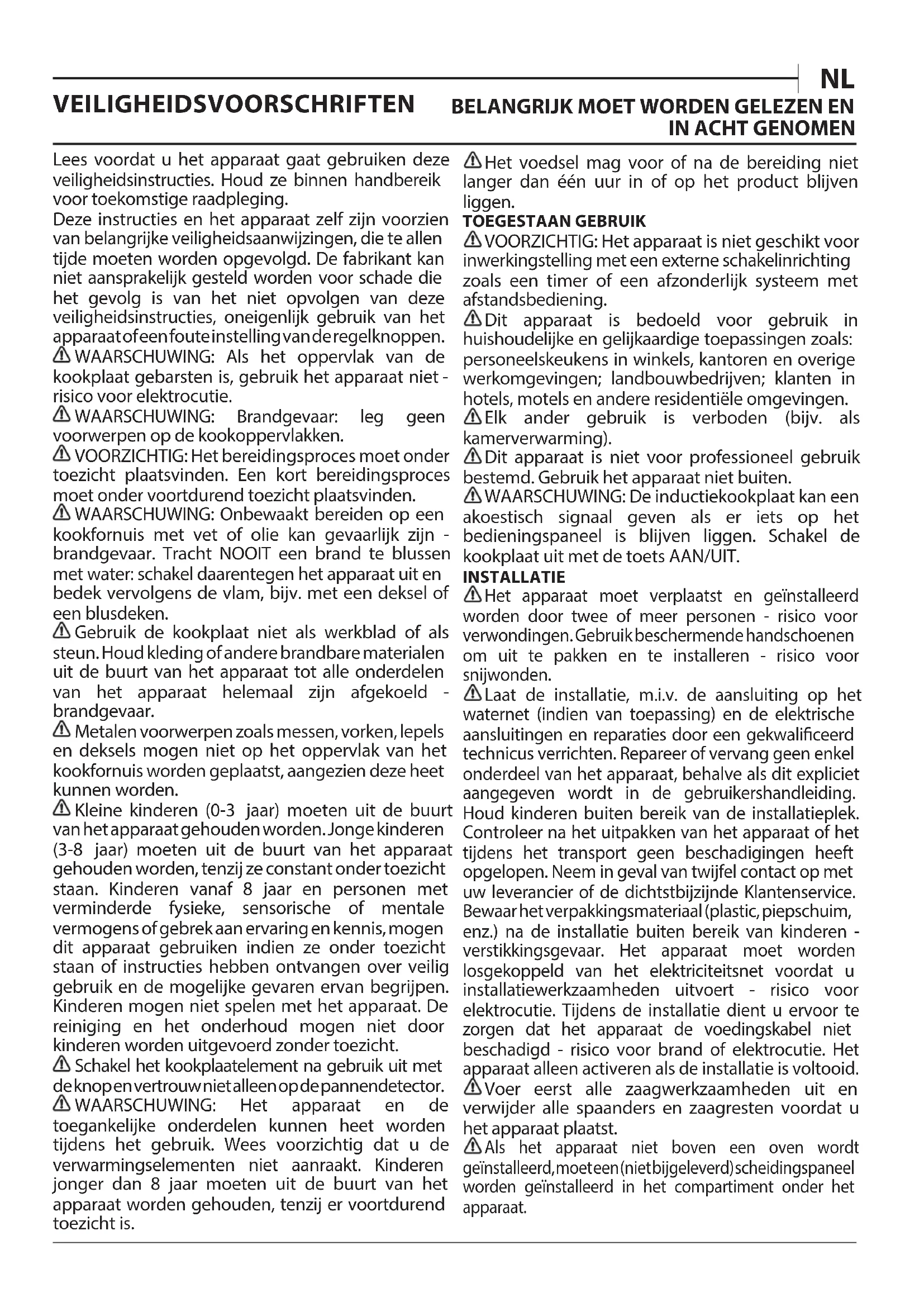 Lees voordat u het apparaat gaat gebruiken deze veiligheidsinstructies. Houd ze binnen handbereik voor toekomstige raadpleging. Deze instructies en het apparaat zelf zijn voorzien van belangrijke veiligheidsaanwijzingen, die te allen tijde moeten worden opgevolgd. De fabrikant kan niet aansprakelijk gesteld worden voor schade die het gevolg is van het niet opvolgen van deze veiligheidsinstructies, oneigenlijk gebruik van het apparaat of een foute instelling van de regelknoppen. WAARSCHUWING: Als het oppervlak van de kookplaat gebarsten is, gebruik het apparaat niet- risico voor elektrocutie. WAARSCHUWING: Brandgevaar: leg geen voorwerpen op de kookoppervlakken. VOORZICHTIG: Het bereidingsproces moet onder toezicht plaatsvinden. Een kort bereidingsproces moet onder voortdurend toezicht plaatsvinden. WAARSCHUWING: Onbewaakt bereiden op een kookfornuis met vet of olie kan gevaarlijk zijn - brandgevaar. Tracht NOOIT een brand te blussen met water: schakel daarentegen het apparaat uit en bedek vervolgens de vlam, bijv. met een deksel of een blusdeken. Gebruik de kookplaat niet als werkblad of als steun. Houd kleding of andere brandbare materialen uit de buurt van het apparaat tot alle onderdelen van het apparaat helemaal zijn afgekoeld - brandgevaar. Metalen voorwerpen zoals messen, vorken, lepels en deksels mogen niet op het oppervlak van het kookfornuis worden geplaatst, aangezien deze heet kunnen worden. Kleine kinderen (0-3 jaar) moeten uit de buurt van het apparaat gehouden worden. Jonge kinderen (3-8 jaar) moeten uit de buurt van het apparaat gehouden worden, tenzij ze constant onder toezicht staan. Kinderen vanaf 8 jaar en personen met verminderde fysieke, sensorische of mentale vermogens of gebrek aan ervaring en kennis, mogen dit apparaat gebruiken indien ze onder toezicht staan of instructies hebben ontvangen over veilig gebruik en de mogelijke gevaren ervan begrijpen. Kinderen mogen niet spelen met het apparaat. De reiniging en het onderhoud mogen niet door kinderen worden uitgevoerd zonder toezicht. Schakel het kookplaatelement na gebruik uit met de knop en vertrouw niet alleen op de pannendetector. WAARSCHUWING: Het apparaat en de toegankelijke onderdelen kunnen heet worden tijdens het gebruik. Wees voorzichtig dat u de verwarmingselementen niet aanraakt. Kinderen jonger dan 8 jaar moeten uit de buurt van het apparaat worden gehouden, tenzij er voortdurend toezicht is. Het voedsel mag voor of na de bereiding niet langer dan één uur in of op het product blijven liggen. TOEGESTAAN GEBRUIK VOORZICHTIG: Het apparaat is niet geschikt voor inwerkingstelling met een externe schakelinrichting zoals een timer of een afzonderlijk systeem met afstandsbediening. Dit apparaat is bedoeld voor gebruik in huishoudelijke en gelijkaardige toepassingen zoals: personeelskeukens in winkels, kantoren en overige werkomgevingen; landbouwbedrijven; klanten in hotels, motels en andere residentiële omgevingen. Elk ander gebruik is verboden (bijv. als kamerverwarming). Dit apparaat is niet voor professioneel gebruik bestemd. Gebruik het apparaat niet buiten. WAARSCHUWING: De inductiekookplaat kan een akoestisch signaal geven als er iets op het bedieningspaneel is blijven liggen. Schakel de kookplaat uit met de toets AAN/UIT. INSTALLATIE Het apparaat moet verplaatst en geïnstalleerd worden door twee of meer personen - risico voor verwondingen. Gebruik beschermende handschoenen om uit te pakken en te installeren - risico voor snijwonden. Laat de installatie, m.i.v. de aansluiting op het waternet (indien van toepassing) en de elektrische aansluitingen en reparaties door een gekwaliceerd technicus verrichten. Repareer of vervang geen enkel onderdeel van het apparaat, behalve als dit expliciet aangegeven wordt in de gebruikershandleiding. Houd kinderen buiten bereik van de installatieplek. Controleer na het uitpakken van het apparaat of het tijdens het transport geen beschadigingen heeft opgelopen. Neem in geval van twijfel contact op met uw leverancier of de dichtstbijzijnde Klantenservice. Bewaar het verpakkingsmateriaal (plastic, piepschuim, enz.) na de installatie buiten bereik van kinderen - verstikkingsgevaar. Het apparaat moet worden losgekoppeld van het elektriciteitsnet voordat u installatiewerkzaamheden uitvoert - risico voor elektrocutie. Tijdens de installatie dient u ervoor te zorgen dat het apparaat de voedingskabel niet beschadigd - risico voor brand of elektrocutie. Het apparaat alleen activeren als de installatie is voltooid. Voer eerst alle zaagwerkzaamheden uit en verwijder alle spaanders en zaagresten voordat u het apparaat plaatst. Als het apparaat niet boven een oven wordt geïnstalleerd, moet een (niet bijgeleverd) scheidingspaneel worden geïnstalleerd in het compartiment onder het apparaat.ELEKTRISCHE WAARSCHUWINGEN Het moet mogelijk zijn het apparaat van het elektriciteitsnet af te koppelen door de stekker uit het stopcontact te halen of via een meerpolige netschakelaar die bovenstrooms van het stopcontact is geplaatst conform de bedradingsvoorschriften en het apparaat dient geaard te zijn conform de nationale veiligheidsnormen voor elektriciteit. Gebruik geen verlengsnoeren, meervoudige stopcontacten of adapters. Als de installatie voltooid is, mogen de elektrische onderdelen niet meer toegankelijk zijn voor de gebruiker. Gebruik het apparaat niet wanneer u natte voeten hebt of blootsvoets bent. Gebruik het apparaat niet als de stroomkabel of de stekker beschadigd is, als het apparaat niet goed werkt of als het beschadigd of gevallen is. Installatie met behulp van een netsnoerstekker is niet toegestaan, tenzij het product reeds is uitgerust met de door de fabrikant geleverde stekker. Als het netsnoer beschadigd is, moet het vervangen worden door de fabrikant, een servicevertegenwoordiger of gekwaliceerd personeel om risico’s te voorkomen - risico voor elektrocutie.