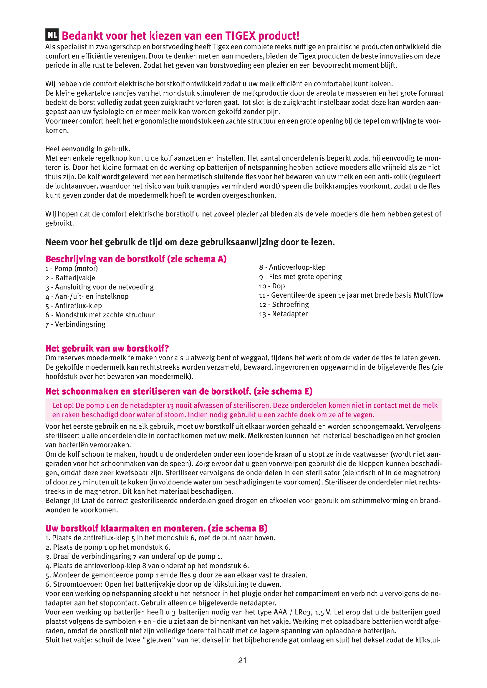 - La tetina base larga Tigex é usado com a base larga biberao Tigex INTUTION ou MULTIFLOW Garantia O cabo de alimentação e o conector estão excluí- dos da garantia. Garantia de 2 anos Envie a cópia da sua prova de compra, o seu nome, apelido e morada num papel branco, e o produto defeituosopara seu varejista ou para : ALLEGRE PUERICULTURE Service consommateur 41 rue Edouard Martel 42000 Saint-Etienne FRANCE NOTICE TIRE LAIT ELECT MULTIFLOW_Mise en page 1 11/08/17 11:36 Page2021 Het gebruik van uw borstkolf? Om reserves moedermelk te maken voor als u afwezig bent of weggaat, tijdens het werk of om de vader de fles te laten geven. De gekolfde moedermelk kan rechtstreeks worden verzameld, bewaard, ingevroren en opgewarmd in de bijgeleverde fles (zie hoofdstuk over het bewaren van moedermelk). Het schoonmaken en steriliseren van de borstkolf. (zie schema E) Let op! De pomp 1 en de netadapter 13 nooit afwassen of steriliseren. Deze onderdelen komen niet in contact met de melk en raken beschadigd door water of stoom. Indien nodig gebruikt u een zachte doek om ze af te vegen. Voor het eerste gebruik en na elk gebruik, moet uw borstkolf uit elkaar worden gehaald en worden schoongemaakt. Vervolgens steriliseert u alle onderdelen die in contact komen met uw melk. Melkresten kunnen het materiaal beschadigen en het groeien van bacteriën veroorzaken. Om de kolf schoon te maken, houdt u de onderdelen onder een lopende kraan of u stopt ze in de vaatwasser (wordt niet aan- geraden voor het schoonmaken van de speen). Zorg ervoor dat u geen voorwerpen gebruikt die de kleppen kunnen beschadi- gen, omdat deze zeer kwetsbaar zijn. Steriliseer vervolgens de onderdelen in een sterilisator (elektrisch of in de magnetron) of door ze 5 minuten uit te koken (in voldoende water om beschadigingen te voorkomen). Steriliseer de onderdelen niet rechts- treeks in de magnetron. Dit kan het materiaal beschadigen. Belangrijk! Laat de correct gesteriliseerde onderdelen goed drogen en afkoelen voor gebruik om schimmelvorming en brand- wonden te voorkomen. Uw borstkolf klaarmaken en monteren. (zie schema B)