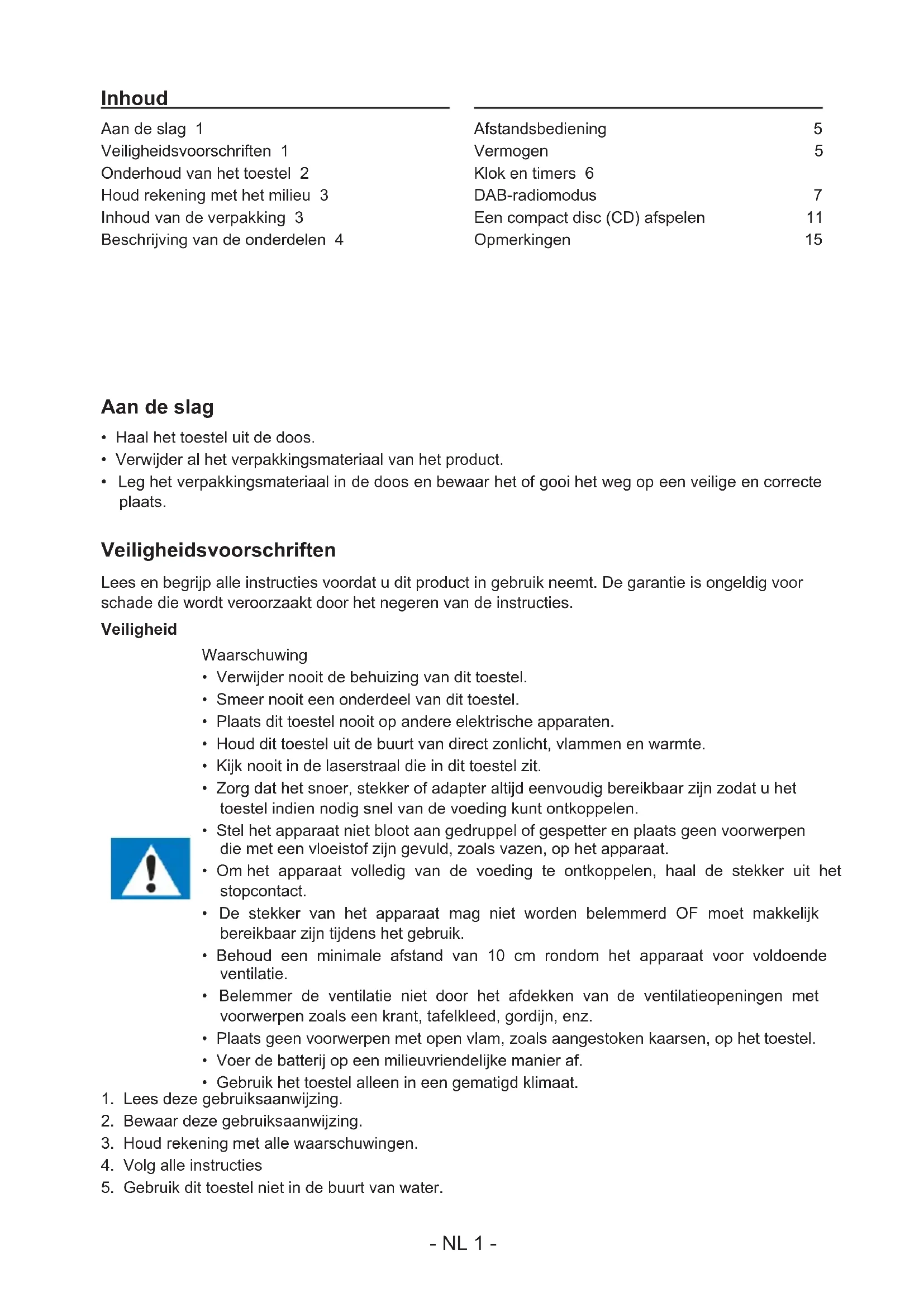 Aan de slag 1 Veiligheidsvoorschriften 1 Onderhoud van het toestel 2 Houd rekening met het milieu 3 Inhoud van de verpakking 3 Beschrijving van de onderdelen 4 Afstandsbediening 5 Vermogen 5 Klok en timers 6 DAB-radiomodus 7 Een compact disc (CD) afspelen 11 Opmerkingen: 15 Inhoud- NL 2 -