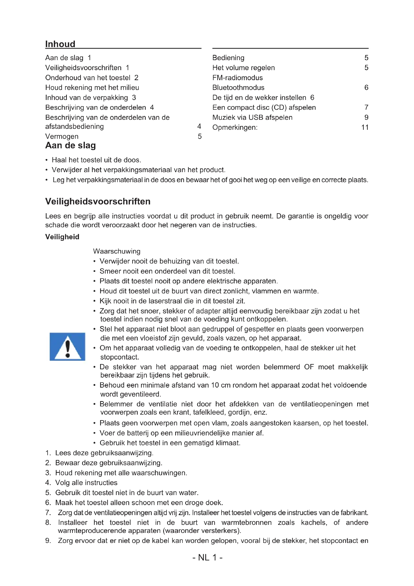 Aan de slag 1 Veiligheidsvoorschriften 1 Onderhoud van het toestel 2 Houd rekening met het milieu 2 Inhoud van de verpakking 3 Beschrijving van de onderdelen 4 Beschrijving van de onderdelen van de afstandsbediening 4 Vermogen 5 Bediening 5 Het volume regelen 5 FM-radiomodus 5 Bluetoothmodus 6 De tijd en de wekker instellen 6 Een compact disc (CD) afspelen 7 Muziek via USB afspelen 9 Opmerkingen: 11 Inhoud- NL 2 - het punt waar de kabel uit het toestel komt.