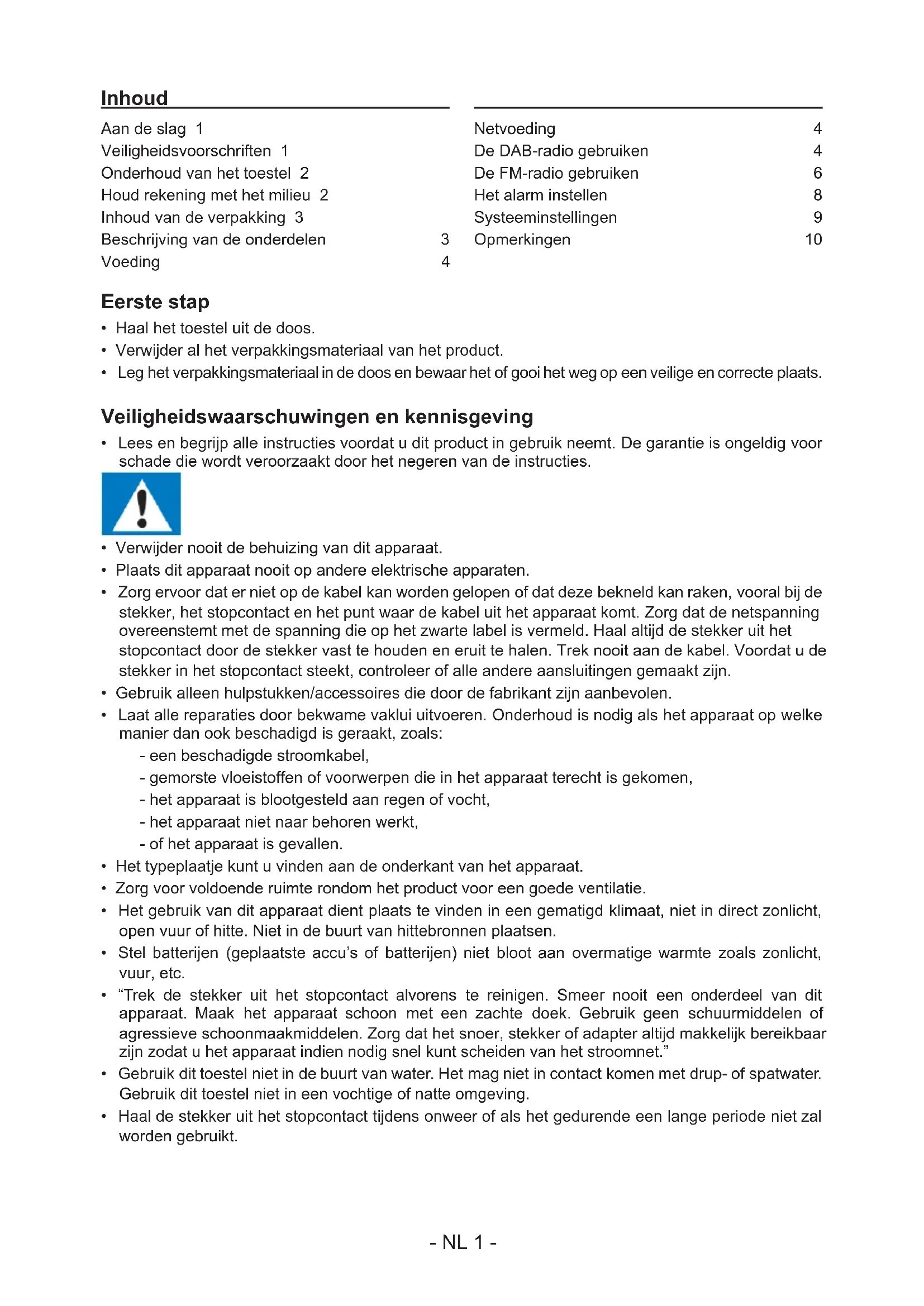 - Haal de stekker uit het stopcontact tijdens onweer of als het gedurende een lange periode niet zal worden gebruikt. Aan de slag 1 Veiligheidsvoorschriften 1 Onderhoud van het toestel 2 Houd rekening met het milieu 2 Inhoud van de verpakking 3 Beschrijving van de onderdelen 3 Voeding 4 Netvoeding 4 De DAB-radio gebruiken 4 De FM-radio gebruiken 6 Het alarm instellen 8 Systeeminstellingen 9 Opmerkingen : 10