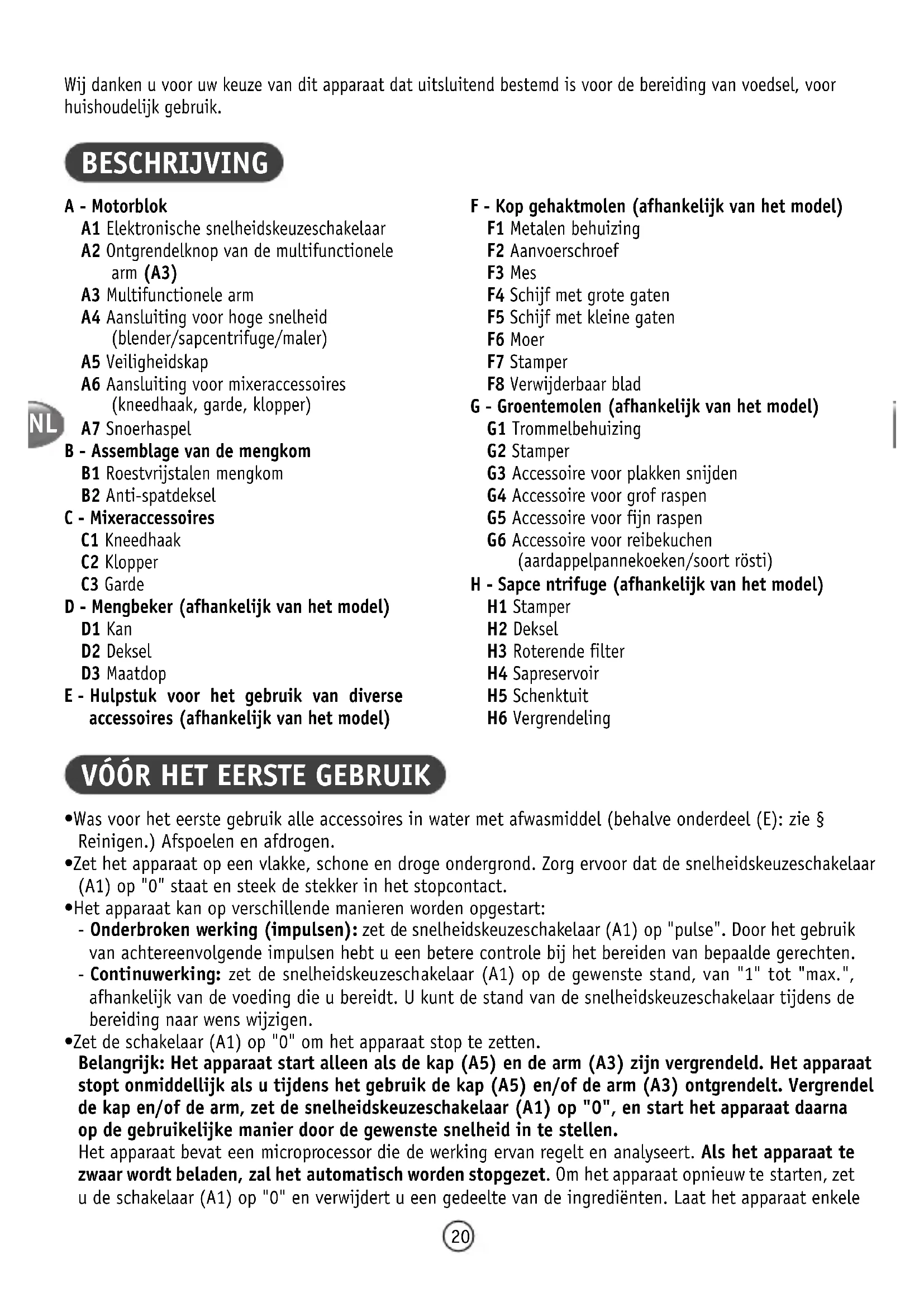 MASTERCHEF-GOURM-8080013820 07/07/14 14:00 Page1920 BESCH RIJVING A - Motorblok A1 Elektronische snelheidskeuzeschakelaar A2 Ontgrendelknop van de multifunctionele arm (A3) A3 Multifunctionele arm A4 Aansluiting voor hoge snelheid (blender/sapcentrifuge/maler) A5 Veiligheidskap A6 Aansluiting voor mixeraccessoires (kneedhaak, garde, klopper) A7 Snoerhaspel B - Assemblage van de mengkom B1 Roestvrijstalen mengkom B2 Anti-spatdeksel C - Mixeraccessoires C1 Kneedhaak C2 Klopper C3 Garde D - Mengbeker (afhankelijk van het model) D1 Kan D2 Deksel D3 Maatdop E - Hulpstuk voor het gebruik van diverse accessoires (afhankelijk van het model) F - Kop gehaktmolen (afhankelijk van het model) F1 Metalen behuizing F2 Aanvoerschroef F3 Mes F4 Schijf met grote gaten F5 Schijf met kleine gaten F6 Moer F7 Stamper F8 Verwijderbaar blad G - Groentemolen (afhankelijk van het model) G1 Trommelbehuizing G2 Stamper G3 Accessoire voor plakken snijden G4 Accessoire voor grof raspen G5 Accessoire voor fijn raspen G6 Accessoire voor reibekuchen (aardappelpannekoeken/soort rösti) H - Sapce ntrifuge (afhankelijk van het model) H1 Stamper H2 Deksel H3 Roterende filter H4 Sapreservoir H5 Schenktuit H6 Vergrendeling