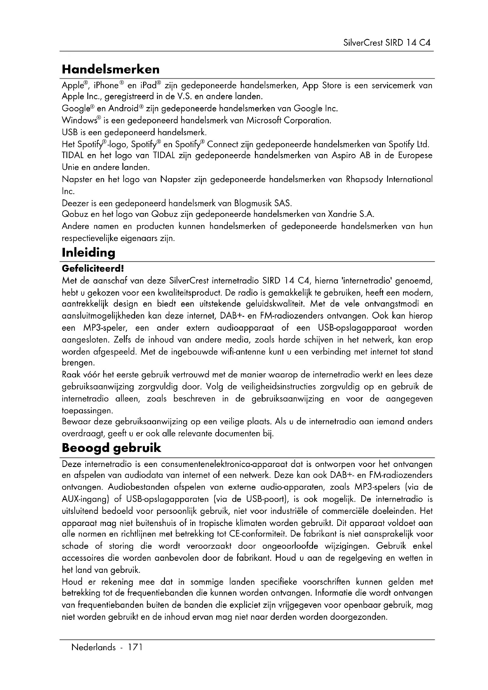 Connect zijn gedeponeerde handelsmerken van Spotify Ltd. TIDAL en het logo van TIDAL zijn gedeponeerde handelsmerken van Aspiro AB in de Europese Unie en andere landen. Napster en het logo van Napster zijn gedeponeerde handelsmerken van Rhapsody International Inc. Deezer is een gedeponeerd handelsmerk van Blogmusik SAS. Qobuz en het logo van Qobuz zijn gedeponeerde handelsmerken van Xandrie S.A. Andere namen en producten kunnen handelsmerken of gedeponeerde handelsmerken van hun respectievelijke eigenaars zijn. Inleiding Gefeliciteerd! Met de aanschaf van deze SilverCrest internetradio SIRD 14 C4, hierna 'internetradio' genoemd, hebt u gekozen voor een kwaliteitsproduct. De radio is gemakkelijk te gebruiken, heeft een modern, aantrekkelijk design en biedt een uitstekende geluidskwaliteit. Met de vele ontvangstmodi en aansluitmogelijkheden kan deze internet, DAB+- en FM-radiozenders ontvangen. Ook kan hierop een MP3-speler, een ander extern audioapparaat of een USB-opslagapparaat worden aangesloten. Zelfs de inhoud van andere media, zoals harde schijven in het netwerk, kan erop worden afgespeeld. Met de ingebouwde wifi-antenne kunt u een verbinding met internet tot stand brengen. Raak vóór het eerste gebruik vertrouwd met de manier waarop de internetradio werkt en lees deze gebruiksaanwijzing zorgvuldig door. Volg de veiligheidsinstructies zorgvuldig op en gebruik de internetradio alleen, zoals beschreven in de gebruiksaanwijzing en voor de aangegeven toepassingen. Bewaar deze gebruiksaanwijzing op een veilige plaats. Als u de internetradio aan iemand anders overdraagt, geeft u er ook alle relevante documenten bij. Beoogd gebruik Deze internetradio is een consumentenelektronica-apparaat dat is ontworpen voor het ontvangen en afspelen van audiodata van internet of een netwerk. Deze kan ook DAB+- en FM-radiozenders ontvangen. Audiobestanden afspelen van externe audio-apparaten, zoals MP3-spelers (via de AUX-ingang) of USB-opslagapparaten (via de USB-poort), is ook mogelijk. De internetradio is uitsluitend bedoeld voor persoonlijk gebruik, niet voor industriële of commerciële doeleinden. Het apparaat mag niet buitenshuis of in tropische klimaten worden gebruikt. Dit apparaat voldoet aan alle normen en richtlijnen met betrekking tot CE-conformiteit. De fabrikant is niet aansprakelijk voor schade of storing die wordt veroorzaakt door ongeoorloofde wijzigingen. Gebruik enkel accessoires die worden aanbevolen door de fabrikant. Houd u aan de regelgeving en wetten in het land van gebruik. Houd er rekening mee dat in sommige landen specifieke voorschriften kunnen gelden met betrekking tot de frequentiebanden die kunnen worden ontvangen. Informatie die wordt ontvangen van frequentiebanden buiten de banden die expliciet zijn vrijgegeven voor openbaar gebruik, mag niet worden gebruikt en de inhoud ervan mag niet naar derden worden doorgezonden.SilverCrest SIRD 14 C4