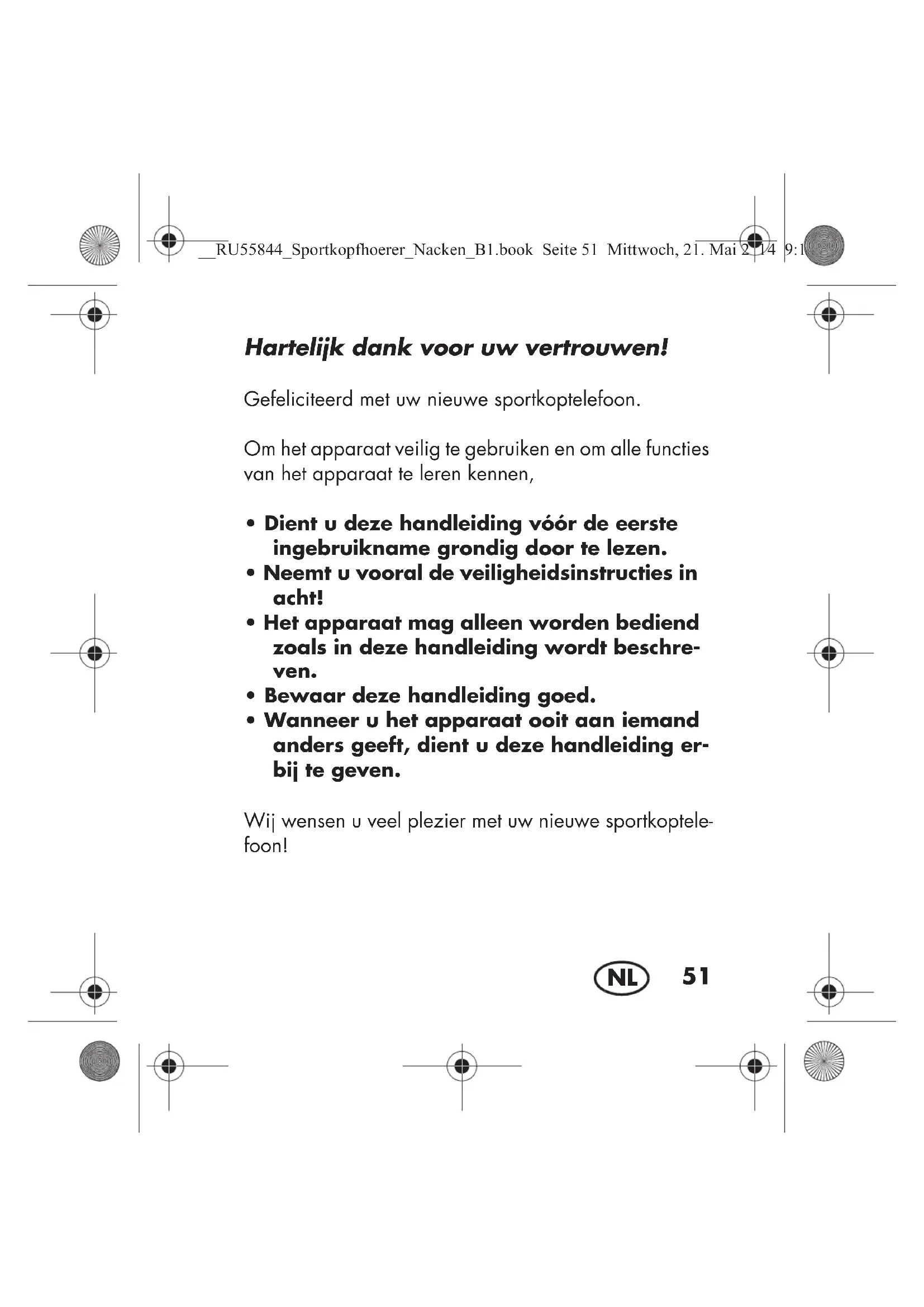 - Wanneer u het apparaat ooit aan iemand anders geeft, dient u deze handleiding er- bij te geven. Wij wensen u veel plezier met uw nieuwe sportkoptele- foon! __RU55844_Sportkopfhoerer_Nacken_B1.book Seite 51 Mittwoch, 21. Mai 2014 9:10 0952