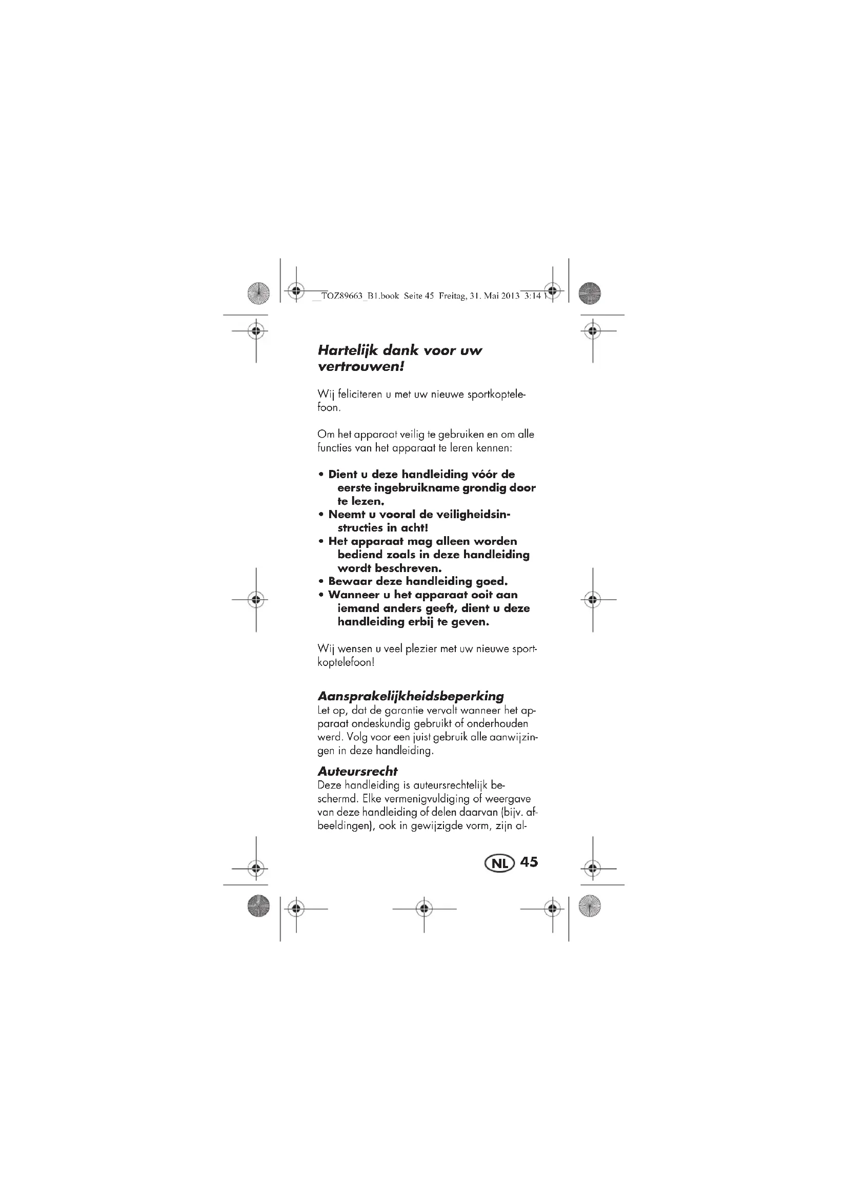 - Wanneer u het apparaat ooit aan iemand anders geeft, dient u deze handleiding erbij te geven. Wij wensen u veel plezier met uw nieuwe sport- koptelefoon! Aansprakelijkheidsbeperking Let op, dat de garantie vervalt wanneer het ap- paraat ondeskundig gebruikt of onderhouden werd. Volg voor een juist gebruik alle aanwijzin- gen in deze handleiding. Auteursrecht Deze handleiding is auteursrechtelijk be- schermd. Elke vermenigvuldiging of weergave van deze handleiding of delen daarvan (bijv. af- beeldingen), ook in gewijzigde vorm, zijn al- __TOZ89663_B1.book Seite 45 Freitag, 31. Mai 2013 3:14 1546