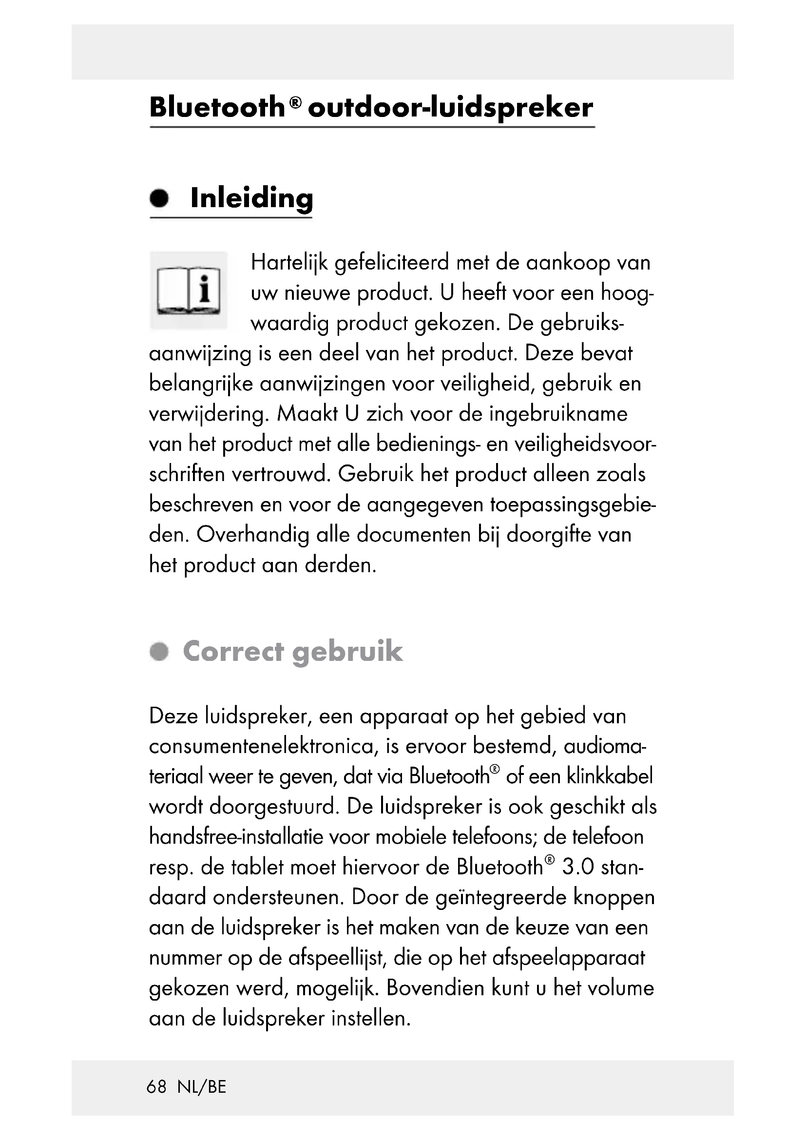 outdoor-luidspreker Inleiding Hartelijk gefeliciteerd met de aankoop van uw nieuwe product. U heeft voor een hoog- waardig product gekozen. De gebruiks- aanwijzing is een deel van het product. Deze bevat belangrijke aanwijzingen voor veiligheid, gebruik en verwijdering. Maakt U zich voor de ingebruikname van het product met alle bedienings- en veiligheidsvoor- schriften vertrouwd. Gebruik het product alleen zoals beschreven en voor de aangegeven toepassingsgebie- den. Overhandig alle documenten bij doorgifte van het product aan derden. Correct gebruik Deze luidspreker, een apparaat op het gebied van consumentenelektronica, is ervoor bestemd, audioma- teriaal weer te geven, dat via Bluetooth