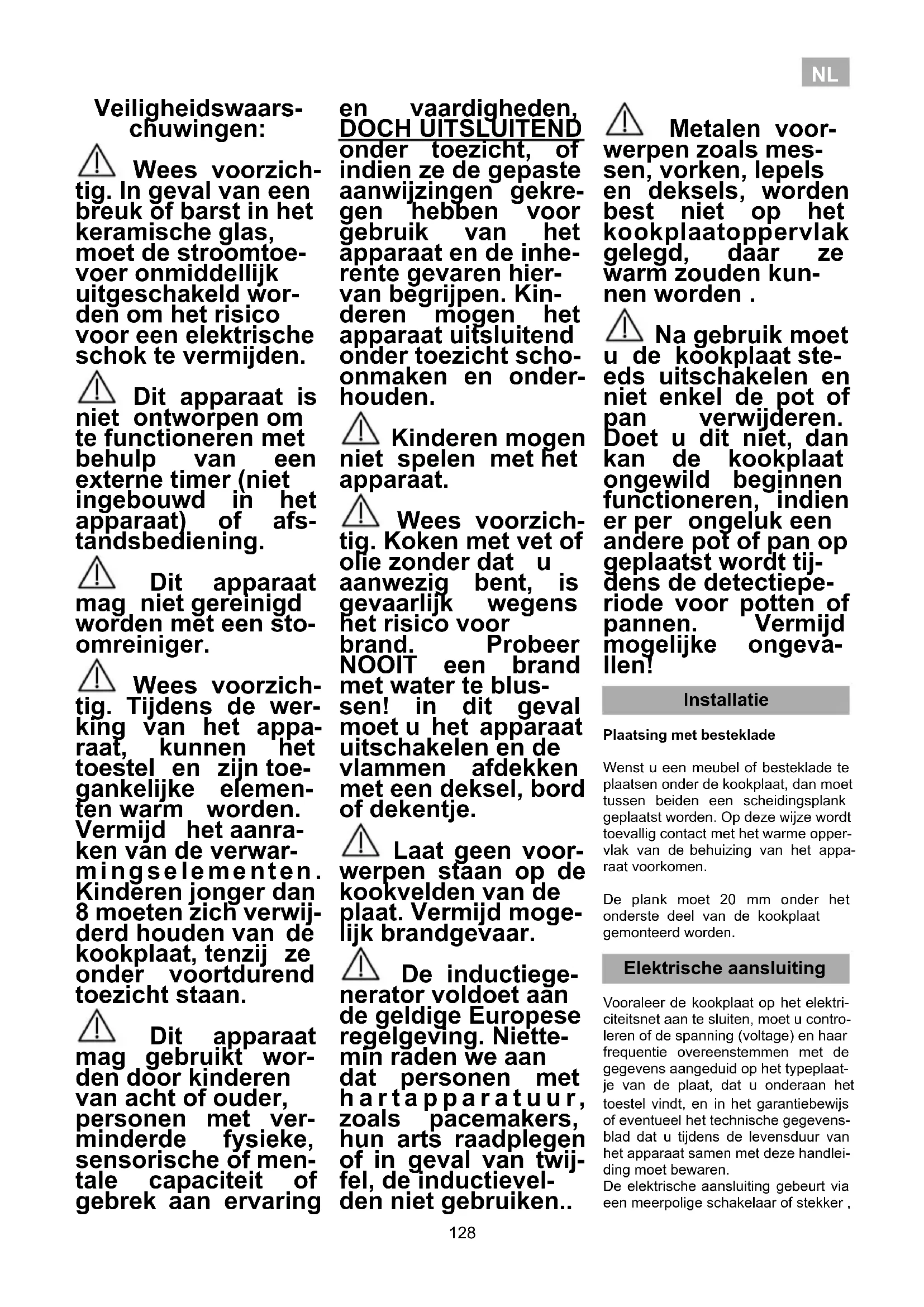 10 o 5 min.*Modelli con funzione FondueModelli senza funzione Fondue* In base al modello 126IT Un recipiente può attaccarsi al vetro per la presenza di materiale fuso fra le due superfici. Non cercare di staccare il recipiente a freddo! Potrebbe rompersi il vetro ceramico. Non calpestare il vetro né appoggiarsi su di esso: potrebbe rompersi e provocare lesioni. Non usare il vetro per appoggiare degli oggetti. TEKA INDUSTRIAL S.A. si riserva il diritto di apporre nei suoi manuali le modifiche che ritenga necessarie o uti- li senza comprometterne le caratteris- tiche essenziali. Osservazioni ambientali Il simbolo sul prodotto o sull'imballaggio indica che questo prodotto non può essere smaltito come un normale rifiuto urbano. Deve essere conferito presso un punto di raccolta di apparecchiature elettriche ed elettroniche per essere riciclato. Accertarsi che questo pro- dotto venga smaltito correttamente contribuirà a evitare alcune possibi- li conseguenze nefaste per l'am- biente e la salute pubblica, che potrebbero invece verificarsi se il prodotto non è gestito in maniera adeguata. Per ottenere informazioni più dettagliate sul riciclo di questo prodotto, rivolgersi all'amministra- zione cittadina, all'azienda che ges- tisce la raccolta dei rifiuti o al nego- zio in cui è stato acquistato il pro- dotto. I materiali d'imballaggio sono ecolo- gici e totalmente riciclabili. I compo- nenti in plastica sono identificati con le marcature >PE<, >LD<, >EPS<, ecc. Smaltire i materiali d'imballaggio come residui domes- tici nel contenitore corrispondente messo a disposizione dal comune di residenza. Adempimento con Efficienza Energetica dell'apparecchio: -Apparecchio è stato testato secondo la norma EN 60350-2 e il valore ottenuto, in Wh/Kg, è disponibile nella targa dati dell'apparecchio. Se qualcosa non funziona Prima di chiamare il Servizio tecnico, svolgere le verifiche indicate qui di seguito. Non funziona la cucina: Controllare che il cavo di rete sia colle- gato alla presa corrispondente. Le zone ad induzione non riscalda- no: Il recipiente è inadatto (non ha il fondo ferromagnetico o è troppo piccolo). Verificare che il fondo del recipiente venga attratto da una calamita o usare un recipiente più grande. Si sente un ronzio all'inizio della cottura proveniente dalle zone a induzione: In recipienti poco spessi o costituiti da più di un pezzo, il ronzio è conseguen- za della trasmissione d'energia diretta- mente al fondo del recipiente. Tale ron- zio non segnala un difetto, ma, se si vuole comunque evitarlo, ridurre leg- germente il livello di potenza scelto o utilizzare un recipiente con il fondo più spesso e/o costituito da una sola parte. Il controllo tattile non si accende o è acceso ma non risponde: Non è stata selezionata nessuna pias- tra. Assicurarsi di selezionare una piastra prima di agirci sopra. Sui sensori è presente dell'umidità e/o si hanno le dita umide. Mantenere asciutta e pulita la superficie del con- trollo tattile e/o le dita. Il bloccaggio è attivato. Disattivare il bloccaggio. Si sente un rumore di ventilazione durante la cottura, che continua anche a cucina spenta: Le zone a induzione presentano un ventilatore per refrigerare l'elettronica. Questo entra in funzione solo quando la temperatura dell'elettronica è eleva- ta,quando cala o si spegne automati- camente, che la cucina sia accesa oppure no. Sull'indicatore di potenza di una piastra appare il simbolo : Il sistema di induzione non riscontra un recipiente sulla piastra o questo è inadeguato. Si spegne una piastra e sugli indica-tori appare il messaggio C81 o C82: Temperatura eccessiva nel sistema elettronico o sul vetro. Attendere il tempo necessario per far raffreddare il sistema elettronico o rimuovere il reci-piente per far raffreddare il vetro. Sull'indicatore di una delle piastre appare C85: Il recipiente utilizzato non è adeguato. Spegnere la cucina, riaccenderla e provare con un altro recipiente. 127NL Veiligheidswaars- chuwingen: Wees voorzich- tig. In geval van een breuk of barst in het keramische glas, moet de stroomtoe- voer onmiddellijk uitgeschakeld wor- den om het risico voor een elektrische schok te vermijden. Dit apparaat is niet ontworpen om te functioneren met behulp van een externe timer (niet ingebouwd in het apparaat) of afs- tandsbediening. Dit apparaat mag niet gereinigd worden met een sto- omreiniger. Wees voorzich- tig. Tijdens de wer- king van het appa- raat, kunnen het toestel en zijn toe- gankelijke elemen- ten warm worden. Vermijd het aanra- ken van de verwar- m i n g s e l e m e n t e n . Kinderen jonger dan 8 moeten zich verwij- derd houden van de kookplaat, tenzij ze onder voortdurend toezicht staan. Dit apparaat mag gebruikt wor- den door kinderen van acht of ouder, personen met ver- minderde fysieke, sensorische of men- tale capaciteit of gebrek aan ervaring en vaardigheden, DOCH UITSLUITEND onder toezicht, of indien ze de gepaste aanwijzingen gekre- gen hebben voor gebruik van het apparaat en de inhe- rente gevaren hier- van begrijpen. Kin- deren mogen het apparaat uitsluitend onder toezicht scho- onmaken en onder- houden. Kinderen mogen niet spelen met het apparaat. Wees voorzich- tig. Koken met vet of olie zonder dat u aanwezig bent, is gevaarlijk wegens het risico voor brand. Probeer NOOIT een brand met water te blus- sen! in dit geval moet u het apparaat uitschakelen en de vlammen afdekken met een deksel, bord of dekentje. Laat geen voor- werpen staan op de kookvelden van de plaat. Vermijd moge- lijk brandgevaar. De inductiege- nerator voldoet aan de geldige Europese regelgeving. Niette- min raden we aan dat personen met h a r t a p p a r a t u u r , zoals pacemakers, hun arts raadplegen of in geval van twij- fel, de inductievel- den niet gebruiken.. Metalen voor- werpen zoals mes- sen, vorken, lepels en deksels, worden best niet op het kookplaatoppervlak gelegd, daar ze warm zouden kun- nen worden . Na gebruik moet u de kookplaat ste- eds uitschakelen en 