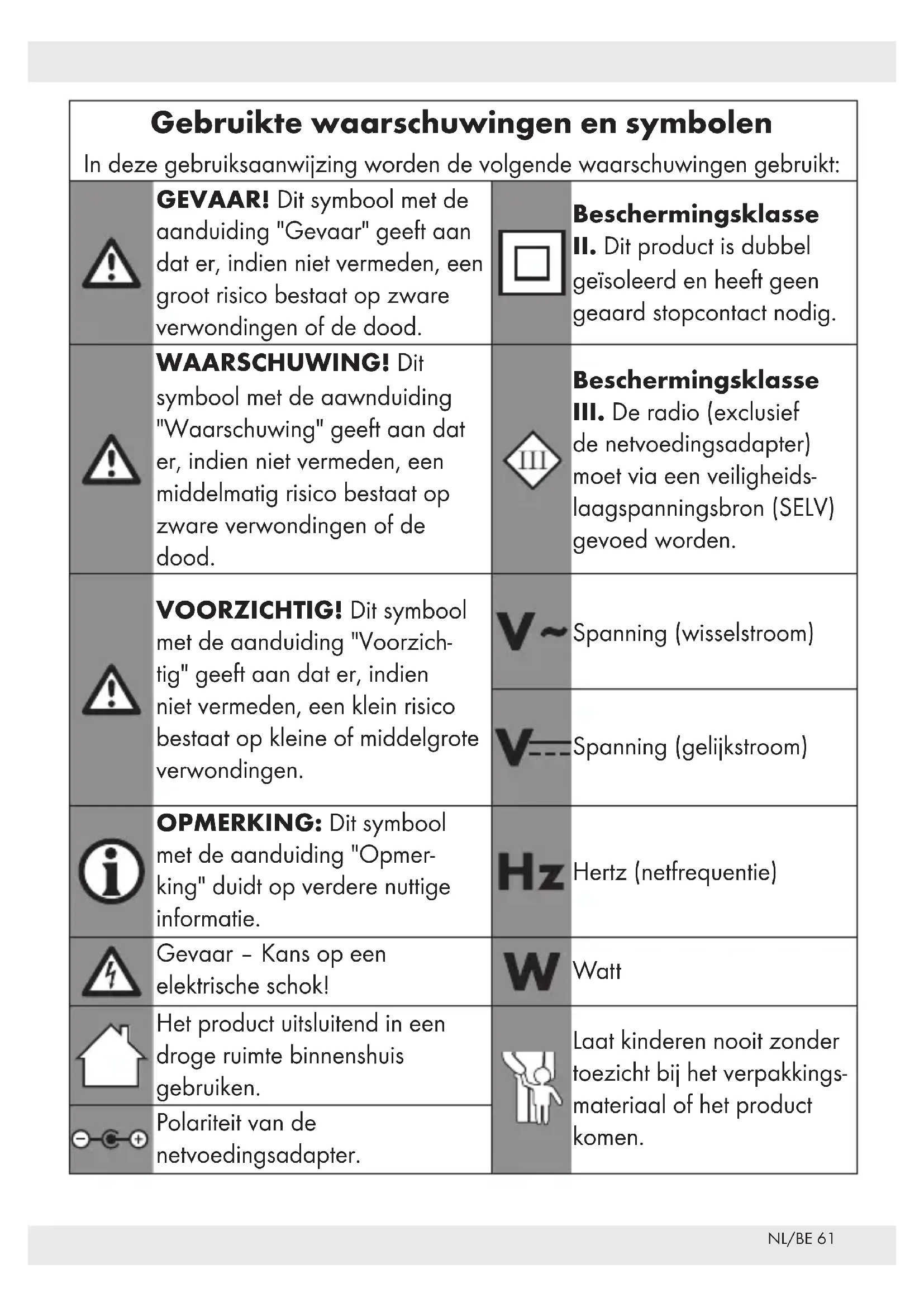 de netvoedingsadapter) moet via een veiligheids- laagspanningsbron (SELV) gevoed worden. VOORZICHTIG! Dit symbool met de aanduiding "Voorzich- tig" geeft aan dat er, indien niet vermeden, een klein risico bestaat op kleine of middelgrote verwondingen. Spanning (wisselstroom) Spanning (gelijkstroom) OPMERKING: Dit symbool met de aanduiding "Opmer- king" duidt op verdere nuttige informatie. Hertz (netfrequentie) Gevaar – Kans op een elektrische schok! Watt Het product uitsluitend in een droge ruimte binnenshuis gebruiken. Laat kinderen nooit zonder toezicht bij het verpakkings- materiaal of het product komen. Polariteit van de netvoedingsadapter.NL/BE62 DIGITALE RADIO Inleiding Hartelijk gefeliciteerd met de aankoop van uw nieuwe product. U heeft voor een hoogwaardig product gekozen. De gebruiksaanwijzing is een deel van het product. Deze bevat belangrijke aanwijzingen voor veiligheid, gebruik en verwijdering. Maakt U zich voor de ingebruikname van het product met alle bedienings- en veiligheidsvoor