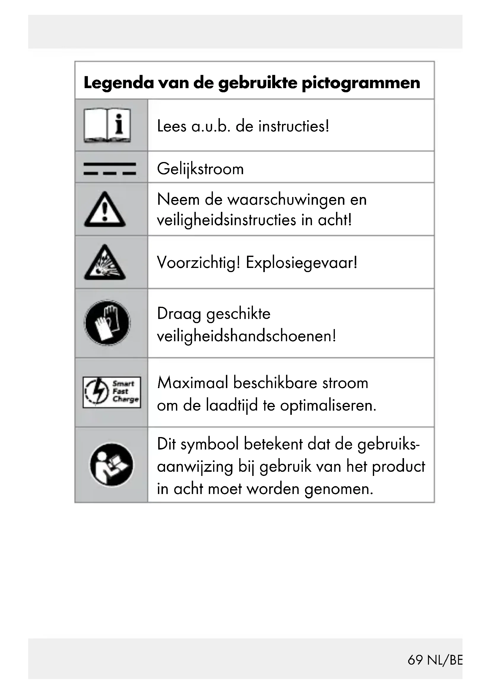 pmerkingen omtrent handelsmerken ... Pagina 73 Omvang van de levering .....................Pagina 73 Voor de ingebruikname .......................Pagina 74 Beschrijving van de onderdelen .......... Pagina 74 Technische gegevens ...........................Pagina 74 Veiligheidsinstructies .............Pagina 75 Bediening en gebruik ............Pagina 79 Powerbank opladen ............................Pagina 79 Laadtoestand controleren .................... Pagina 80 Mobiele apparaten opladen met de powerbank ...................................... Pagina 81 Storingen oplossen ..................Pagina 82 Reiniging en onderhoud ......Pagina 8368 NL/BE Opslag bij niet-gebruik .........Pagina 84 Afvoer .................................................Pagina 85 Informatie over de EU- conformiteitsverklaring .......Pagina 86 Garantie ............................................Pagina 8669 NL/BE Legenda van de gebruikte pictogrammen Lees a.u.b. de instructies! Gelijkstroom Neem de waarschuwingen en veiligheidsinstructies in acht! Voorzichtig! Explosiegevaar! Draag geschikte veiligheidshandschoenen! Maximaal beschikbare stroom om de laadtijd te optimaliseren. Dit symbool betekent dat de gebruiks- aanwijzing bij gebruik van het product in acht moet worden genomen.70 NL/BE Powerbank Inleiding Hartelijk gefeliciteerd met de aankoop van uw nieuwe product. U heeft voor een hoogwaardig product gekozen. De gebruiksaanwijzing is een deel van het product. Deze bevat belangrijke aanwijzingen voor veiligheid, gebruik en verwijdering. Maakt U zich voor de ingebruikname van het product met alle bedienings- en veiligheidsvoorschriften vertrou wd. Gebruik het product alleen zoals beschreven en voor de aangegeven toepassingsgebieden. Overhandig alle documenten bij doorgifte van het product aan derden. Correct gebruik Dit product is een apparaat uit de informatietechniek en is uitsluitend bedoeld voor het opladen van mo- biele apparaten die standaard via een USB-aanslui- ting worden opgeladen. Het product is niet bedoeld voor commercieel gebruik. De fabrikant is niet aan- sprakelijk voor schade die voortvloeit uit ondoelmatig gebruik. Door de toegepaste Smart-Fast-Charge-71 NL/BE Technologie is bij compatibele apparaten een kort- ere laadduur mogelijk. Gebruikte waarschuwingen en symbolen In deze gebruiksaanwijzing worden de volgende waarschuwingen en symbolen gebruikt: GEVAAR Dit symbool duidt in combinatie met de waarschu- wing op een levensbedreigende situatie die, als er geen gehoor wordt gegeven aan de waarschuwing, kan leiden tot ernstig letsel of dodelijke afloop. WAARSCHUWING