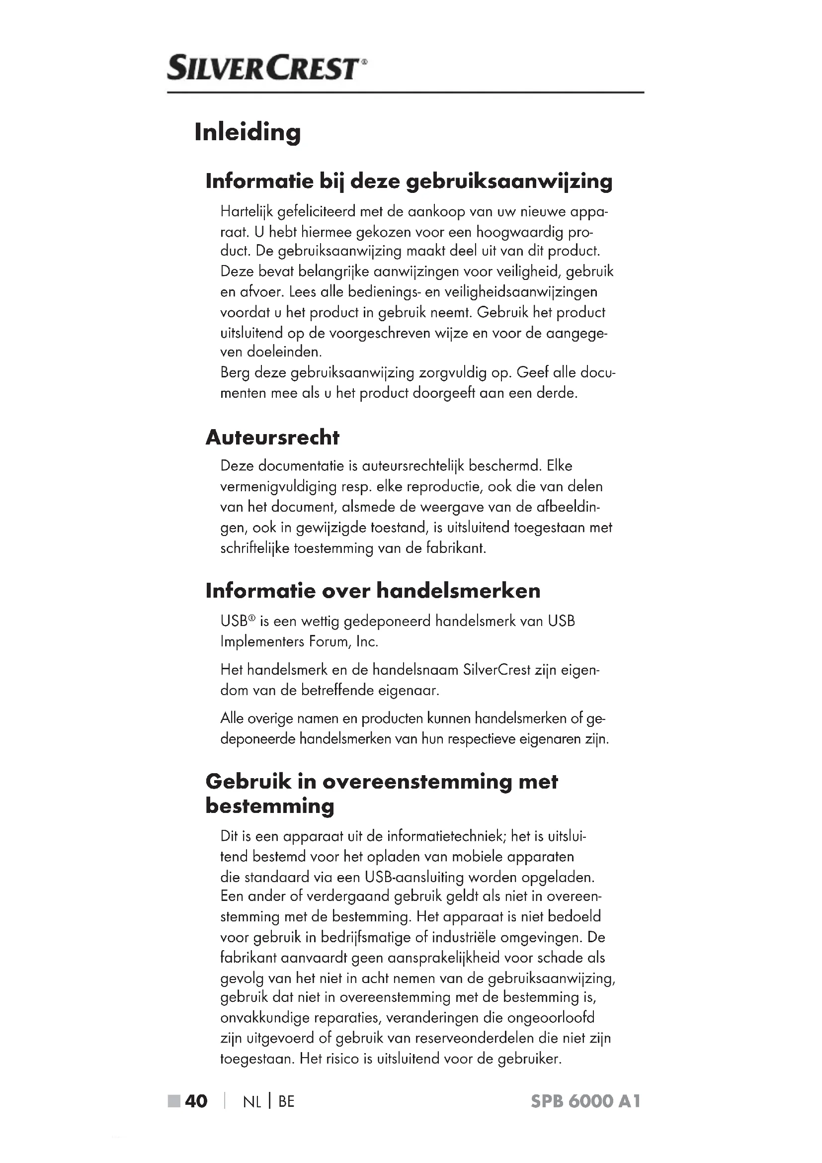 SPB 6000 A1 Inleiding Informatie bij deze gebruiksaanwijzing Hartelijk gefeliciteerd met de aankoop van uw nieuwe appa- raat. U hebt hiermee gekozen voor een hoogwaardig pro- duct. De gebruiksaanwijzing maakt deel uit van dit product. Deze bevat belangrijke aanwijzingen voor veiligheid, gebruik en afvoer. Lees alle bedienings- en veiligheidsaanwijzingen voordat u het product in gebruik neemt. Gebruik het product uitsluitend op de voorgeschreven wijze en voor de aangege- ven doeleinden. Berg deze gebruiksaanwijzing zorgvuldig op. Geef alle docu- menten mee als u het product doorgeeft aan een derde. Auteursrecht Deze documentatie is auteursrechtelijk beschermd. Elke vermenigvuldiging resp. elke reproductie, ook die van delen van het document, alsmede de weergave van de afbeeldin- gen, ook in gewijzigde toestand, is uitsluitend toegestaan met schriftelijke toestemming van de fabrikant. Informatie over handelsmerken USB
