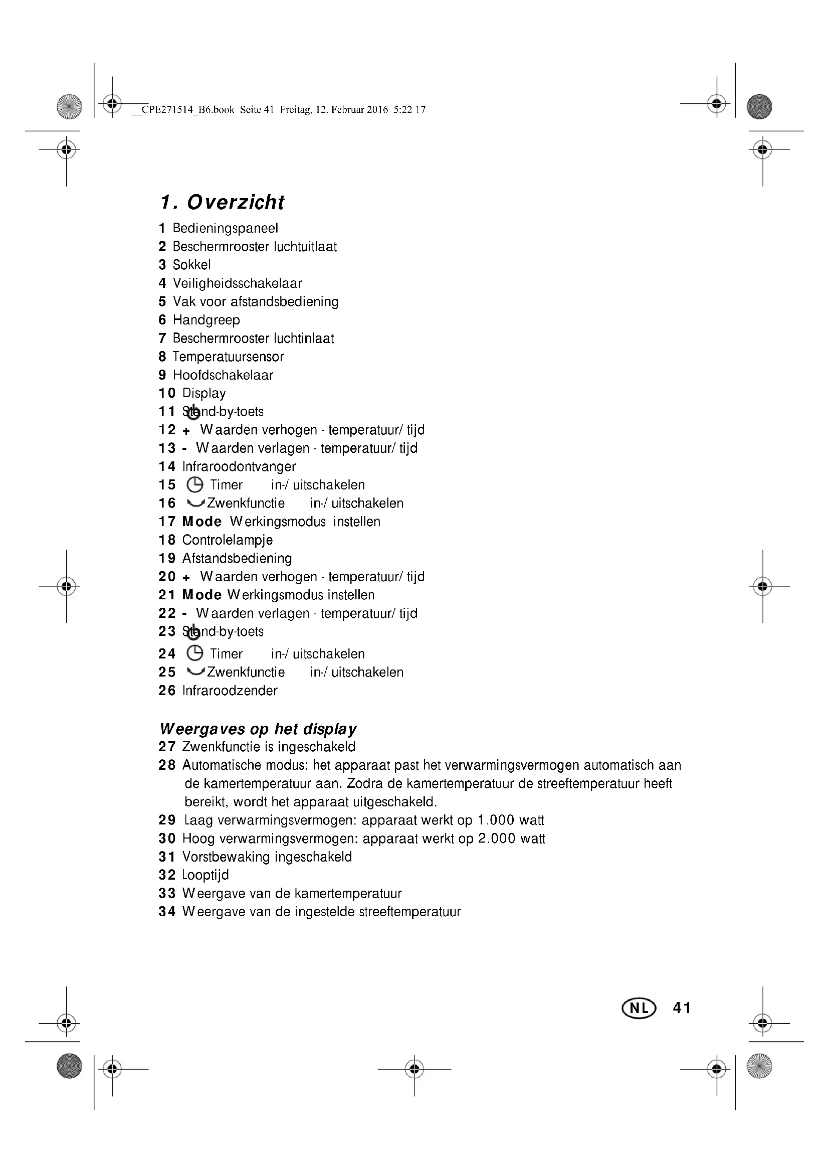 23 Stand-by-toets 24 Timer in-/uitschakelen 25 Zwenkfunctie in-/uitschakelen 26 Infraroodzender Weergaves op het display 27 Zwenkfunctie is ingeschakeld 28 Automatische modus: het apparaat past het verwarmingsvermogen automatisch aan de kamertemperatuur aan. Zodra de kamertemperatuur de streeftemperatuur heeft bereikt, wordt het apparaat uitgeschakeld. 29 Laag verwarmingsvermogen: apparaat werkt op 1.000 watt 30 Hoog verwarmingsvermogen: apparaat werkt op 2.000 watt 31 Vorstbewaking ingeschakeld 32 Looptijd 33 Weergave van de kamertemperatuur 34 Weergave van de ingestelde streeftemperatuur