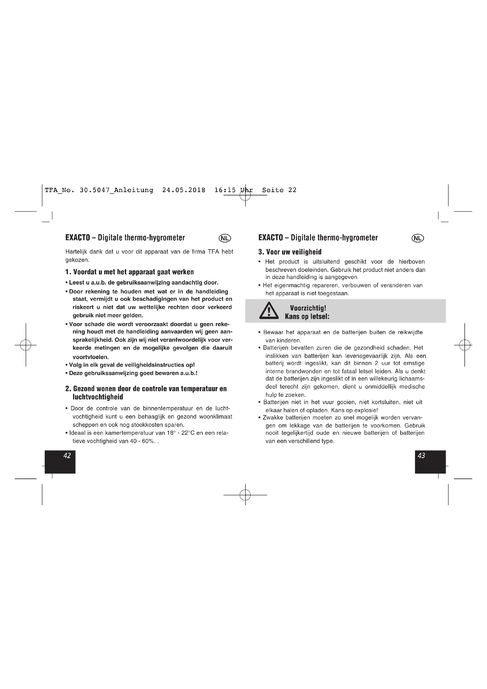 - Zwakke batterijen moeten zo snel mogelijk worden vervan- gen om lekkage van de batterijen te voorkomen. Gebruik nooit tegelijkertijd oude en nieuwe batterijen of batterijen van een verschillend type. TFA_No. 30.5047_Anleitung 24.05.2018 16:15 Uhr Seite 224544 EXACTO – Digitale thermo-hygrometer