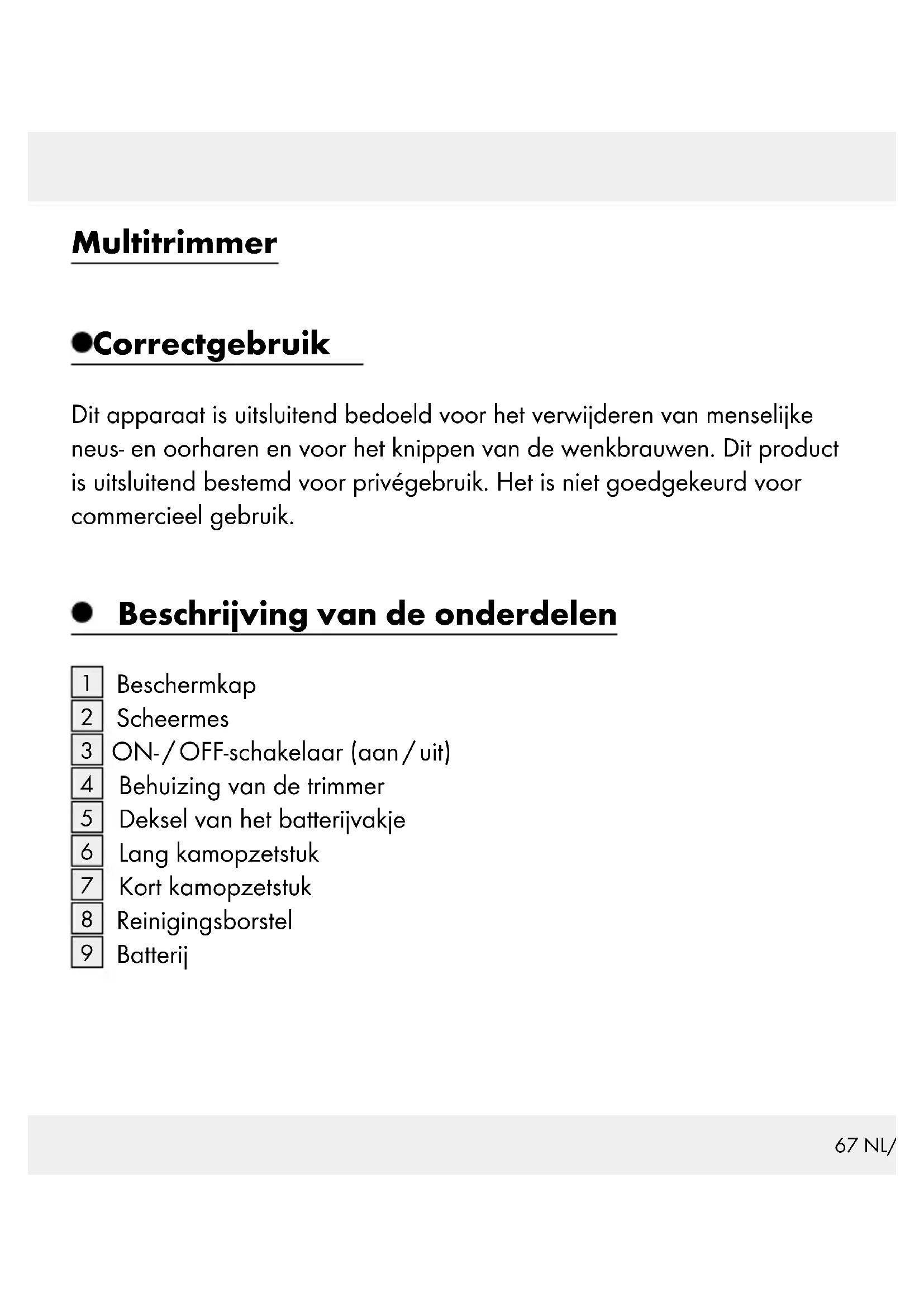 Gebruik de meegele- verde borstel indien er haren tussen de mes- sen zitten. Verwijdering De verpakking bestaat uit milieuvriendelijke grondstoffen die u via de plaatselijke recyclingcontainers kunt afvoeren. Informatie over de mogelijkheden om het uitgediende product te verwijderen, verstrekt uw gemeentelijke overheid.76 NL/BE Gooi het afgedankte product omwille van het milieu niet weg via het huisvuil, maar geef het af bij het daarvoor bestemde depot of het gemeentelijke milieupark. Over afgifteplaatsen en hun openingstijden kunt u zich bij uw aangewezen instantie informeren. Defecte of verbruikte batterijen moeten volgens de richtlijn 2006 / 66 / EG worden gerecycled. Geef batterijen en / of het apparaat af bij de daarvoor bestemde verzamelstations. Milieuschade door het foutief verwijderen van batterijen! Batterijen mogen niet via het huisvuil worden weggegooid. Ze kunnen giftig zwaar metaal bevatten en vallen onder het chemisch afval. De chemische symbolen van de zware metalen zijn als volgt: Cd = cadmium, Hg = kwik, Pb = lood. Geef verbruikte batterijen daarom af bij een gemeentelijk inza- melpunt.77 NL/BE Informatie Conformiteitsverklaring Wij, OWIM GmbH & Co. KG, Stiftsbergstraße 1, D-74167 Neckarsulm, verklaren alleen verantwoordelijk te zijn, dat het product Multitrimmer, modelnr.: Z31635, versie: 08 / 2015, waarvoor deze verklaring geldt, voldoet aan de normen / normatieve documenten van 2006 / 42 / EC, 2004 / 108 / EC, 2011 / 65 / EU. Toegepaste normen: EN 60335-1:2012 EN 60335-2-8 / A2:2008 EN 62233:2008 EN ISO 12100:2010 EN 50581:2012 EN 55014-1 / A2:2011 EN 55014-2 / A2:2008 Tobias Koenig Afdelingsmanager Neckarsulm, 10 Apr 201578 NL/BE De complete conformiteitsverklaring kunt u indien gewenst nalezen via www.owim.com. Garantie Het apparaat wordt volgens strenge kwaliteitsrichtlijnen zorgvuldig gepro- duceerd en voor levering grondig getest. In geval van schade aan het pro- duct kunt u rechtmatig beroep doen op de verkoper van het product. Deze wettelijke rechten worden door onze hierna vermelde garantie niet beperkt. U ontvangt op dit apparaat 3 jaar garantie vanaf de aankoopdatum. De garantieperiode start op de dag van aankoop. Bewaar de originele kassa- bon alstublieft. Dit document is nodig als bewijs voor aankoop. Wanneer binnen 3 jaar na de aankoopdatum van dit product een materiaal- of productiefout optreedt, dan wordt het product door ons – naar onze keuze – gratis voor u gerepareerd of vervangen. Deze garantie komt te vervallen als het product beschadigd wordt, niet correct gebruikt of onder- houden wordt. De garantie geldt voor materiaal- en productiefoute n. Deze garantie is niet van toepassing op productonderdelen, die onderhevig zijn aan normale slijtage en hierdoor als aan slijtage onderhevige onderdelen gelden (bijv. batterijen) of voor beschadigingen aan breekbare onderdelen, zoals bijv. schakelaars, accu’s of dergelijke onderdelen, die gemaakt zijn van glas.79 NL/BE80 DE/AT/CH Bestimmungsgemäße Verwendung .................... Seite 81 Teilebeschreibung ...............................................................Seite 81 Technische Daten .................................................................Seite 82 Lieferumfang ........................................................................... Seite 82 Sicherheitshinweise ...........................................................Seite 82 Sicherheitshinweise für Batterien ...................................................Seite 84 Inbetriebnahme Batterie einsetzen / auswechseln ..................................................Seite 86 Nasen- und Ohrhärchen entfernen ...............................................Seite 86 Augenbrauen schneiden ................................................................Seite 87 Reinigung, Pflege, Aufbewahrung.......................Seite 88 Fehler beheben .....................................................................Seite 89 Entsorgung ................................................................................Seite 90 Information Konformitätserklärung ....................................................................Seite 91 Garantie ...................................................................................... Seite 9281 DE/AT/CH Multitrimmer Bestimmungsgemäße Verwendung Dieses Gerät ist ausschließlich zum Entfernen von menschlichen Nasen- und Ohrhärchen und zum schneiden der Augenbrauen vorgesehen. Das Gerät ist ausschließlich für den privaten Gebrauch bestimmt. Es ist nicht für gewerbliche Zwecke zugelassen. Teilebeschreibung