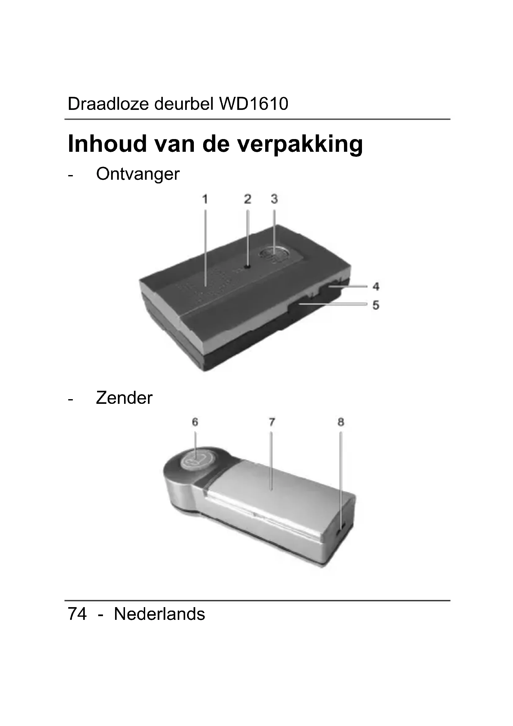 polariteit (+ en -). De polariteit staat aangegeven op de batterijen en in het batterijvak. - Schuif het klepje van het batterijvak weer op de behuizing. Batterij voor de zender - Open de behuizing van de zender met een platte schroevendraaier. Steek de schroevendraaier voorzichtig in de zijkant van de behuizing en druk de vergrendeling zachtjes naar binnen deze te ontgrendelen (8). Trek de bovenkant van de behuizing omhoog. - Plaats de meegeleverde A23-batterij van 12 V in het bovenste deel van de behuizing. De juiste polariteit staat aangegeven op de batterij en in de behuizing. - Plaats de bovenkant terug op de onderkant van de zender.Draadloze deurbel WD1610 Nederlands - 87 U hoeft de bovenkant niet terug te plaatsen op de onderkant als u de zender op de muur wilt bevestigen. De apparaten bevestigen Het pakket bevat alles wat u nodig hebt om beide apparaten te bevestigen. U kunt de ontvanger ook neerzetten en los gebruiken. Zorg dat de afstand tussen de zender en de ontvanger niet groter is dan het maximale bereik. Test zo nodig de werking voordat u de apparaten op hun plaats bevestigt. De zender bevestigen Zoek een geschikte plaats waar u de zender wilt bevestigen. - Open de behuizing van de zender door een platte schroevendraaier in de inkeping op de zijkant te steken. Druk de vergrendelingDraadloze deurbel WD1610