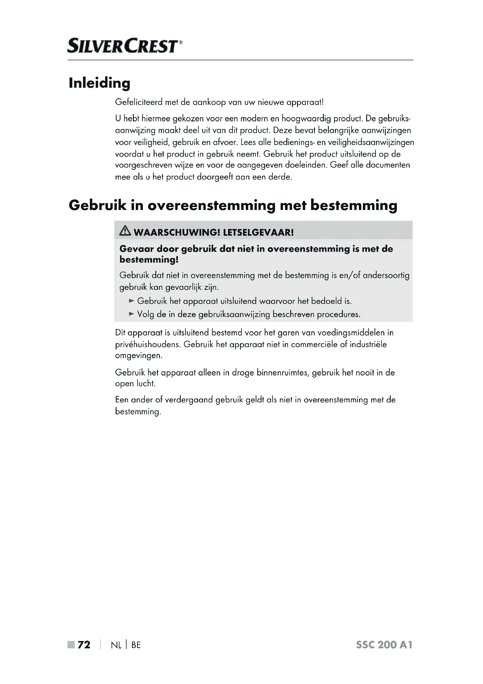 SSC 200 A1 Inleiding Gefeliciteerd met de aankoop van uw nieuwe apparaat! U hebt hiermee gekozen voor een modern en hoogwaardig product. De gebruiks- aanwijzing maakt deel uit van dit product. Deze bevat belangrijke aanwijzingen voor veiligheid, gebruik en afvoer. Lees alle bedienings- en veiligheidsaanwijzingen voordat u het product in gebruik neemt. Gebruik het product uitsluitend op de voorgeschreven wijze en voor de aangegeven doeleinden. Geef alle documenten mee als u het product doorgeeft aan een derde. Gebruik in overeenstemming met bestemming WAARSCHUWING! LETSELGEVAAR! Gevaar door gebruik dat niet in overeenstemming is met de bestemming! Gebruik dat niet in overeenstemming met de bestemming is en/of andersoortig gebruik kan gevaarlijk zijn. ► Gebruik het apparaat uitsluitend waarvoor het bedoeld is. ► Volg de in deze gebruiksaanwijzing beschreven procedures. Dit apparaat is uitsluitend bestemd voor het garen van voedingsmiddelen in privéhuishoudens. Gebruik het apparaat niet in commerciële of industriële omgevingen. Gebruik het apparaat alleen in droge binnenruimtes, gebruik het nooit in de open lucht. Een ander of verdergaand gebruik geldt als niet in overeenstemming met de bestemming. IB_336973_SSC200A1_LB8.indb 72 07.07.2020 10:47:24NL