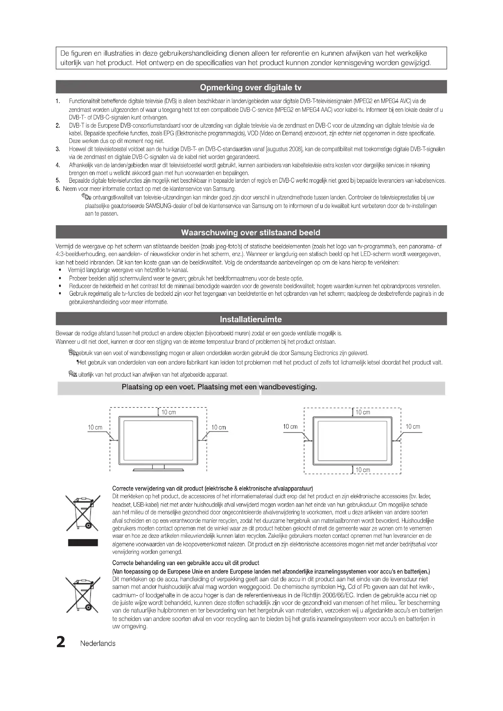 Wandhalterung 54 Warm 19 Weißabgleich 18 Wiederholungsmodus 43 [UC6800]BN68-02842B-00L04.indb 62 2010-03-08 오후 8:53:4863 Deutsch 05 Weitere Informationen This page is intentionally left blank. [UC6800]BN68-02842B-00L04.indb 63 2010-03-08 오후 8:53:482 Nederlands De figuren en illustraties in deze gebruikershandleiding dienen alleen ter referentie en kunnen afwijken van het werkelijke uiterlijk van het product. Het ontwerp en de specificaties van het product kunnen zonder kennisgeving worden gewijzigd. Opmerking over digitale tv 1. Functionaliteit betreffende digitale televisie (DVB) is alleen beschikbaar in landen/gebieden waar digitale DVB-T-televisiesignalen (MPEG2 en MPEG4 AVC) via de zendmast worden uitgezonden of waar u toegang hebt tot een compatibele DVB-C-service (MPEG2 en MPEG4 AAC) voor kabel-tv. Informeer bij een lokale dealer of u DVB-T- of DVB-C-signalen kunt ontvangen. 2. DVB-T is de Europese DVB-consortiumstandaard voor de uitzending van digitale televisie via de zendmast en DVB-C voor de uitzending van digitale televisie via de kabel. Bepaalde specifieke functies, zoals EPG (Elektronische programmagids), VOD (Video on Demand) enzovoort, zijn echter niet opgenomen in deze specificatie. Deze werken dus op dit moment nog niet. 3. Hoewel dit televisietoestel voldoet aan de huidige DVB-T- en DVB-C-standaarden vanaf [augustus 2008], kan de compatibiliteit met toekomstige digitale DVB-T-signalen via de zendmast en digitale DVB-C-signalen via de kabel niet worden gegarandeerd. 4. Afhankelijk van de landen/gebieden waar dit televisietoestel wordt gebruikt, kunnen aanbieders van kabeltelevisie extra kosten voor dergelijke services in rekening brengen en moet u wellicht akkoord gaan met hun voorwaarden en bepalingen.