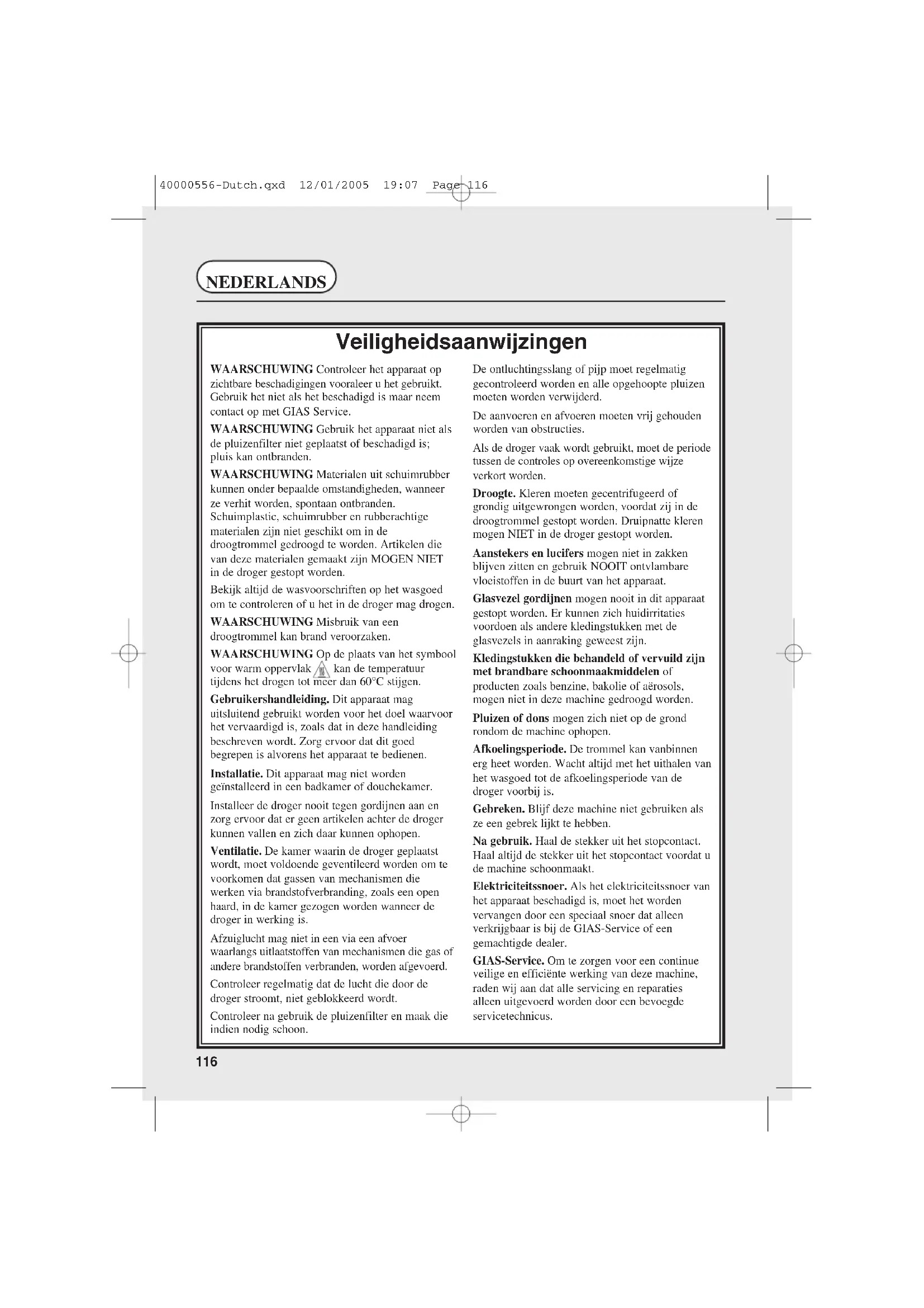 Veiligheidsaanwijzingen WAARSCHUWING Controleer het apparaat op zichtbare beschadigingen vooraleer u het gebruikt. Gebruik het niet als het beschadigd is maar neem contact op met GIAS Service. WAARSCHUWING Gebruik het apparaat niet als de pluizenfilter niet geplaatst of beschadigd is; pluis kan ontbranden. WAARSCHUWING Materialen uit schuimrubber kunnen onder bepaalde omstandigheden, wanneer ze verhit worden, spontaan ontbranden. Schuimplastic, schuimrubber en rubberachtige materialen zijn niet geschikt om in de droogtrommel gedroogd te worden. Artikelen die van deze materialen gemaakt zijn MOGEN NIET in de droger gestopt worden. Bekijk altijd de wasvoorschriften op het wasgoed om te controleren of u het in de droger mag drogen. WAARSCHUWING Misbruik van een droogtrommel kan brand veroorzaken. WAARSCHUWING Op de plaats van het symbool voor warm oppervlak kan de temperatuur tijdens het drogen tot meer dan 60°C stijgen. Gebruikershandleiding. Dit apparaat mag uitsluitend gebruikt worden voor het doel waarvoor het vervaardigd is, zoals dat in deze handleiding beschreven wordt. Zorg ervoor dat dit goed begrepen is alvorens het apparaat te bedienen. Installatie. Dit apparaat mag niet worden geïnstalleerd in een badkamer of douchekamer. Installeer de droger nooit tegen gordijnen aan en zorg ervoor dat er geen artikelen achter de droger kunnen vallen en zich daar kunnen ophopen. Ventilatie. De kamer waarin de droger geplaatst wordt, moet voldoende geventileerd worden om te voorkomen dat gassen van mechanismen die werken via brandstofverbranding, zoals een open haard, in de kamer gezogen worden wanneer de droger in werking is. Afzuiglucht mag niet in een via een afvoer waarlangs uitlaatstoffen van mechanismen die gas of andere brandstoffen verbranden, worden afgevoerd. Controleer regelmatig dat de lucht die door de droger stroomt, niet geblokkeerd wordt. Controleer na gebruik de pluizenfilter en maak die indien nodig schoon. De ontluchtingsslang of pijp moet regelmatig gecontroleerd worden en alle opgehoopte pluizen moeten worden verwijderd. De aanvoeren en afvoeren moeten vrij gehouden worden van obstructies. Als de droger vaak wordt gebruikt, moet de periode tussen de controles op overeenkomstige wijze verkort worden. Droogte. Kleren moeten gecentrifugeerd of grondig uitgewrongen worden, voordat zij in de droogtrommel gestopt worden. Druipnatte kleren mogen NIET in de droger gestopt worden. Aanstekers en lucifers mogen niet in zakken blijven zitten en gebruik NOOIT ontvlambare vloeistoffen in de buurt van het apparaat. Glasvezel gordijnen mogen nooit in dit apparaat gestopt worden. Er kunnen zich huidirritaties voordoen als andere kledingstukken met de glasvezels in aanraking geweest zijn. Kledingstukken die behandeld of vervuild zijn met brandbare schoonmaakmiddelen of producten zoals benzine, bakolie of aërosols, mogen niet in deze machine gedroogd worden. Pluizen of dons mogen zich niet op de grond rondom de machine ophopen. Afkoelingsperiode. De trommel kan vanbinnen erg heet worden. Wacht altijd met het uithalen van het wasgoed tot de afkoelingsperiode van de droger voorbij is. Gebreken. Blijf deze machine niet gebruiken als ze een gebrek lijkt te hebben. Na gebruik. Haal de stekker uit het stopcontact. Haal altijd de stekker uit het stopcontact voordat u de machine schoonmaakt. Elektriciteitssnoer. Als het elektriciteitssnoer van het apparaat beschadigd is, moet het worden vervangen door een speciaal snoer dat alleen verkrijgbaar is bij de GIAS-Service of een gemachtigde dealer. GIAS-Service. Om te zorgen voor een continue veilige en efficiënte werking van deze machine, raden wij aan dat alle servicing en reparaties alleen uitgevoerd worden door een bevoegde servicetechnicus. 40000556-Dutch.qxd 12/01/2005 19:07 Page 116Veiligheidsaanwijzingen 116 Elektrische vereisten 117 Installatie-eisen 118 De lading voorbereiden 118 Voorbereiding van de kleren 118 Maximaal te drogen gewicht 118 Sorteren van het wasgoed 118-119 Niet in de droogtrommel doen 119 Energiebesparing 119 De deur openen 119 Filter 119 Watercontainer 120 Condensator 120 Richtlijnen voor het drogen 121 Bedieningsknoppen en indicatielampjes 122 Bediening 123-124 Schoonmaken van de droger 125 Technische specificaties 125 Europese richtlijn 2002/96/EC 125 Problemen oplossen 126 Alvorens de droogtrommel voor de eerste keer te gebruiken: ● Lees deze handleiding a.u.b. aandachtig door. ● verwijder alle artikelen die in de trommel zijn gepakt. ● veeg de binnenkant van de trommel en de deur met een vochtige doek af om alle stof te verwijderen dat zich tijdens het vervoer kan hebben verzameld. BELANGRIJK: Deze droger mag alleen worden gebruikt voor het drogen van huishoudelijke stoffen en kledingstukken waarbij er voor het reinigingsproces een oplossing in water is gebruikt. Droog GEEN stoffen die behandeld zijn met chemische reinigingsvloeistoffen. Elektrische vereisten Dit apparaat is voorzien van een aangespoten stekker die niet gerepareerd kan worden. Nadat het apparaat is geïnstalleerd, moet de stekker bereikbaar blijven om uit het stopcontact te halen. BELANGRIJK: De draden in het snoer zijn gekleurd overeenkomstig de volgende code: Blauw - NEUTRAAL Bruin - FASE Groen-en-geel - AARDING Als het elektriciteitssnoer van dit apparaat beschadigd is, moet het worden vervangen door een speciaal snoer dat alleen verkrijgbaar is bij de GIAS Service of een bevoegde Dealer.