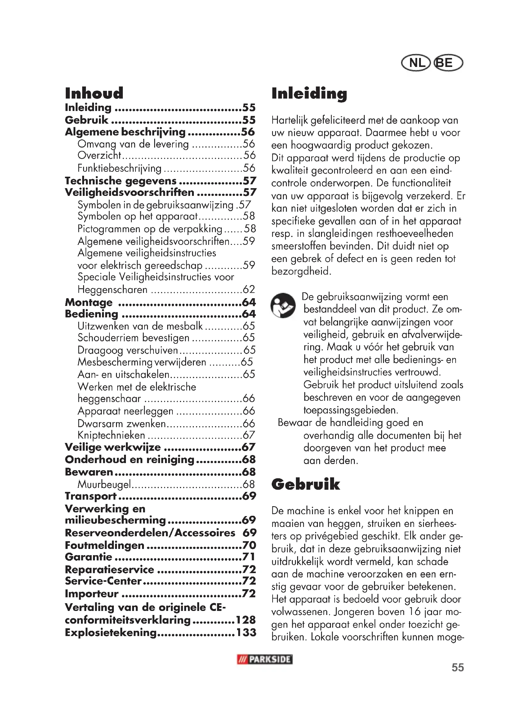 - Inleiding Hartelk gefeliciteerd met de aankoop van uw nieuw apparaat. Daarmee hebt u voor een hoogwaardig product gekozen. Dit apparaat werd tdens de productie op kwaliteit gecontroleerd en aan een eind- controle onderworpen. De functionaliteit van uw apparaat is bgevolg verzekerd. Er kan niet uitgesloten worden dat er zich in specieke gevallen aan of in het apparaat resp. in slangleidingen resthoeveelheden smeerstoffen bevinden. Dit duidt niet op een gebrek of defect en is geen reden tot bezorgdheid. De gebruiksaanwzing vormt een bestanddeel van dit product. Ze om- vat belangrke aanwzingen voor veiligheid, gebruik en afvalverwde- ring. Maak u vóór het gebruik van het product met alle bedienings- en veiligheidsinstructies vertrouwd. Gebruik het product uitsluitend zoals beschreven en voor de aangegeven toepassingsgebieden. Bewaar de handleiding goed en overhandig alle documenten b het doorgeven van het product mee aan derden. Gebruik De machine is enkel voor het knippen en maaien van heggen, struiken en sierhees- ters op privégebied geschikt. Elk ander ge- bruik, dat in deze gebruiksaanwzing niet uitdrukkelk wordt vermeld, kan schade aan de machine veroorzaken en een ern- stig gevaar voor de gebruiker betekenen. Het apparaat is bedoeld voor gebruik door volwassenen. Jongeren boven 16 jaar mo- gen het apparaat enkel onder toezicht ge- bruiken. Lokale voorschriften kunnen moge- Vertaling van de originele CE- conformiteitsverklaring p. 128