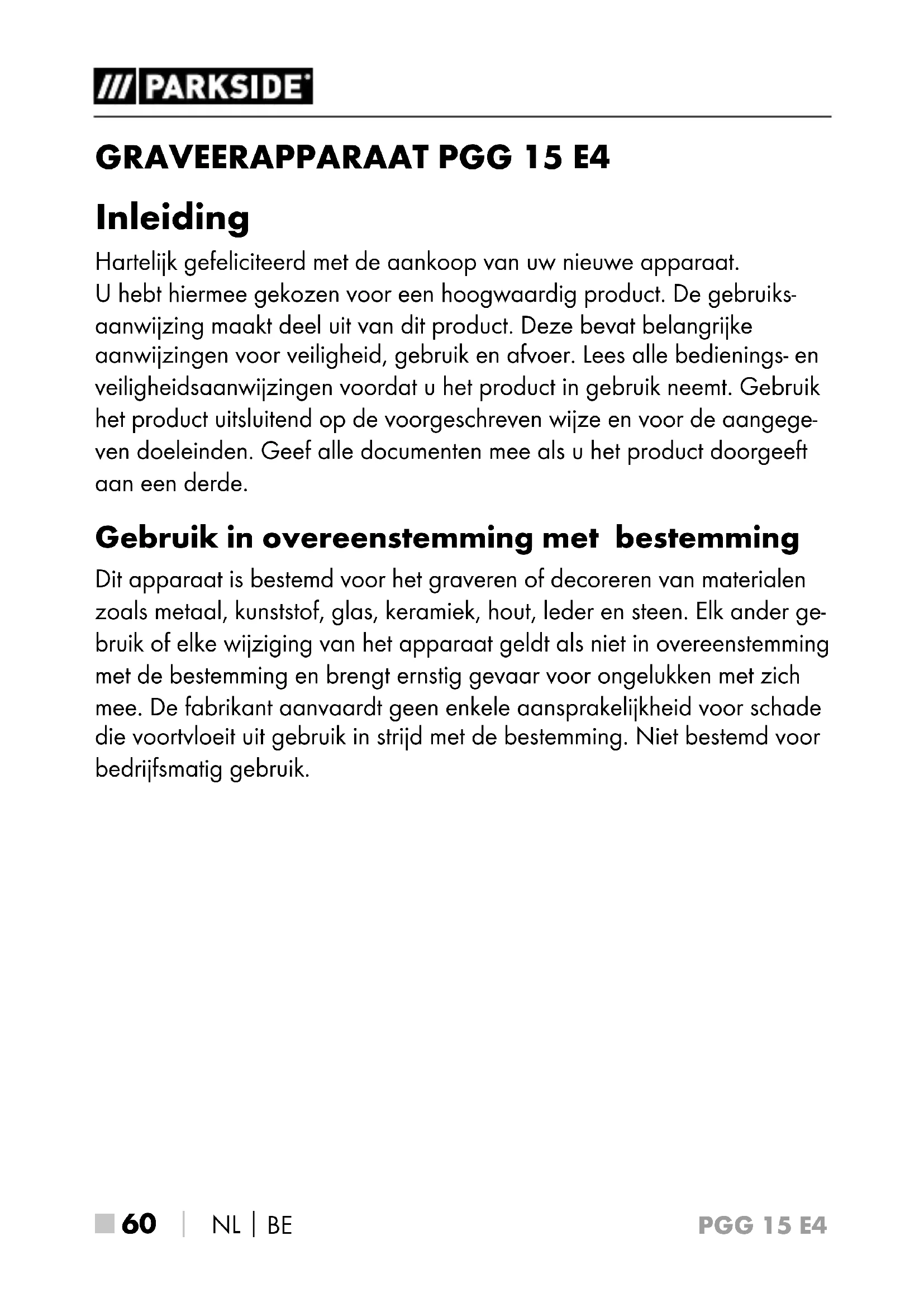 Inleiding Hartelijk gefeliciteerd met de aankoop van uw nieuwe apparaat. U hebt hiermee gekozen voor een hoogwaardig product. De gebruiks- aanwijzing maakt deel uit van dit product. Deze bevat belangrijke aanwijzingen voor veiligheid, gebruik en afvoer. Lees alle bedienings- en veiligheidsaanwijzingen voordat u het product in gebruik neemt. Gebruik het product uitsluitend op de voorgeschreven wijze en voor de aangege- ven doeleinden. Geef alle documenten mee als u het product doorgeeft aan een derde. Gebruik in overeenstemming met bestemming Dit apparaat is bestemd voor het graveren of decoreren van materialen zoals metaal, kunststof, glas, keramiek, hout, leder en steen. Elk ander ge- bruik of elke wijziging van het apparaat geldt als niet in overeenstemming met de bestemming en brengt ernstig gevaar voor ongelukken met zich mee. De fabrikant aanvaardt geen enkele aansprakelijkheid voor schade die voortvloeit uit gebruik in strijd met de bestemming. Niet bestemd voor bedrijfsmatig gebruik.PGG 15 E4