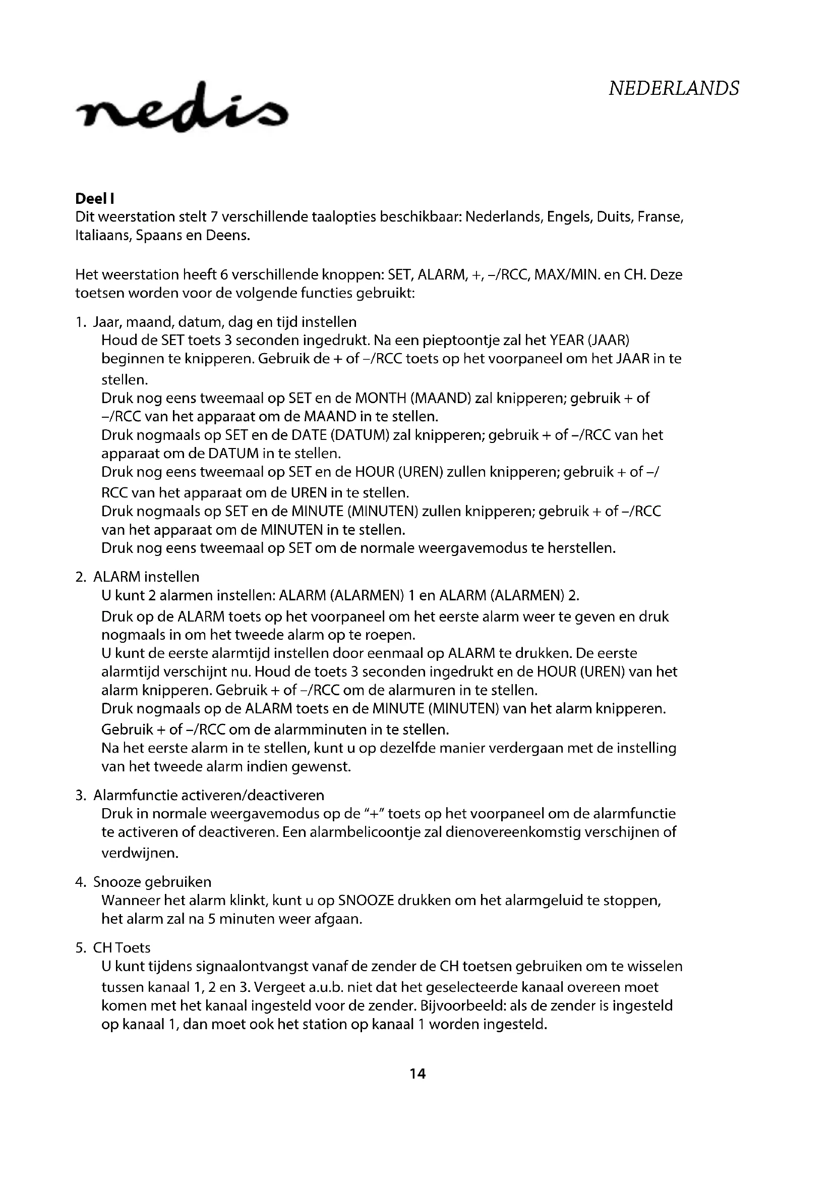 Veiligheidsmaatregelen: Om het risico op elektrische schokken te voorkomen mag dit product ALLEEN worden geopend door een erkende technicus wanneer er onderhoud nodig is. Koppel het product los van de elektrische voeding en van andere apparatuur als er zich problemen voordoen. Stel het product niet bloot aan water of vocht. Onderhoud: Uitsluitend reinigen met een droge doek. Gebruik geen reinigingsmiddelen of schuurmiddelen. Garantie: Voor wijzigingen en veranderingen aan het product of schade veroorzaakt door een verkeerd gebruik van dit product, kan geen aansprakelijkheid worden geaccepteerd. Tevens vervalt daardoor de garantie. Algemeen: Ontwerpen en specicaties kunnen zonder kennisgeving worden gewijzigd. Alle logo’s, merken en productnamen zijn handelsmerken of geregistreerde handelsmerken van de respectievelijke eigenaren en worden hierbij als zodanig erkend. Bewaar deze gebruiksaanwijzing voor latere raadpleging. Opgelet: Dit product is voorzien van dit symbool. Dit symbool geeft aan dat afgedankte elektrische en elektronische producten niet met het gewone huisafval verwijderd mogen worden. Voor dit soort producten zijn er speciale inzamelingspunten. Dit product is vervaardigd en geleverd in overeenstemming met de relevante reglementen en richtlijnen die voor alle lidstaten van de Europese Unie gelden. Het voldoet ook aan alle toepasselijke specicaties en reglementen van het land van verkoop. Op aanvraag is ociële documentatie verkrijgbaar. Inclusief, maar niet uitsluitend: Conformiteitsverklaring (en productidentiteit), materiaalveiligheidsinformatie en producttestrapport. Wend u tot onze klantenservice voor ondersteuning: via de website: http://www.nedis.nl/nl-nl/contact/contact-formulier.htm via e-mail: service@nedis.nl telefonisch: +31 (0)73-5993965 (tijdens kantooruren) NEDIS B.V., De Tweeling 28, 5215 MC ’s-Hertogenbosch, NEDERLAND18 ITALIANO Parte I Questa stazione meteorologica ha 7 diverse opzioni di lingua: inglese, tedesco, francese, italiano, spagnolo, olandese e danese. La stazione meteorologia è dotata di 6 tasti: SET, ALARM, +, –/RCC, MAX/MIN e CH. Questi bottoni sono usati per le seguenti funzioni: