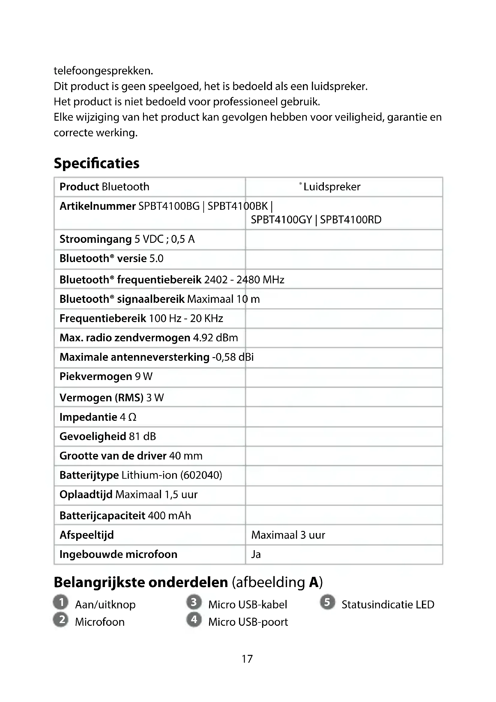 Stroomingang 5 VDC ; 0,5 A Bluetooth® versie 5.0 Bluetooth® frequentiebereik 2402 - 2480 MHz Bluetooth® signaalbereik Maximaal 10 m Frequentiebereik 100 Hz - 20 KHz Max. radio zendvermogen 4.92 dBm Maximale antenneversterking -0,58 dBi Piekvermogen 9 W Vermogen (RMS) 3 W Impedantie 4 Ω Gevoeligheid 81 dB Grootte van de driver 40 mm Batterijtype Lithium-ion (602040) Oplaadtijd Maximaal 1,5 uur Batterijcapaciteit 400 mAh Afspeeltijd Maximaal 3 uur Ingebouwde microfoon Ja Belangrijkste onderdelen (afbeelding A)