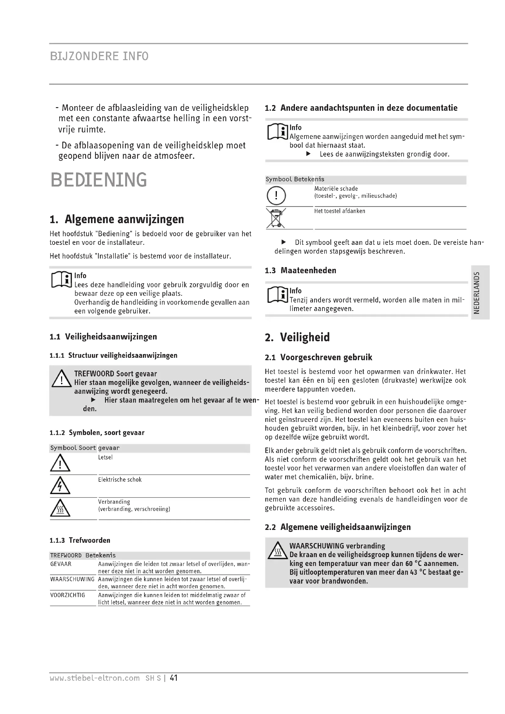 BZONDERE INFO - Het toestel kan door kinderen vanaf 3 jaar, als- mede door personen met verminderde fysieke, sensorische of geestelijke vermogens of met een gebrek aan ervaring en kennis gebruikt worden, wanneer er toezicht op hen gehouden wordt, of wanneer ze met betrekking tot het veilige gebruik van het toestel geïnstrueerd zijn en de gevaren die daaruit ontstaan, begrepen hebben. Kinderen in de leeftijd van 3 tot 8 jaar mogen alleen de kraan bedienen die op het toestel aangesloten is. Kinderen mogen niet met het toestel spelen. Kinderen mogen zonder toezicht geen reiniging of gebruikersonderhoud uitvoeren. - De aansluiting op het stroomnet is enkel als vaste aansluiting toegestaan in combinatie met de uit- neembare kabeldoorvoer. Het toestel moet op alle polen met een afstand van minstens 3mm van de aansluiting van het net kunnen worden losgekoppeld. - Monteer het toestel zoals dat in de hoofdstukken "Installatie/voorbereidingen" en "Installatie/mon- tage/montage van het toestel" beschreven is. - Houd rekening met de minimale en maximale inlaatwaterdruk (zie hoofdstuk "Installatie/techni- sche gegevens/gegevenstabel"). - Tap het toestel af zoals beschreven in het hoofd- stuk "Installatie/onderhoud/het toestel aftappen". - Installeer een reststroom-veiligheidsapparaat (RCD). Gesloten werkwijze: - Het toestel staat onder druk. Tijdens verwarming druppelt expansiewater uit de veiligheidsklep. - Stel periodiek de veiligheidsklep in werking, zodat vastzitten, bijv. door kalkafzettingen, voor- komen wordt. - Monteer een type-gekeurde veiligheidsklep in de koudwateraanvoerleiding. Let erop dat daarvoor, afhankelijk van de statische druk, eventueel ook een reduceerafsluiter nodig is. - Dimensioneer de afvoerleiding op een wijze dat het water bij volledig geopende veiligheidsklep ongehinderd kan worden afgevoerd.NEDERLANDSwww.stiebel-eltron.com SH S | 41 BZONDERE INFO - Monteer de afblaasleiding van de veiligheidsklep met een constante afwaartse helling in een vorst-vrije ruimte. - De afblaasopening van de veiligheidsklep moet geopend blijven naar de atmosfeer. BEDIENING
