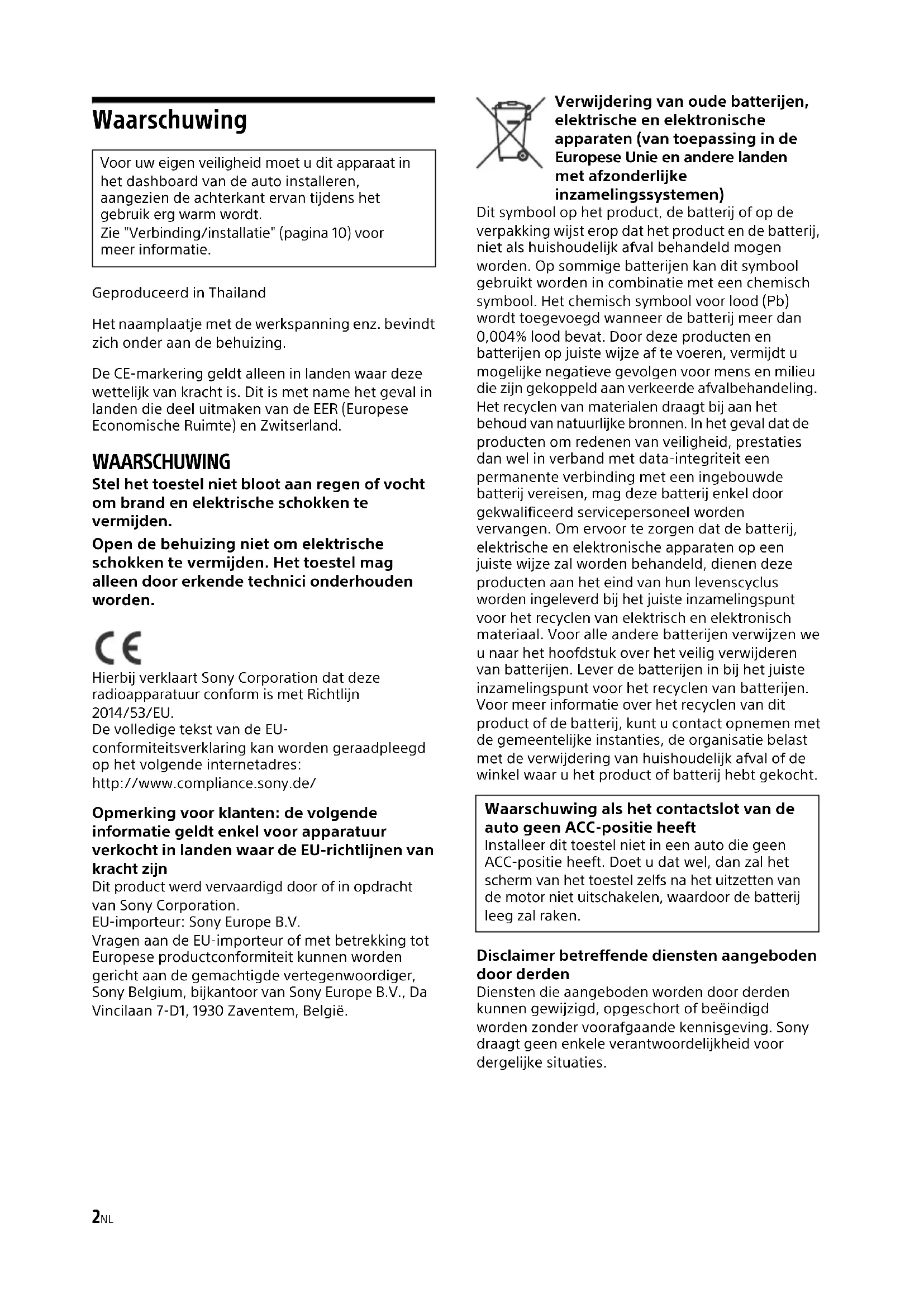 Soporte Soporte Fusible (10 A)2NL Waarschuwing Geproduceerd in Thailand Het naamplaatje met de werkspanning enz. bevindt zich onder aan de behuizing. De CE-markering geldt alleen in landen waar deze wettelijk van kracht is. Dit is met name het geval in landen die deel uitmaken van de EER (Europese Economische Ruimte) en Zwitserland. WAARSCHUWING Stel het toestel niet bloot aan regen of vocht om brand en elektrische schokken te vermijden. Open de behuizing niet om elektrische schokken te vermijden. Het toestel mag alleen door erkende technici onderhouden worden. Hierbij verklaart Sony Corporation dat deze radioapparatuur conform is met Richtlijn 2014/53/EU. De volledige tekst van de EU- conformiteitsverklaring kan worden geraadpleegd op het volgende internetadres: http://www.compliance.sony.de/ Opmerking voor klanten: de volgende informatie geldt enkel voor apparatuur verkocht in landen waar de EU-richtlijnen van kracht zijn Dit product werd vervaardigd door of in opdracht van Sony Corporation. EU-importeur: Sony Europe B.V. Vragen aan de EU-importeur of met betrekking tot Europese productconformiteit kunnen worden gericht aan de gemachtigde vertegenwoordiger, Sony Belgium, bijkantoor van Sony Europe B.V., Da Vincilaan 7-D1, 1930 Zaventem, België. Verwijdering van oude batterijen, elektrische en elektronische apparaten (van toepassing in de Europese Unie en andere landen met afzonderlijke inzamelingssystemen) Dit symbool op het product, de batterij of op de verpakking wijst erop dat het product en de batterij, niet als huishoudelijk afval behandeld mogen worden. Op sommige batterijen kan dit symbool gebruikt worden in combinatie met een chemisch symbool. Het chemisch symbool voor lood (Pb) wordt toegevoegd wanneer de batterij meer dan 0,004% lood bevat. Door deze producten en batterijen op juiste wijze af te voeren, vermijdt u mogelijke negatieve gevolgen voor mens en milieu die zijn gekoppeld aan verkeerde afvalbehandeling. Het recyclen van materialen draagt bij aan het behoud van natuurlijke bronnen. In het geval dat de producten om redenen van veiligheid, prestaties dan wel in verband met data-integriteit een permanente verbinding met een ingebouwde batterij vereisen, mag deze batterij enkel door gekwalificeerd servicepersoneel worden vervangen. Om ervoor te zorgen dat de batterij, elektrische en elektronische apparaten op een juiste wijze zal worden behandeld, dienen deze producten aan het eind van hun levenscyclus worden ingeleverd bij het juiste inzamelingspunt voor het recyclen van elektrisch en elektronisch materiaal. Voor alle andere batterijen verwijzen we u naar het hoofdstuk over het veilig verwijderen van batterijen. Lever de batterijen in bij het juiste inzamelingspunt voor het recyclen van batterijen. Voor meer informatie over het recyclen van dit product of de batterij, kunt u contact opnemen met de gemeentelijke instanties, de organisatie belast met de verwijdering van huishoudelijk afval of de winkel waar u het product of batterij hebt gekocht. Disclaimer betreffende diensten aangeboden door derden Diensten die aangeboden worden door derden kunnen gewijzigd, opgeschort of beëindigd worden zonder voorafgaande kennisgeving. Sony draagt geen enkele verantwoordelijkheid voor dergelijke situaties. Voor uw eigen veiligheid moet u dit apparaat in het dashboard van de auto installeren, aangezien de achterkant ervan tijdens het gebruik erg warm wordt. Zie "Verbinding/installatie" (pagina 10) voor meer informatie. Waarschuwing als het contactslot van de auto geen ACC-positie heeft Installeer dit toestel niet in een auto die geen ACC-positie heeft. Doet u dat wel, dan zal het scherm van het toestel zelfs na het uitzetten van de motor niet uitschakelen, waardoor de batterij leeg zal raken.3NL Opgelet