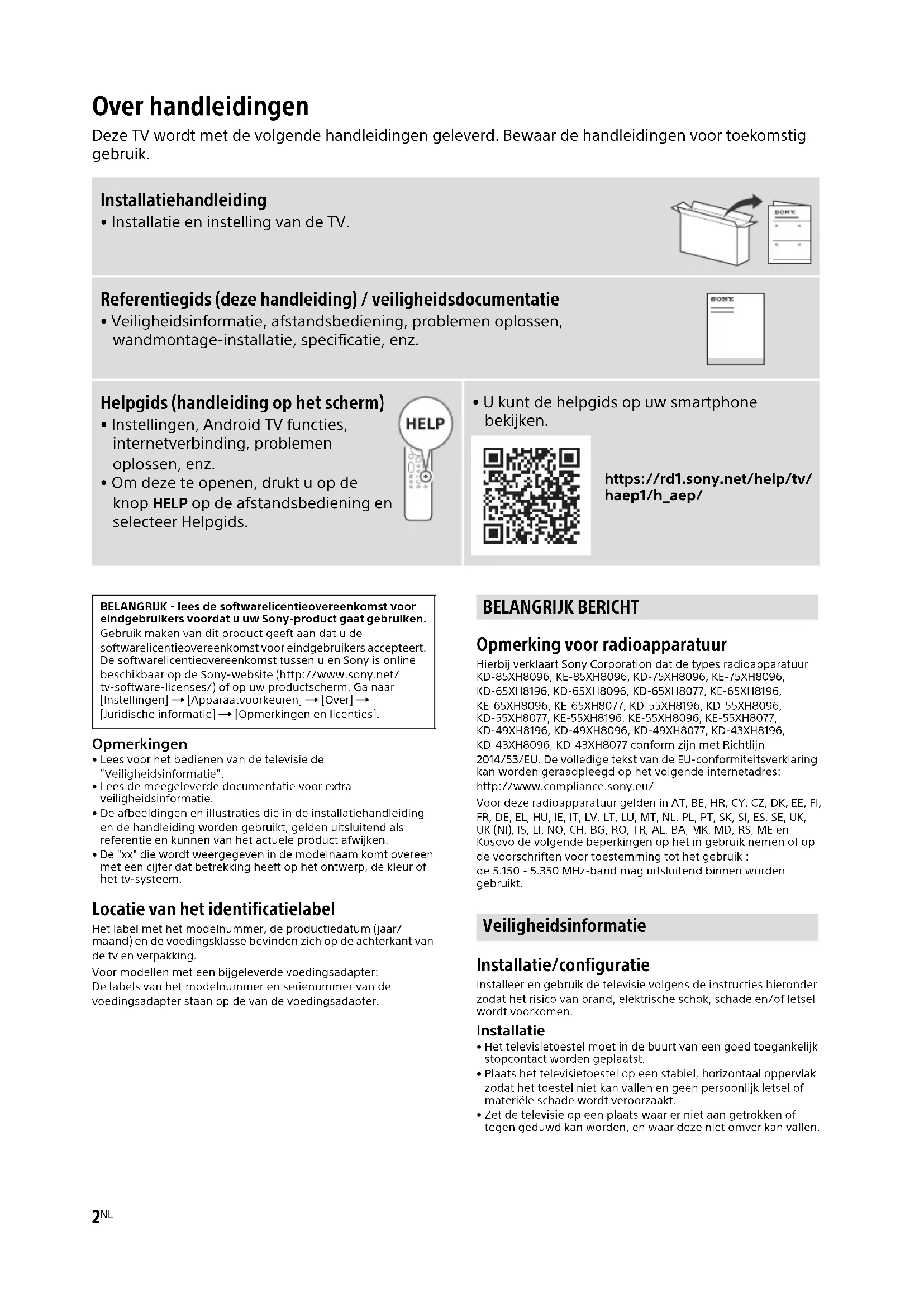 - U kunt de helpgids op uw smartphone bekijken. https://rd1.sony.net/help/tv/ haep1/h_aep/ BELANGRIJK - lees de softwarelicentieovereenkomst voor eindgebruikers voordat u uw Sony-product gaat gebruiken. Gebruik maken van dit product geeft aan dat u de softwarelicentieovereenkomst voor eindgebruikers accepteert. De softwarelicentieovereenkomst tussen u en Sony is online beschikbaar op de Sony-website (http://www.sony.net/ tv-software-licenses/) of op uw productscherm. Ga naar [Instellingen] [Apparaatvoorkeuren] [Over] [Juridische informatie] [Opmerkingen en licenties]. BELANGRIJK BERICHT Veiligheidsinformatie3