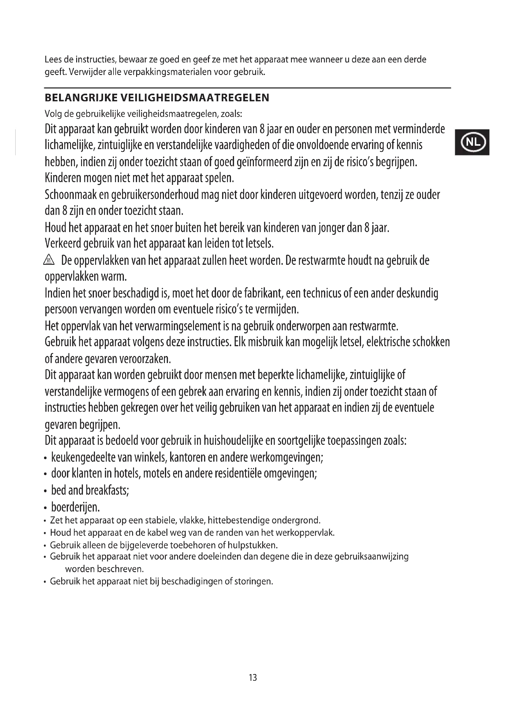 Lees de instructies, bewaar ze goed en geef ze met het apparaat mee wanneer u deze aan een derde geeft. Verwijder alle verpakkingsmaterialen voor gebruik. BELANGRIJKE VEILIGHEIDSMAATREGELEN Volg de gebruikelijke veiligheidsmaatregelen, zoals: Dit apparaat kan gebruikt worden door kinderen van 8 jaar en ouder en personen met verminderde lichamelijke, zintuiglijke en verstandelijke vaardigheden of die onvoldoende ervaring of kennis hebben, indien zij onder toezicht staan of goed geïnformeerd zijn en zij de risico’s begrijpen. Kinderen mogen niet met het apparaat spelen. Schoonmaak en gebruikersonderhoud mag niet door kinderen uitgevoerd worden, tenzij ze ouder dan 8 zijn en onder toezicht staan. Houd het apparaat en het snoer buiten het bereik van kinderen van jonger dan 8 jaar. Verkeerd gebruik van het apparaat kan leiden tot letsels. h De oppervlakken van het apparaat zullen heet worden. De restwarmte houdt na gebruik de oppervlakken warm. Indien het snoer beschadigd is, moet het door de fabrikant, een technicus of een ander deskundig persoon vervangen worden om eventuele risico’s te vermijden. Het oppervlak van het verwarmingselement is na gebruik onderworpen aan restwarmte. Gebruik het apparaat volgens deze instructies. Elk misbruik kan mogelijk letsel, elektrische schokken of andere gevaren veroorzaken. Dit apparaat kan worden gebruikt door mensen met beperkte lichamelijke, zintuiglijke of verstandelijke vermogens of een gebrek aan ervaring en kennis, indien zij onder toezicht staan of instructies hebben gekregen over het veilig gebruiken van het apparaat en indien zij de eventuele gevaren begrijpen. Dit apparaat is bedoeld voor gebruik in huishoudelijke en soortgelijke toepassingen zoals: