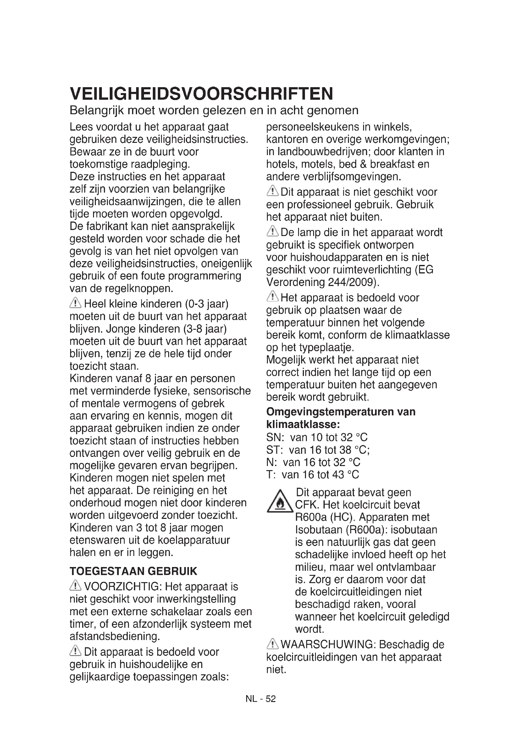 Questa illustrazione dei componenti dell’apparecchio ha uno scopo puramente informativo. I componenti possono variare tra un modello e l’altro.NL - 52 VEILIGHEIDSVOORSCHRIFTEN Belangrijk moet worden gelezen en in acht genomen Lees voordat u het apparaat gaat gebruiken deze veiligheidsinstructies. Bewaar ze in de buurt voor toekomstige raadpleging. Deze instructies en het apparaat zelf zijn voorzien van belangrijke veiligheidsaanwijzingen, die te allen tijde moeten worden opgevolgd. De fabrikant kan niet aansprakelijk gesteld worden voor schade die het gevolg is van het niet opvolgen van deze veiligheidsinstructies, oneigenlijk gebruik of een foute programmering van de regelknoppen. Heel kleine kinderen (0-3 jaar) moeten uit de buurt van het apparaat blijven. Jonge kinderen (3-8 jaar) moeten uit de buurt van het apparaat blijven, tenzij ze de hele tijd onder toezicht staan. Kinderen vanaf 8 jaar en personen met verminderde fysieke, sensorische of mentale vermogens of gebrek aan ervaring en kennis, mogen dit apparaat gebruiken indien ze onder toezicht staan of instructies hebben ontvangen over veilig gebruik en de mogelijke gevaren ervan begrijpen. Kinderen mogen niet spelen met het apparaat. De reiniging en het onderhoud mogen niet door kinderen worden uitgevoerd zonder toezicht. Kinderen van 3 tot 8 jaar mogen etenswaren uit de koelapparatuur halen en er in leggen. TOEGESTAAN GEBRUIK VOORZICHTIG: Het apparaat is niet geschikt voor inwerkingstelling met een externe schakelaar zoals een timer, of een afzonderlijk systeem met afstandsbediening. Dit apparaat is bedoeld voor gebruik in huishoudelijke en gelijkaardige toepassingen zoals: personeelskeukens in winkels, kantoren en overige werkomgevingen; in landbouwbedrijven; door klanten in hotels, motels, bed & breakfast en andere verblijfsomgevingen. Dit apparaat is niet geschikt voor een professioneel gebruik. Gebruik het apparaat niet buiten. De lamp die in het apparaat wordt gebruikt is speciek ontworpen voor huishoudapparaten en is niet geschikt voor ruimteverlichting (EG Verordening 244/2009). Het apparaat is bedoeld voor gebruik op plaatsen waar de temperatuur binnen het volgende bereik komt, conform de klimaatklasse op het typeplaatje. Mogelijk werkt het apparaat niet correct indien het lange tijd op een temperatuur buiten het aangegeven bereik wordt gebruikt. Omgevingstemperaturen van klimaatklasse: SN: van 10 tot 32 °C ST: van 16 tot 38 °C; N: van 16 tot 32 °C T: van 16 tot 43 °C Dit apparaat bevat geen CFK. Het koelcircuit bevat R600a (HC). Apparaten met Isobutaan (R600a): isobutaan is een natuurlijk gas dat geen schadelijke invloed heeft op het milieu, maar wel ontvlambaar is. Zorg er daarom voor dat de koelcircuitleidingen niet beschadigd raken, vooral wanneer het koelcircuit geledigd wordt. WAARSCHUWING: Beschadig de koelcircuitleidingen van het apparaat niet.NL - 53 WAARSCHUWING: Houd de ventilatieopeningen in de behuizing van het apparaat of in de ingebouwde structuur vrij van obstakels. WAARSCHUWING: Gebruik geen mechanische, elektrische of chemische middelen behalve de middelen aanbevolen door de fabrikant om het ontdooiproces te versnellen. WAARSCHUWING: Gebruik of plaats geen elektrische apparaten binnenin de apparaatcompartimenten indien deze niet het type zijn dat uitdrukkelijk is goedgekeurd door de Fabrikant. WAARSCHUWING: IJsmakers en/of waterdispensers die niet rechtstreeks op het waterleidingnet zijn aangesloten, mogen uitsluitend met drinkwater worden gevuld. WAARSCHUWING: Automatische ijsmakers en/of waterdispensers moeten worden aangesloten op een waterleidingnet dat uitsluitend drinkwater levert, met een waterdruk tussen 0,17 en 0,81 MPa (1,7 en 8,1 bar). Sla geen ontplofbare stoffen zoals spuitbussen op en gebruik geen benzine of andere brandbare materialen in of in de buurt van het apparaat. Slik de (niet-giftige) vloeistof uit de vrieselementen niet in (bij enkele modellen). Eet geen ijsblokjes of waterijsjes die net uit de vriezer komen, aangezien deze vriesbrandwonden kunnen veroorzaken. Bij producten ontworpen voor gebruik met een luchtlter in een toegankelijke ventilatorafdekking, moet het lter altijd zijn aangebracht wanneer de koelkast in bedrijf is. Bewaar geen glazen containers met vloeistoffen in het diepvriescompartiment, omdat ze kunnen breken. Blokkeer de ventilator (indien aanwezig) niet met levensmiddelen. Nadat de levensmiddelen in het apparaat zijn geplaatst dient gecontroleerd te worden of de deuren van de vakken goed sluiten, met name de deur van het vriesvak. Een beschadigde afdichting dient zo snel mogelijk vervangen te worden. Gebruik het koelkastcompartiment uitsluitend voor het bewaren van vers voedsel en het diepvriescompartiment uitsluitend voor het bewaren van bevroren voedsel, het invriezen van vers voedsel en het maken van ijsblokjes. Vermijd het bewaren van onverpakt voedsel in direct contact met interne oppervlakken van de koelkast- of diepvriescompartimenten. Apparaten kunnen over speciale compartimenten beschikken (vak voor verse etenswaar, nul gradenvak,...). Indien niet anders gespeciceerd in de productbeschrijving, kunnen deze compartimenten verwijderd worden zonder dat hierdoor de prestaties veranderen. C-pentaan wordt gebruikt als blaasmiddel in het isolatieschuim en is een licht ontvlambaar gas. Rekening houdend met de temperatuursverschillen in de verschillende koelkastcompartimenten, kunnen etenswaren het beste als volgt worden bewaard: - Koelkastcompartiment: