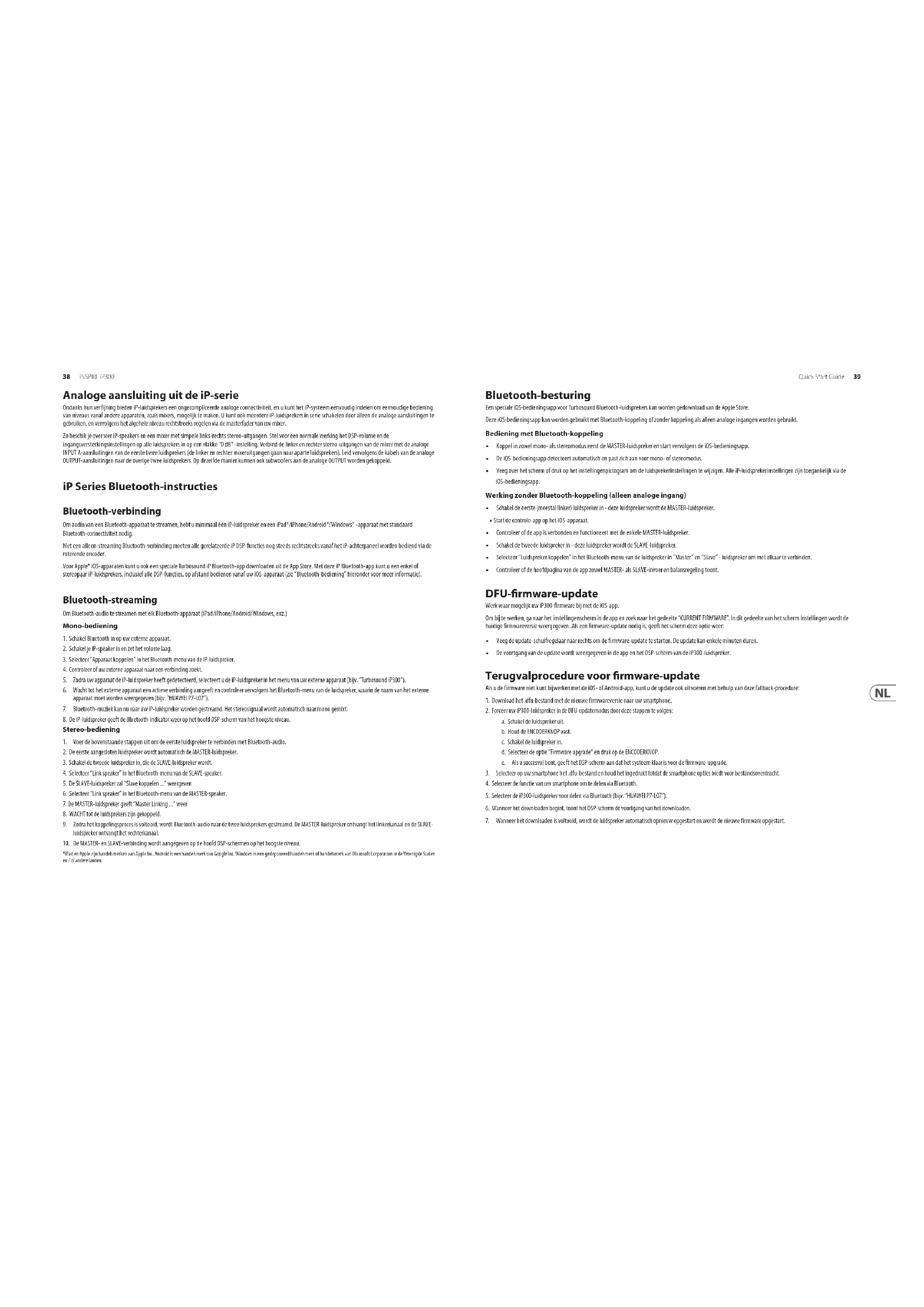 - “M” of “S” geeft aan dat de luidspreker is verbonden met een andere iP-luidspreker als MASTER (linkerkanaal, “M”) of SLAVE-annel, “S”). Draai aan de encoderknop om het uitvoervolume aan te passen. Druk op de encoderknop om het laatst gebruikte submenu te openen. Druk op de knop Proces en Instellingen om de submenu’s te openen. Volume Draai aan de encoder om het uitvoervolume te wijzigen. WERKWIJZE INVOER Stelt het niveau van de ingangsmixer EQ en reverb in voor analoge ingang A en B, evenals het niveau voor Bluetooth. EQ (egalisatie) Maakt aanpassing van drie-bands equalizer mogelijk met regelaars voor bas, middentonen en hoge tonen. MODUS Keuze uit 4 vooraf ingestelde equalisaties, afhankelijk van functie en muziektype. POSIT (positie) Selecteert DSP-compensatie afhankelijk van de luidsprekerpositie: standaard, muur, hoek. OPSTELLING Stelt het contrast van het LCD-achterpaneel, apparaatvergrendeling en fabrieksinstellingen in. BT (Bluetooth) Hiermee kunt u de luidspreker koppelen met mobiele Bluetooth- apparaten en een koppeling maken met een andere iP-luidspreker als MASTER / SLAVE. INFO Geeft model- en rmwaregegevens weer. DFU Geeft aan dat het apparaat rmware van APP-software bijwerkt via Bluetooth. *iPhone is een handelsmerk van Apple Inc. Het Bluetooth-woordmerk en de Bluetooth-logo’s zijn geregistreerde handelsmerken van Bluetooth SIG, Inc. en elk gebruik van dergelijke merken is onder licentie.38 iNSPIRE iP300 Quick Start Guide 39 Analoge aansluiting uit de iP-serie Ondanks hun verfijning bieden iP-luidsprekers een ongecompliceerde analoge connectiviteit, en u kunt het iP-systeem eenvoudig indelen om eenvoudige bediening van niveaus vanaf andere apparaten, zoals mixers, mogelijk te maken. U kunt ook meerdere iP-luidsprekers in serie schakelen door alleen de analoge aansluitingen te gebruiken, en vervolgens het algehele niveau rechtstreeks regelen via de masterfader van uw mixer. Zo beschik je over vier iP-speakers en een mixer met simpele links-rechts stereo-uitgangen. Stel voor een normale werking het DSP-volume en de ingangsversterkingsinstellingen op alle luidsprekers in op een vlakke "0 dB" -instelling. Verbind de linker en rechter stereo-uitgangen van de mixer met de analoge INPUT A-aansluitingen van de eerste twee luidsprekers (de linker en rechter mixeruitgangen gaan naar aparte luidsprekers). Leid vervolgens de kabels van de analoge OUTPUT-aansluitingen naar de overige twee luidsprekers. Op dezelfde manier kunnen ook subwoofers aan de analoge OUTPUT worden gekoppeld. iP Series Bluetooth-instructies Bluetooth-verbinding Om audio van een Bluetooth-apparaat te streamen, hebt u minimaal één iP-luidspreker en een iPad*/iPhone/Android*/Windows* -apparaat met standaard Bluetooth-connectiviteit nodig. Met een alleen-streaming Bluetooth-verbinding moeten alle gerelateerde iP DSP-functies nog steeds rechtstreeks vanaf het iP-achterpaneel worden bediend via de roterende encoder. Voor Apple* iOS-apparaten kunt u ook een speciale Turbosound iP Bluetooth-app downloaden uit de App Store. Met deze iP Bluetooth-app kunt u een enkel of stereopaar iP-luidsprekers, inclusief alle DSP-functies, op afstand bedienen vanaf uw iOS-apparaat (zie “Bluetooth-bediening” hieronder voor meer informatie). Bluetooth-streaming Om Bluetooth-audio te streamen met elk Bluetooth-apparaat (iPad/iPhone/Android/Windows, enz.) Mono-bediening