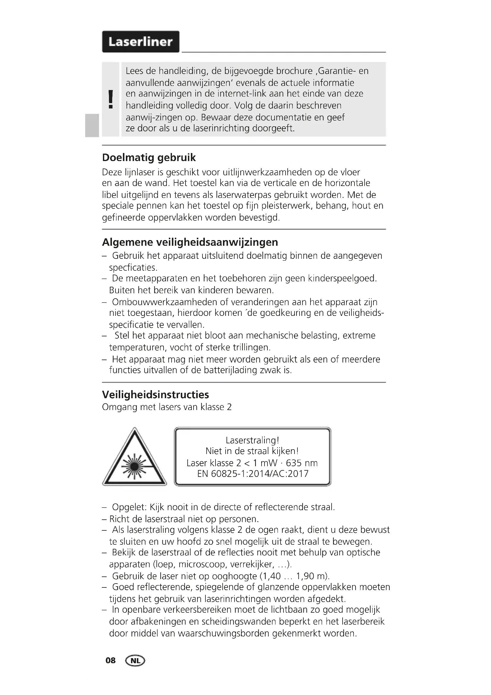 Doelmatig gebruik Deze lijnlaser is geschikt voor uitlijnwerkzaamheden op de vloer en aan de wand. Het toestel kan via de verticale en de horizontale libel uitgelijnd en tevens als laserwaterpas gebruikt worden. Met de speciale pennen kan het toestel op fijn pleisterwerk, behang, hout en gefineerde oppervlakken worden bevestigd. Algemene veiligheidsaanwijzingen – Gebruik het apparaat uitsluitend doelmatig binnen de aangegeven speccaties. – De meetapparaten en het toebehoren zijn geen kinderspeelgoed. Buiten het bereik van kinderen bewaren. – Ombouwwerkzaamheden of veranderingen aan het apparaat zijn niet toegestaan, hierdoor komen ´de goedkeuring en de veiligheids- specicatie te vervallen. – Stel het apparaat niet bloot aan mechanische belasting, extreme temperaturen, vocht of sterke trillingen. – Het apparaat mag niet meer worden gebruikt als een of meerdere functies uitvallen of de batterijlading zwak is. – Opgelet: Kijk nooit in de directe of reecterende straal. – Richt de laserstraal niet op personen. – Als laserstraling volgens klasse 2 de ogen raakt, dient u deze bewust te sluiten en uw hoofd zo snel mogelijk uit de straal te bewegen. – Bekijk de laserstraal of de reecties nooit met behulp van optische apparaten (loep, microscoop, verrekijker, …). – Gebruik de laser niet op ooghoogte (1,40 … 1,90 m). – Goed reecterende, spiegelende of glanzende oppervlakken moeten tijdens het gebruik van laserinrichtingen worden afgedekt. – In openbare verkeersbereiken moet de lichtbaan zo goed mogelijk door afbakeningen en scheidingswanden beperkt en het laserbereik door middel van waarschuwingsborden gekenmerkt worden. Veiligheidsinstructies Omgang met lasers van klasse 2 Laserstraling! Niet in de straal kijken! Laser klasse 2 < 1 mW · 635 nm EN 60825-1:2014/AC:2017 NLLaserCube