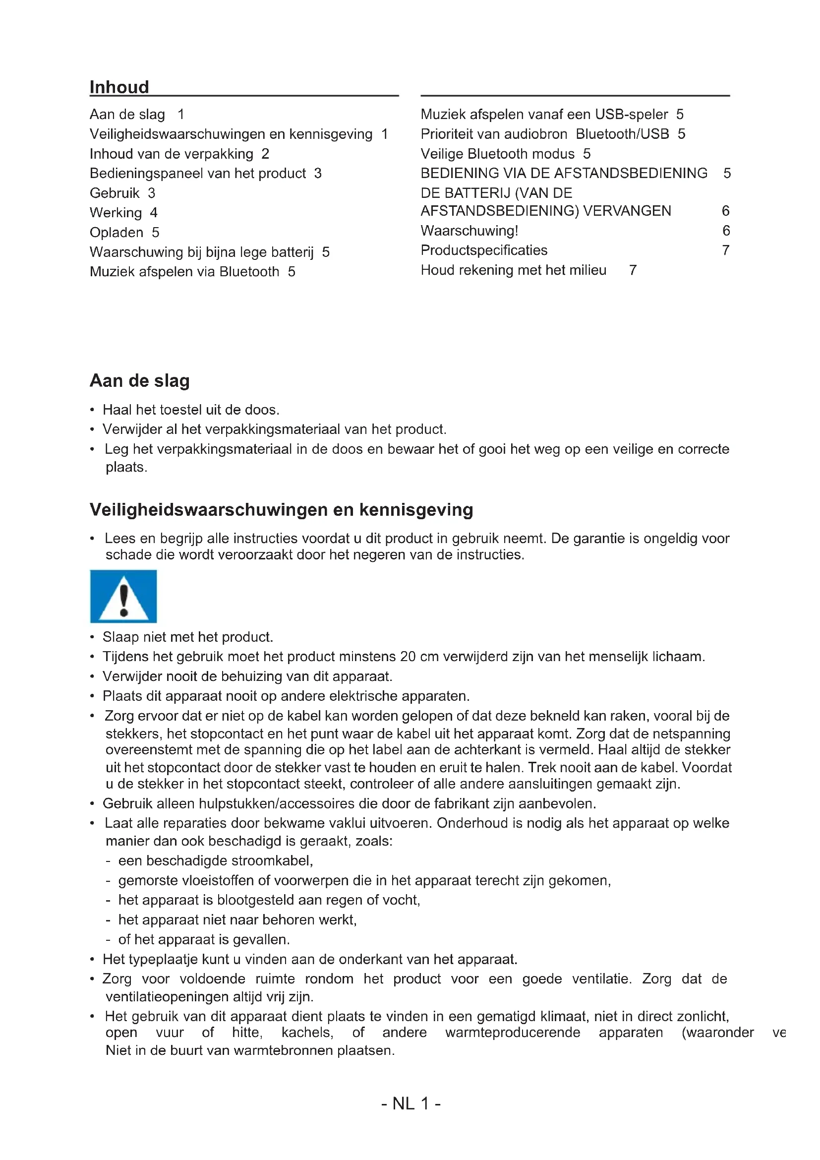 - Het gebruik van dit apparaat dient plaats te vinden in een gematigd klimaat, niet in direct zonlicht, RSHQ YXXU RI KLWWH NDFKHOV RI DQGHUH ZDUPWHSURGXFHUHQGH DSSDUDWHQ ZDDURQGHU YHUVWHUNHUV Niet in de buurt van warmtebronnen plaatsen. Aan de slag 1 Veiligheidswaarschuwingen en kennisgeving 1 Inhoud van de verpakking 2 Bedieningspaneel van het product 3 Gebruik 3 Werking 4 Opladen 5 Waarschuwing bij bijna lege batterij 5 Muziek afspelen via Bluetooth 5 Muziek afspelen vanaf een USB-speler 5 Prioriteit van audiobron: Bluetooth/USB 5 Veilige Bluetooth modus 5