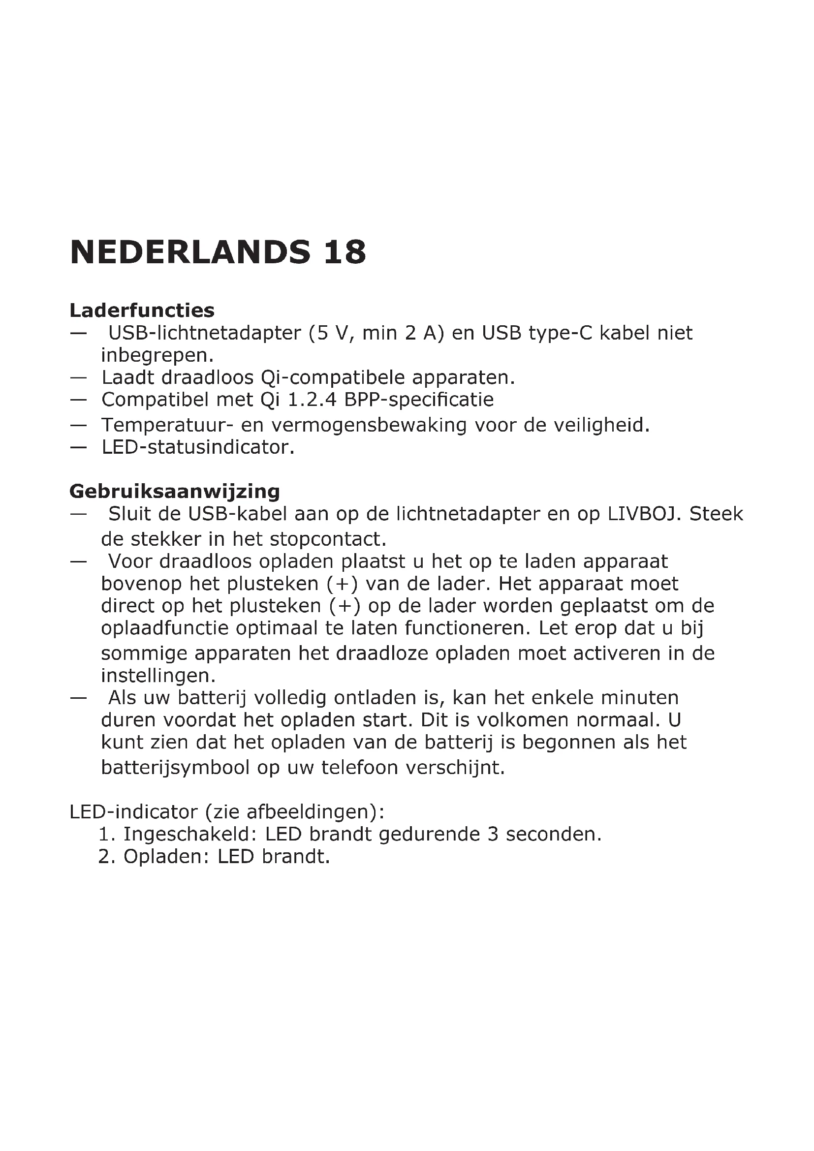 Goed om te weten — De lengte en kwaliteit van de USB-kabel zijn van invloed op de snelheid en prestaties van het opladen. — Apparaten kunnen warm worden tijdens het opladen. Dit is normaal. Ze zullen geleidelijk weer afkoelen nadat ze volledig zijn opgeladen. — De oplaadtijd kan variëren afhankelijk van de batterijcapaciteit van het apparaat, het laadniveau, de ouderdom van de batterij en de omgevingstemperatuur. — Opslagtemperatuur lader: -20°C tot 25°C. — Bedrijfstemperatuur lader: 0°C tot 40°C. Haal de stekker van de lader uit het stopcontact voordat u hem gaat schoonmaken en wanneer hij niet gebruikt wordt. Veeg de lader schoon met een zachte, vochtige doek. Dompel de lader niet onder in water. Aanbevolen voorzorgsmaatregelen en technische gegevens. Zie achterkant van de lader. Bewaar deze instructies voor toekomstig gebruik.20 WAARSCHUWING: — Laad alleen apparaten die compatibel zijn met Qi. — Het stopcontact moet dicht bij de apparatuur zijn en gemakkelijk toegankelijk zijn. — Alleen gebruiken op droge plaatsen. — Er moet op worden toegezien dat kinderen niet met het product spelen. — Gebruik nooit een beschadigde of een defecte USB-kabel voor het opladen. Dit kan het apparaat en uw toestel beschadigen. Onderhoud Probeer het product niet zelf te repareren. Als je onderdelen openmaakt of verwijdert kan je jezelf blootstellen aan gevaarlijke, stroomgeleidende punten en andere risico's. TECHNISCHE GEGEVENS Type: E1815 LIVBOJ Ingangsvermogen: 5 V DC, min 2 A USB type-C Alleen voor gebruik binnen Zend-/ontvangstfrequentie: 110.3 kHz-148 kHz Uitgangsvermogen: 33 dB µA/m op 3m Fabrikant: IKEA of Sweden AB Adres: Box 702, SE-343 81 Älmhult, ZWEDEN21 Het "Qi"-symbool is een handelsmerk van het Wireless Power Consortium. Informatie RF-blootstelling Radiofrequente signalen. Volgens de RF internationale blootstellingrichtlijnen zal de eindgebruiker bij normaal gebruik niet dichter dan tot 10 centimeter van het apparaat komen. Het symbool met de doorgestreepte vuilnisbak op wieltjes geeft aan dat het product gescheiden van het huishoudelijk afval moet worden aangeboden. Het product moet worden ingeleverd voor recycling in overeenstemming met de plaatselijke milieuvoorschriften voor afvalverwerking. Breng het naar de plaatselijke milieustraat of het dichtstbijzijnde IKEA woonwarenhuis. Door producten met dit symbool te scheiden van het huishoudelijk afval, help je de hoeveelheid afval naar verbrandingsovens of stortplaatsen te verminderen en eventuele negatieve invloeden op de volksgezondheid en het milieu te minimaliseren. Voor meer informatie neem contact op met IKEA.DANSK 22 Opladerens funktioner — USB-strømadapter (5 V, min. 2 A) og USB-kabel af type C medfølger ikke. — Oplader trådløst Qi-kompatible enheder. — Kompatibel med specikationen Qi 1.2.4 BPP. — Temperatur- og strømovervågning af sikkerhedsmæssige grunde. — LED-statusindikator. Brugsanvisning — Tilslut USB-kablet til strømadapteren og til LIVBOJ. Tilsluttes til stikkontakten. — Ved trådløs opladning skal den enhed, der skal oplades, placeres oven på plustegnet (+) på opladeren. Enheden skal placeres direkte over plustegnet (+) på opladeren, for at ladefunktionen fungerer optimalt. Bemærk, at det på visse enheder kan være nødvendigt at aktivere trådløs opladning under indstillingerne. — Hvis batteriet er helt aadet, kan det tage et par minutter, før det begynder at oplade. Det er helt normalt. Du kan se, at batteriet er begyndt at oplade, når batterisymbolet vises på telefonen. LED-indikator (se illustrationerne):
