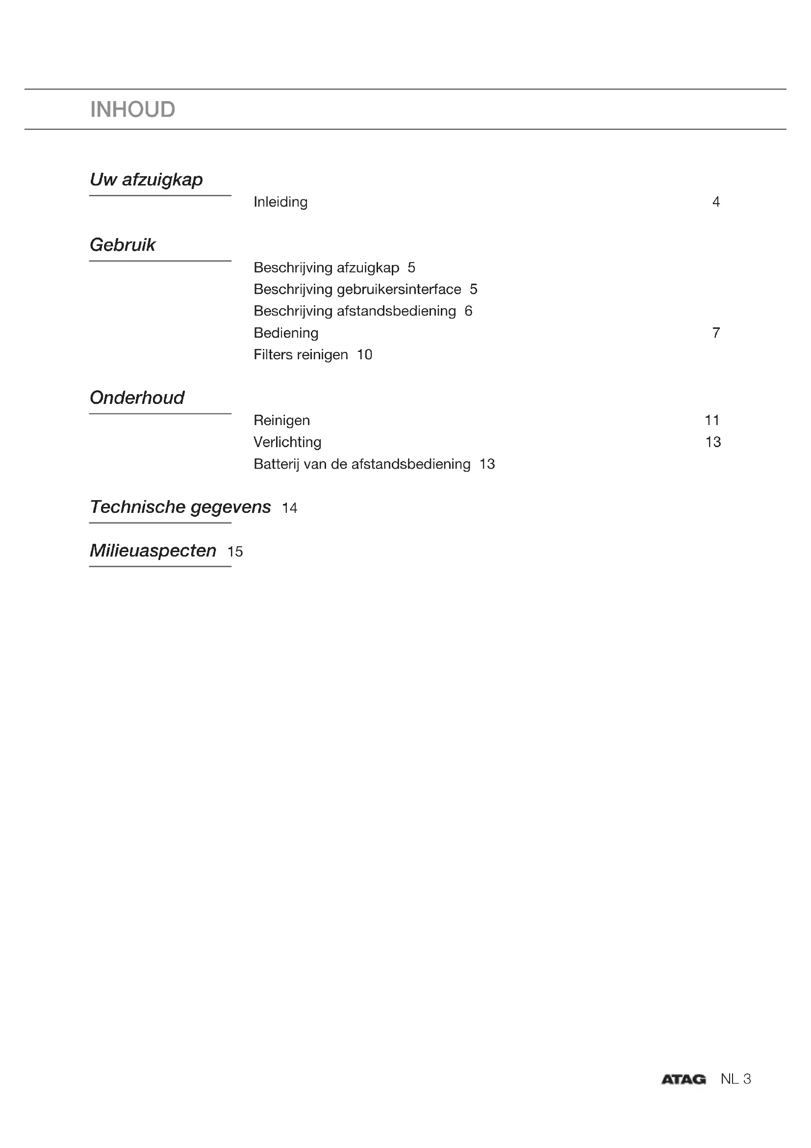 ONDERHOUDNL 13 ONDERHOUD Verwijder het overtollige water zonder het filter te beschadigen. Verwijder de houder en laat het filter ten minste 40 minuten drogen in een oven bij een maximumtemperatuur van 70 °C. Om de werking van het regenereerbare koolstoffilter efficiënt te houden, moet deze handeling iedere 2 maanden worden herhaald of wanneer de filterindicatie dit aangeeft. Het filter moet na uiterlijk 3 jaar vervangen worden, of eerder bij beschadiging. Het is belangrijk dat u de vetfilters en het regenereerbare actieve koolstoffilter goed laat drogen voordat u deze terugplaatst. Koolstoffilter vervangen: Raadpleeg de handleiding van de recirculatieset om het koolstoffilter te vervangen. Verlichting Deze afzuigkap is uitgevoerd met een lichtsysteem. Dit lichtsysteem mag alleen vervangen worden door een erkend installateur. Vervang het niet zelf. De lamp in dit huishoudelijke apparaat is uitsluitend bedoeld voor verlichting van dit apparaat. De lamp is niet geschikt voor de verlichting van een huishoudelijke ruimte. Batterij van de afstandsbediening Belangrijk! De koppeling met de afzuigkap blijft in stand wanneer de batterijen van de afstandsbediening worden vervangen. Vervang de batterijen op tijd. Bij een lage batterijspanning wordt het bereik van de afstandsbediening kleiner. Verwijder de batterijen als u de afstandsbediening lange tijd niet gebruikt. Laat de afstandsbediening niet ondersteboven op een geleidend oppervlak liggen. De garantie is niet van toepassing op de batterijen. De accu kan sneller leeglopen wanneer de lampjes op de knoppen branden. Specificaties batterij: Twee AAA-batterijenNL 14 TECHNISCHE GEGEVENS EU-gegevensblad Gegevens op basis van: Norm EN61591 en Verordening (EU) 65/2014 en 66/2014. CU90511RM CU12511RM CU12711RM CU90555RM CU12555RM CU12755RM Handelsmerk ATAG ATAG ATAG ATAG ATAG ATAG Modeltype WC90BA- BCC01 WC12BA- BCC01 IC12BA- BCD01 WC90BA- BCC01 WC12BA- BCC01 IC12BA- BCD01 Jaarlijks energieverbruik (AEC afzuigkap ) 35,3 kWh/a 34,8 kWh/a 35,9 kWh/a 35,3 kWh/a 34,8 kWh/a 35,9 kWh/a Energie-efficiëntieklasse A