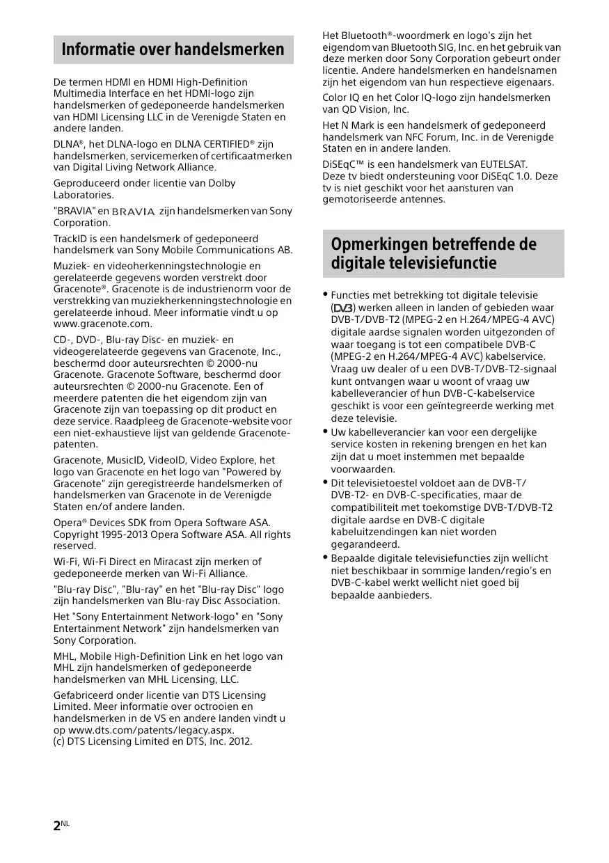 No quite la tarjeta de protección de la ranura del CAM (módulo de acceso condicional) del televisor, a menos que vaya a introducir una tarjeta inteligente compatible en el CAM. La disponibilidad de los accesorios opcionales depende del país, la región, el modelo de televisor y las existencias. El diseño y las especificaciones están sujetos a cambios sin previo aviso. Informatie over handelsmerken De termen HDMI en HDMI High-Definition Multimedia Interface en het HDMI-logo zijn handelsmerken of gedeponeerde handelsmerken van HDMI Licensing LLC in de Verenigde Staten en andere landen. DLNA®, het DLNA-logo en DLNA CERTIFIED® zijn handelsmerken, servicemerken of certificaatmerken van Digital Living Network Alliance. Geproduceerd onder licentie van Dolby Laboratories. "BRAVIA" en Corporation. Color IQ en het Color IQ-logo zijn handelsmerken van QD Vision, Inc. Het N Mark is een handelsmerk of gedeponeerd handelsmerk van NFC Forum, Inc. in de Verenigde Staten en in andere landen. DiSEqC™ is een handelsmerk van EUTELSAT. Deze tv biedt ondersteuning voor DiSEqC 1.0. Deze tv is niet geschikt voor het aansturen van gemotoriseerde antennes. zijn handelsmerken van Sony TrackID is een handelsmerk of gedeponeerd handelsmerk van Sony Mobile Communications AB. Muziek- en videoherkenningstechnologie en gerelateerde gegevens worden verstrekt door Gracenote®. Gracenote is de industrienorm voor de verstrekking van muziekherkenningstechnologie en gerelateerde inhoud. Meer informatie vindt u op www.gracenote.com. CD-, DVD-, Blu-ray Disc- en muziek- en videogerelateerde gegevens van Gracenote, Inc., beschermd door auteursrechten © 2000-nu Gracenote. Gracenote Software, beschermd door auteursrechten © 2000-nu Gracenote. Een of meerdere patenten die het eigendom zijn van Gracenote zijn van toepassing op dit product en deze service. Raadpleeg de Gracenote-website voor een niet-exhaustieve lijst van geldende Gracenotepatenten. Gracenote, MusicID, VideoID, Video Explore, het logo van Gracenote en het logo van "Powered by Gracenote" zijn geregistreerde handelsmerken of handelsmerken van Gracenote in de Verenigde Staten en/of andere landen. Opera® Devices SDK from Opera Software ASA. Copyright 1995-2013 Opera Software ASA. All rights reserved. Wi-Fi, Wi-Fi Direct en Miracast zijn merken of gedeponeerde merken van Wi-Fi Alliance. "Blu-ray Disc", "Blu-ray" en het "Blu-ray Disc" logo zijn handelsmerken van Blu-ray Disc Association. Het "Sony Entertainment Network-logo" en "Sony Entertainment Network" zijn handelsmerken van Sony Corporation. MHL, Mobile High-Definition Link en het logo van MHL zijn handelsmerken of gedeponeerde handelsmerken van MHL Licensing, LLC. Gefabriceerd onder licentie van DTS Licensing Limited. Meer informatie over octrooien en handelsmerken in de VS en andere landen vindt u op www.dts.com/patents/legacy.aspx. (c) DTS Licensing Limited en DTS, Inc. 2012. 2NL Het Bluetooth®-woordmerk en logo's zijn het eigendom van Bluetooth SIG, Inc. en het gebruik van deze merken door Sony Corporation gebeurt onder licentie. Andere handelsmerken en handelsnamen zijn het eigendom van hun respectieve eigenaars. Opmerkingen betreffende de digitale televisiefunctie Functies met betrekking tot digitale televisie ) werken alleen in landen of gebieden waar DVB-T/DVB-T2 (MPEG-2 en H.264/MPEG-4 AVC) digitale aardse signalen worden uitgezonden of waar toegang is tot een compatibele DVB-C (MPEG-2 en H.264/MPEG-4 AVC) kabelservice. Vraag uw dealer of u een DVB-T/DVB-T2-signaal kunt ontvangen waar u woont of vraag uw kabelleverancier of hun DVB-C-kabelservice geschikt is voor een geïntegreerde werking met deze televisie. Uw kabelleverancier kan voor een dergelijke service kosten in rekening brengen en het kan zijn dat u moet instemmen met bepaalde voorwaarden. Dit televisietoestel voldoet aan de DVB-T/ DVB-T2- en DVB-C-specificaties, maar de compatibiliteit met toekomstige DVB-T/DVB-T2 digitale aardse en DVB-C digitale kabeluitzendingen kan niet worden gegarandeerd. Bepaalde digitale televisiefuncties zijn wellicht niet beschikbaar in sommige landen/regio's en DVB-C-kabel werkt wellicht niet goed bij bepaalde aanbieders. Problemen oplossen Tel hoeveel keer het LED-lampje knippert als het rood knippert (intervaltijd bedraagt drie seconden). Druk op "/1 op de tv om deze uit te schakelen, haal het netsnoer uit het stopcontact en breng uw dealer of het Sonyservicecentrum op de hoogte van het knipperen van het lampje (duur en interval). Controleer de items in de onderstaande tabellen als het LEDlampje niet knippert. Raadpleeg ook "Problemen oplossen" in de i-Manual. Als het probleem aanhoudt, moet u de televisie laten nakijken door bevoegd onderhoudspersoneel. Er is geen beeld (scherm is donker) en geen geluid. Controleer de aansluiting van de antenne/ kabel. Sluit de tv aan op het stroomnet en druk op "/1 op de tv of afstandsbediening. U bent het wachtwoord voor het "Kinderslot" vergeten. Voer 9999 in als pincode. (Pincode 9999 wordt altijd geaccepteerd.) De ruimte rond de tv wordt warm. Als de tv langdurig wordt gebruikt, wordt de ruimte rond de tv warm. U kunt daar warmte voelen bij aanraking met de hand. Bevroren audio of video, een blanco scherm of de tv reageert niet op de knoppen van de tv of de afstandsbediening. Voer een eenvoudige reset uit van de tv door het netsnoer gedurende twee minuten los te koppelen. Sluit het vervolgens opnieuw aan. De knoppen CH+/–, +/–, ///, , en HOME bevinden zich niet op de tv. Hieronder vindt u een afbeelding voor de locatie van de knoppen op de tv. Achterkant van de tv Op sommige programma's kan niet worden afgestemd. Controleer de antenne of schotelantenne. De satellietkabel is mogelijk kortgesloten of niet goed aangesloten. Controleer de kabelaansluiting, schakel vervolgens de tv uit met de netstroomschakelaar en schakel deze daarna weer in. De ingevoerde frequentie ligt buiten het bereik. Neem contact op met de satellietmaatschappij van de ontvangen zender. Geen kabe