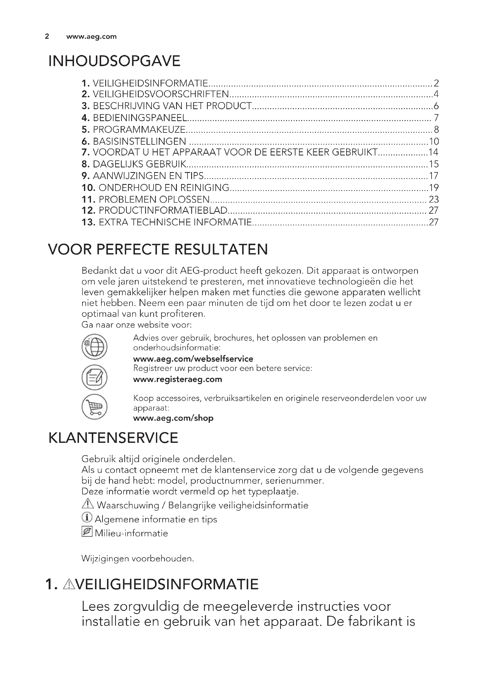 Bedankt dat u voor dit AEG-product heeft gekozen. Dit apparaat is ontworpen om vele jaren uitstekend te presteren, met innovatieve technologieën die het leven gemakkelijker helpen maken met functies die gewone apparaten wellicht niet hebben. Neem een paar minuten de tijd om het door te lezen zodat u er optimaal van kunt profiteren. Ga naar onze website voor: Advies over gebruik, brochures, het oplossen van problemen en onderhoudsinformatie: www.aeg.com/webselfservice Registreer uw product voor een betere service: www.registeraeg.com Koop accessoires, verbruiksartikelen en originele reserveonderdelen voor uw apparaat: www.aeg.com/shop KLANTENSERVICE Gebruik altijd originele onderdelen. Als u contact opneemt met de klantenservice zorg dat u de volgende gegevens bij de hand hebt: model, productnummer, serienummer. Deze informatie wordt vermeld op het typeplaatje. Waarschuwing / Belangrijke veiligheidsinformatie Algemene informatie en tips Milieu-informatie Wijzigingen voorbehouden.