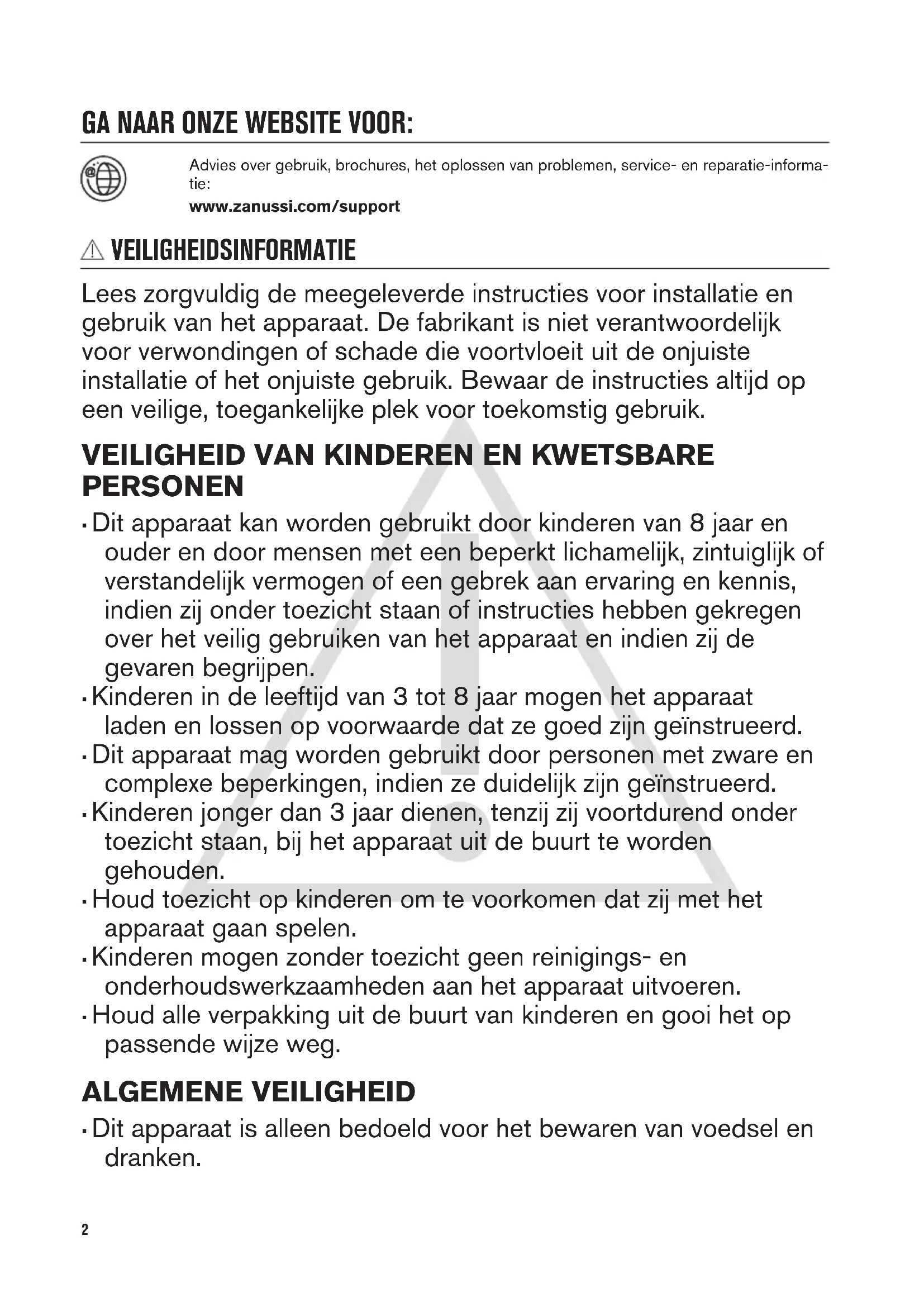 De installatie en voorbereiding van het toestel voor elke EcoDesign-verificatie moet in overeenstemming zijn met EN 62552. De ventilatievoorschriften, de afmetingen van de uitsparingen en de minimale open afstanden aan de achterzijde moeten voldoen aan de voorschriften van deze gebruikershandleiding in hoofdstuk 3. Neem contact op met de fabrikant voor verdere informatie, inclusief laadplannen. 17MILIEUBESCHERMING Recycleer de materialen met het symbool . Gooi de verpakking in een geschikte afvalcontainer om het te recycleren. Bescherm het milieu en de volksgezondheid en recycleer op een correcte manier het afval van elektrische en elektronische apparaten. Gooi apparaten gemarkeerd met het symbool niet weg met het huishoudelijk afval. Breng het product naar het milieustation bij u in de buurt of neem contact op met de gemeente. 18VISITEZ NOTRE SITE WEB POUR : Obtenir des conseils d’utilisation, des brochures, un dépanneur, des informations sur le service et les réparations : www.zanussi.com/support
