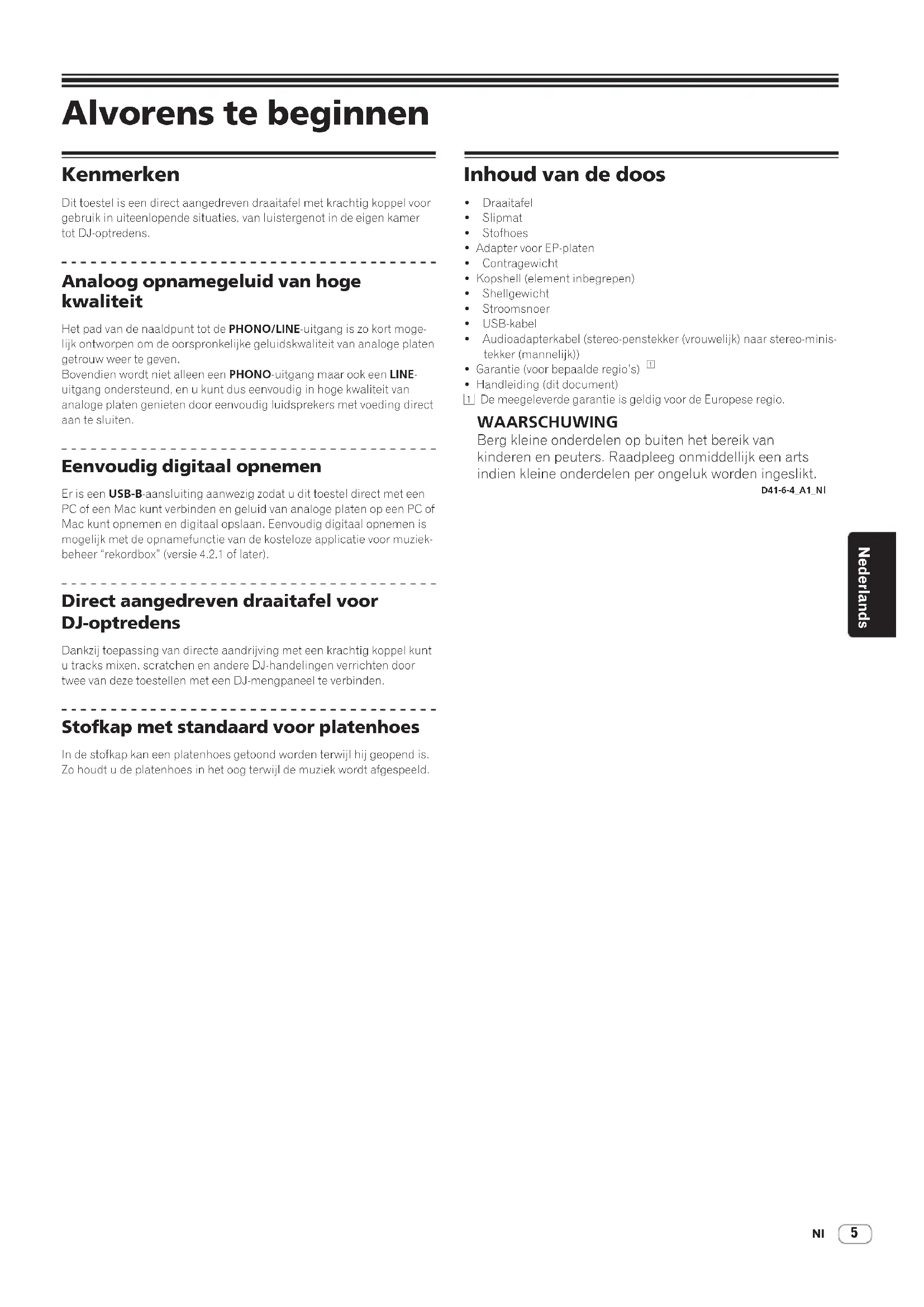 Nederlands Alvorens te beginnen Kenmerken Dit toestel is een direct aangedreven draaitafel met krachtig koppel voor gebruik in uiteenlopende situaties, van luistergenot in de eigen kamer tot DJ-optredens. Analoog opnamegeluid van hoge kwaliteit Het pad van de naaldpunt tot de PHONO/LINE-uitgang is zo kort moge- lijk ontworpen om de oorspronkelijke geluidskwaliteit van analoge platen getrouw weer te geven. Bovendien wordt niet alleen een PHONO-uitgang maar ook een LINE- uitgang ondersteund, en u kunt dus eenvoudig in hoge kwaliteit van analoge platen genieten door eenvoudig luidsprekers met voeding direct aan te sluiten. Eenvoudig digitaal opnemen Er is een USB-B-aansluiting aanwezig zodat u dit toestel direct met een PC of een Mac kunt verbinden en geluid van analoge platen op een PC of Mac kunt opnemen en digitaal opslaan. Eenvoudig digitaal opnemen is mogelijk met de opnamefunctie van de kosteloze applicatie voor muziek-beheer “rekordbox” (versie 4.2.1 of later). Direct aangedreven draaitafel voor DJ-optredens Dankzij toepassing van directe aandrijving met een krachtig koppel kunt u tracks mixen, scratchen en andere DJ-handelingen verrichten door twee van deze toestellen met een DJ-mengpaneel te verbinden. Stofkap met standaard voor platenhoes In de stofkap kan een platenhoes getoond worden terwijl hij geopend is. Zo houdt u de platenhoes in het oog terwijl de muziek wordt afgespeeld. Inhoud van de doos ! Draaitafel! Slipmat! Stofhoes! Adapter voor EP-platen! Contragewicht! Kopshell (element inbegrepen)! Shellgewicht! Stroomsnoer! USB-kabel ! Audioadapterkabel (stereo-penstekker (vrouwelijk) naar stereo-minis- tekker (mannelijk))! Garantie (voor bepaalde regio’s) ! Handleiding (dit document)1 De meegeleverde garantie is geldig voor de Europese regio. WAARSCHUWING Berg kleine onderdelen op buiten het bereik van kinderen en peuters. R aadpleeg onmiddellijk een arts indien kleine onderdelen per ongeluk worden ingeslikt. D41-6-4_A1_N lNl