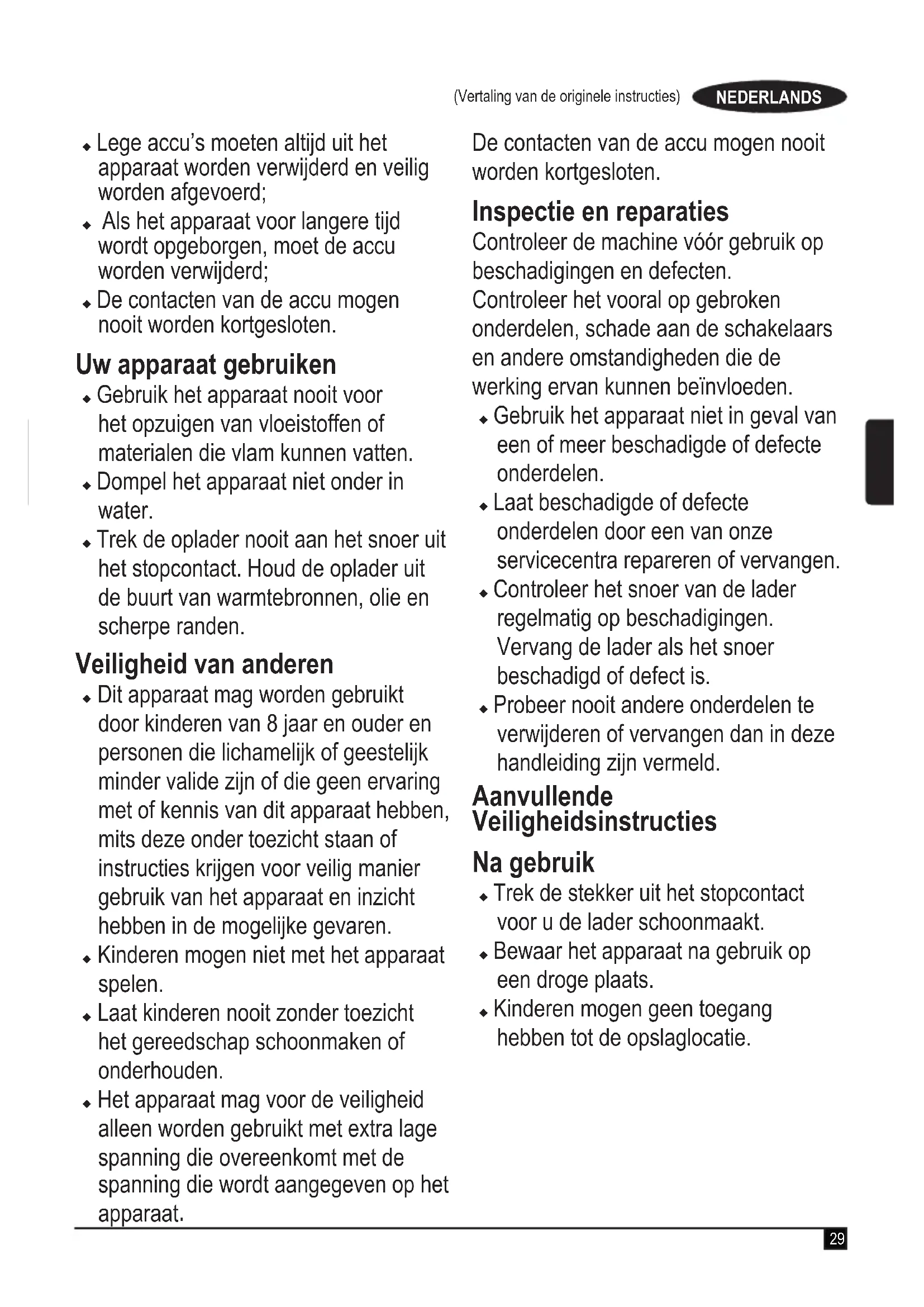 Waarschuwing! Lees alle veiligheidswaarschuwingen en alle instructies. Het niet opvolgen van de hieronder vermelde waarschuwingen en instructies kan leiden tot een elektrische schok, brand en/of ernstig persoonlijk letsel. u In deze handleiding wordt het bedoelde gebruik beschreven. Het gebruik van andere accessoires of hulpstukken dan wel de uitvoering van andere handelingen dan in deze gebruikershandleiding worden aanbevolen, kan tot persoonlijk letsel leiden. u Bewaar deze handleiding zorgvuldig zodat u deze altijd nog eens kunt raadplegen. u Oplaadbare accu’s moeten altijd uit het apparaat worden verwijderd voordat ze worden opgeladen; u Verschillende soorten batterijen of nieuwe en gebruikte batterijen mogen nooit worden gemengd; u Batterijen moeten met de juiste polariteit worden geplaatst;29 (Vertaling van de originele instructies) NEDERLANDS u Lege accu’s moeten altijd uit het apparaat worden verwijderd en veilig worden afgevoerd; u Als het apparaat voor langere tijd wordt opgeborgen, moet de accu worden verwijderd; u De contacten van de accu mogen nooit worden kortgesloten. Uw apparaat gebruiken u Gebruik het apparaat nooit voor het opzuigen van vloeistoffen of materialen die vlam kunnen vatten. u Dompel het apparaat niet onder in water. u Trek de oplader nooit aan het snoer uit het stopcontact. Houd de oplader uit de buurt van warmtebronnen, olie en scherpe randen. Veiligheid van anderen u Dit apparaat mag worden gebruikt door kinderen van 8 jaar en ouder en personen die lichamelijk of geestelijk minder valide zijn of die geen ervaring met of kennis van dit apparaat hebben, mits deze onder toezicht staan of instructies krijgen voor veilig manier gebruik van het apparaat en inzicht hebben in de mogelijke gevaren. u Kinderen mogen niet met het apparaat spelen. u Laat kinderen nooit zonder toezicht het gereedschap schoonmaken of onderhouden. u Het apparaat mag voor de veiligheid alleen worden gebruikt met extra lage spanning die overeenkomt met de spanning die wordt aangegeven op het apparaat