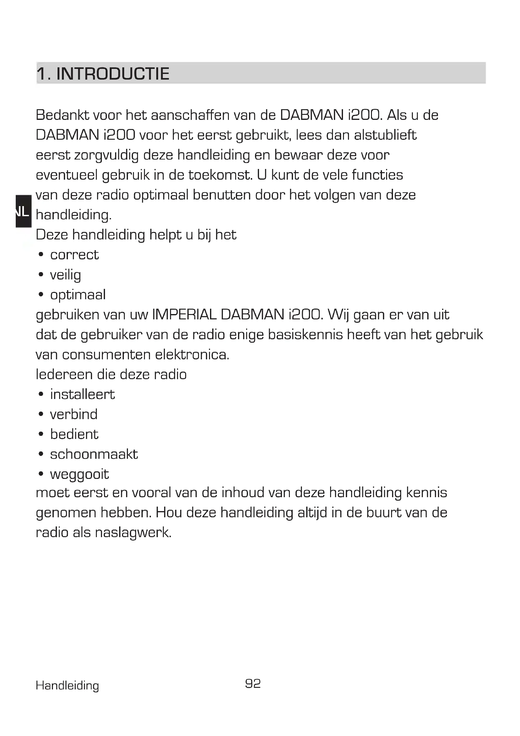 - optimaal gebruiken van uw IMPERIAL DABMAN i200. Wij gaan er van uit dat de gebruiker van de radio enige basiskennis heeft van het gebruik van consumenten elektronica. Iedereen die deze radio