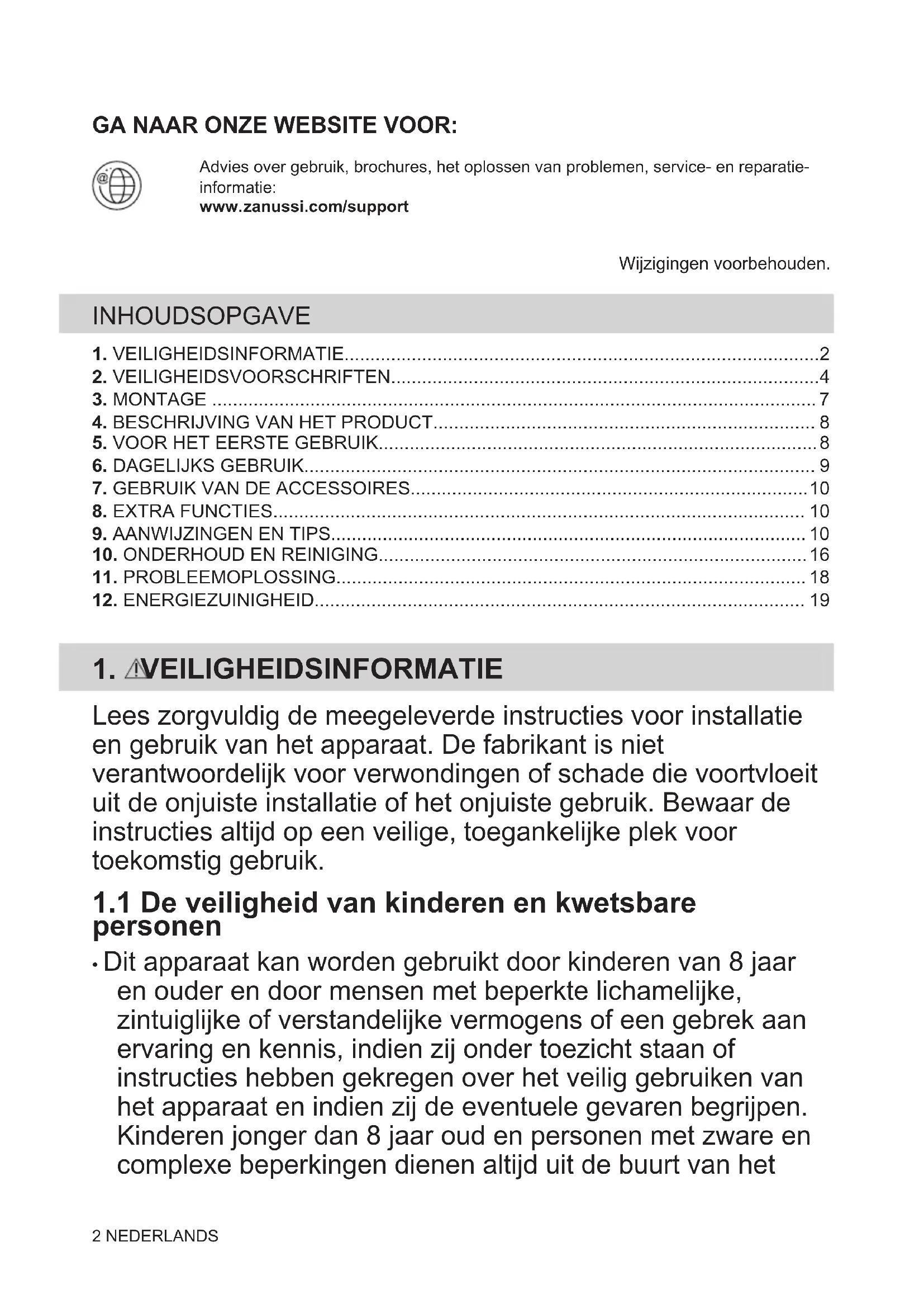 Recycleer de materialen met het symbool . Gooi de verpakking in een geschikte afvalcontainer om het te recycleren. Bescherm het milieu en de volksgezondheid en recycleer op een correcte manier het afval van elektrische en elektronische apparaten. Gooi apparaten gemarkeerd met het symbool niet weg met het huishoudelijk afval. Breng het product naar het milieustation bij u in de buurt of neem contact op met de gemeente. 20 NEDERLANDSVISIT OUR WEBSITE TO: Get usage advice, brochures, trouble shooter, service and repair information:www.zanussi.com/supportSubject to change without notice. CONTENTS