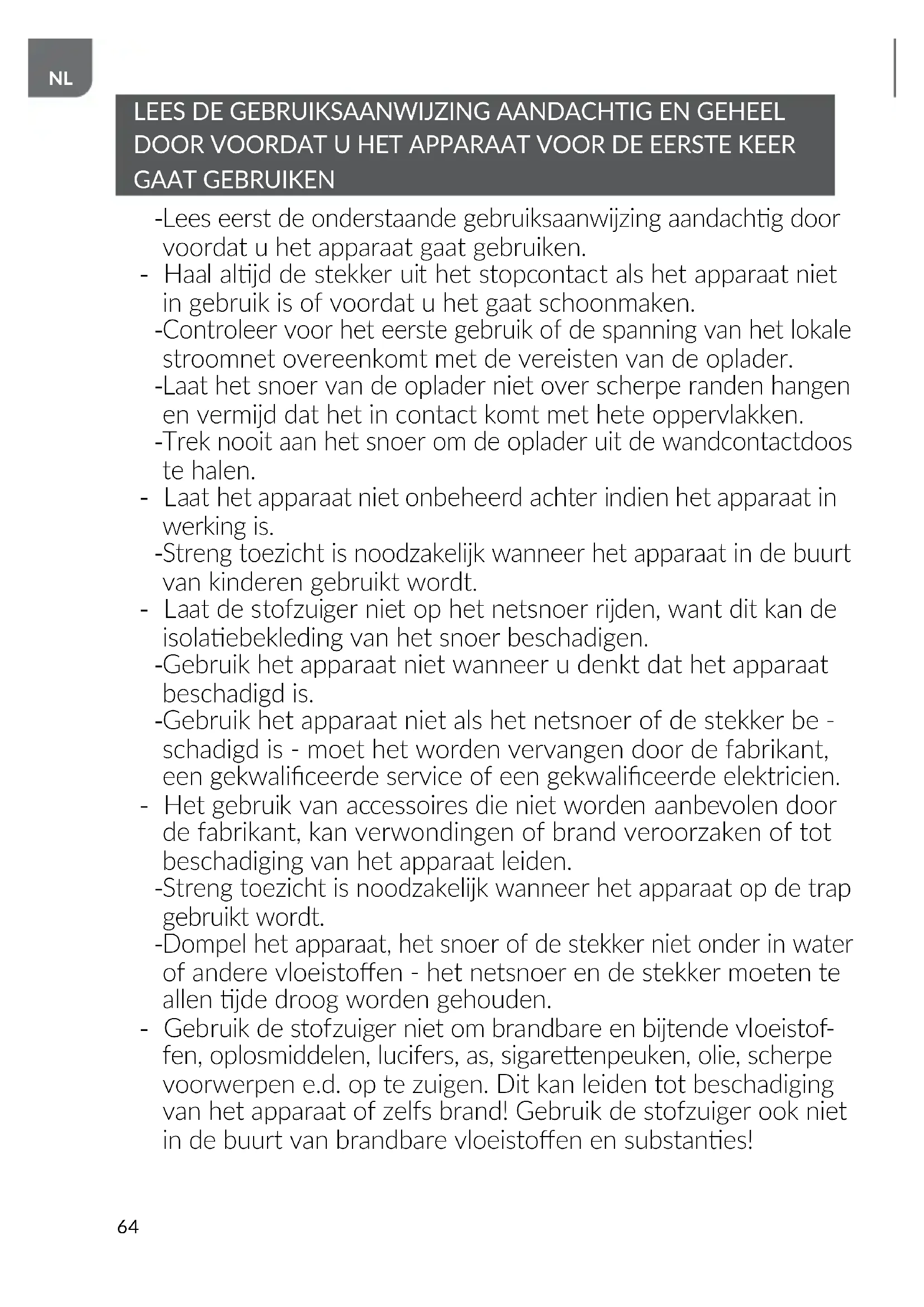 Dompel het apparaat, het snoer of de stekker niet onder in water of andere vloeistoen - het netsnoer en de stekker moeten te allen jde droog worden gehouden. - Gebruik de stofzuiger niet om brandbare en bijtende vloeistof