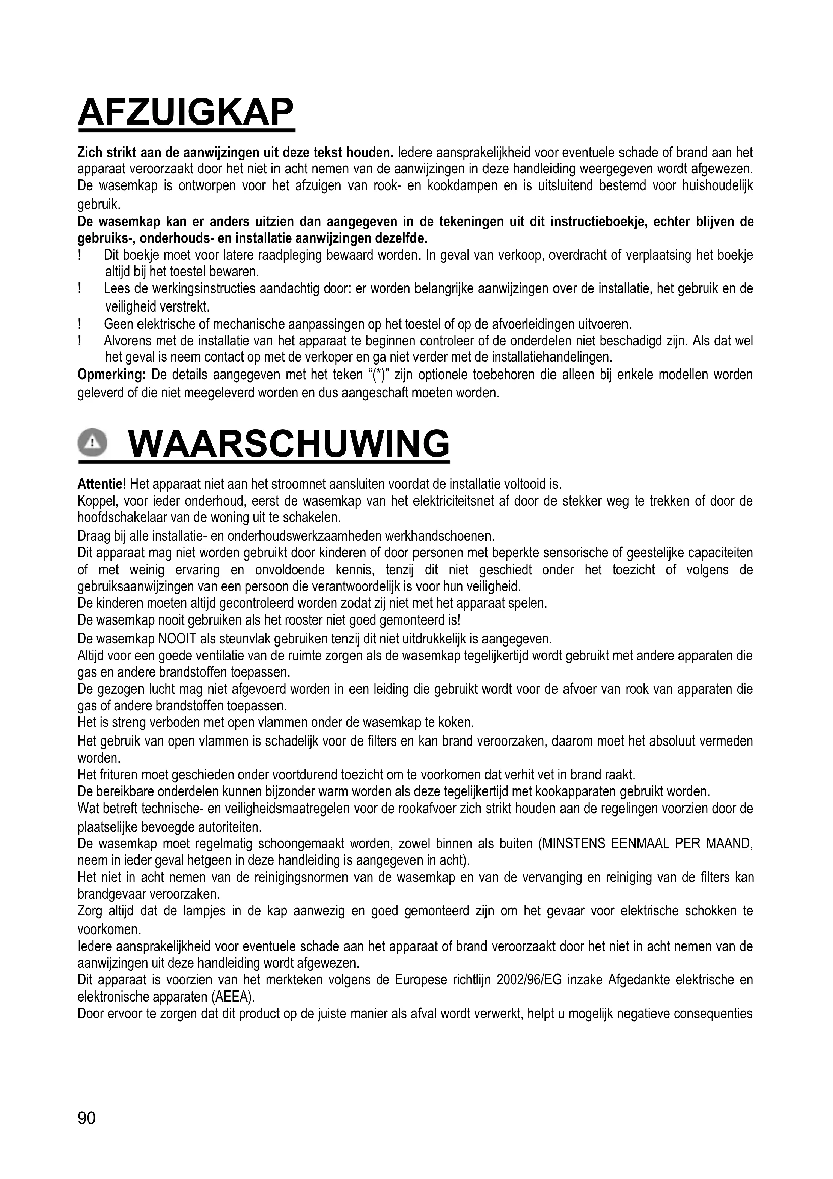 Pirms jebkura veida tehniskās apkalošanas darba, atslēgt gaisa nosūcēju no elektrības. Tīrīšana Gaisa nosūcējs ir bieži jātīra (vismaz tikpat bieži, cik bieži tiek veikta tauku filtru tehniskā apkalpošana) gan no ārpuses, gan no iekšpuses. Tīrīšanai ir jāizmanto mitrs audums, kurš ir samitrināts ar neitrāliem šķidriem mazgāšanas līdzekļiem. Neizmantot jebkuru abrazīvus saturošu produktu. NEIZMANTOT ALKOHOLU! Uzmanību: Ierīces tīrīšanas un filtru nomainīšanas normu neievērošana var vest pie ugunsgrēka riskiem. Tātad ir ietecams pieturēties pie ieteiktām instrukcijām. Tiek noraidīta jebukra atbildība par iespējamiem dzinēja bojajumiem, ugunsgrēkiem, kas tika provocēti neatbistošas tehniskās apkalpošanas vai augstāk minēto brīdinājumu neievērošanas dēļ. Prettauku filtrs Attēls 24-29 Notur tauku daļiņas, kas tiek veidotas no ēdiena pagatavošanas. Prettauku filtram ir jābūt tīrītam katru mēnesi, ar neagresīviem līdzekļiem, manuāli vai trauku mazgājamā mašīnā, pie zemas temperatūras un izmantojot īso ciklu. Ja tas tiek mazgāts trauku mazgājamā mašīnā, prettauku filtra metāla detaļas var kļūt nespodras, bet jebkurā gadījumā to spējas nemainās Lai noņemtu tauku filtru, ir jāvelk debloķēšanas atsperes rokturis. Aktīvo ogļu filtrs (Tikai Versijai ar Filtru) Attēls 26 Notur nepatīkamas smaržas, kuras veidojas no ēdiena gatavošanas. Ogles filtra piesātināšana notiek pēc vairāk vai mazāk ilgas izmantošanas, atkarībā no virtuves veida un tauku filtru tīrīšanas biežuma. Jebkurā gadījumā, ir nepieciešams nomainīt kartridžu katru ceturto mēnesi. NEVAR būt mazgāts vai atjaunots. Spuldžu nomainīšana Gaisa nosūcējs ir aprīkots ar apgaismošanas sistēmu, kas pamatojas uz LED tehnoloģiju. LED nodrošina optimālu apgaismošanu, kas ilgst 10 reizes vairāk par tradicionālajām spuldzītēm un ļauj ietaupīt 90% elektriskās enerģijas. Nomainīšanai griezties uz tehniskās apkalpošanas servisu.90 AFZUIGKAP Zich strikt aan de aanwijzingen uit deze tekst houden. Iedere aansprakelijkheid voor eventuele schade of brand aan het apparaat veroorzaakt door het niet in acht nemen van de aanwijzingen in deze handleiding weergegeven wordt afgewezen. De wasemkap is ontworpen voor het afzuigen van rook- en kookdampen en is uitsluitend bestemd voor huishoudelijk gebruik. De wasemkap kan er anders uitzien dan aangegeven in de tekeningen uit dit instructieboekje, echter blijven de gebruiks-, onderhouds- en installatie aanwijzingen dezelfde. ! Dit boekje moet voor latere raadpleging bewaard worden. In geval van verkoop, overdracht of verplaatsing het boekje altijd bij het toestel bewaren. ! Lees de werkingsinstructies aandachtig door: er worden belangrijke aanwijzingen over de installatie, het gebruik en de veiligheid verstrekt. ! Geen elektrische of mechanische aanpassingen op het toestel of op de afvoerleidingen uitvoeren. ! Alvorens met de installatie van het apparaat te beginnen controleer of de onderdelen niet beschadigd zijn. Als dat wel het geval is neem contact op met de verkoper en ga niet verder met de installatiehandelingen. Opmerking: De details aangegeven met het teken “(*)” zijn optionele toebehoren die alleen bij enkele modellen worden geleverd of die niet meegeleverd worden en dus aangeschaft moeten worden. WAARSCHUWING Attentie! Het apparaat niet aan het stroomnet aansluiten voordat de installatie voltooid is. Koppel, voor ieder onderhoud, eerst de wasemkap van het elektriciteitsnet af door de stekker weg te trekken of door de hoofdschakelaar van de woning uit te schakelen. Draag bij alle installatie- en onderhoudswerkzaamheden werkhandschoenen. Dit apparaat mag niet worden gebruikt door kinderen of door personen met beperkte sensorische of geestelijke capaciteiten of met weinig ervaring en onvoldoende kennis, tenzij dit niet geschiedt onder het toezicht of volgens de gebruiksaanwijzingen van een persoon die verantwoordelijk is voor hun veiligheid. De kinderen moeten altijd gecontroleerd worden zodat zij niet met het apparaat spelen. De wasemkap nooit gebruiken als het rooster niet goed gemonteerd is! De wasemkap NOOIT als steunvlak gebruiken tenzij dit niet uitdrukkelijk is aangegeven. Altijd voor een goede ventilatie van de ruimte zorgen als de wasemkap tegelijkertijd wordt gebruikt met andere apparaten die gas en andere brandstoffen toepassen. De gezogen lucht mag niet afgevoerd worden in een leiding die gebruikt wordt voor de afvoer van rook van apparaten die gas of andere brandstoffen toepassen. Het is streng verboden met open vlammen onder de wasemkap te koken. Het gebruik van open vlammen is schadelijk voor de filters en kan brand veroorzaken, daarom moet het absoluut vermeden worden. Het frituren moet geschieden onder voortdurend toezicht om te voorkomen dat verhit vet in brand raakt. De bereikbare onderdelen kunnen bijzonder warm worden als deze tegelijkertijd met kookapparaten gebruikt worden. Wat betreft technische- en veiligheidsmaatregelen voor de rookafvoer zich strikt houden aan de regelingen voorzien door de plaatselijke bevoegde autoriteiten. De wasemkap moet regelmatig schoongemaakt worden, zowel binnen als buiten (MINSTENS EENMAAL PER MAAND, neem in ieder geval hetgeen in deze handleiding is aangegeven in acht). Het niet in acht nemen van de reinigingsnormen van de wasemkap en van de vervanging en reiniging van de filters kan brandgevaar veroorzaken. Zorg altijd dat de lampjes in de kap aanwezig en goed gemonteerd zijn om het gevaar voor elektrische schokken te voorkomen. Iedere aansprakelijkheid voor eventuele schade aan het apparaat of brand veroorzaakt door het niet in acht nemen van de aanwijzingen uit deze handleiding wordt afgewezen. Dit apparaat is voorzien van het merkteken volgens de Europese richtlijn 2002/96/EG inzake Afgedankte elektrische en elektronische apparaten (AEEA). Door ervoor te zorgen dat dit product op de juiste manier