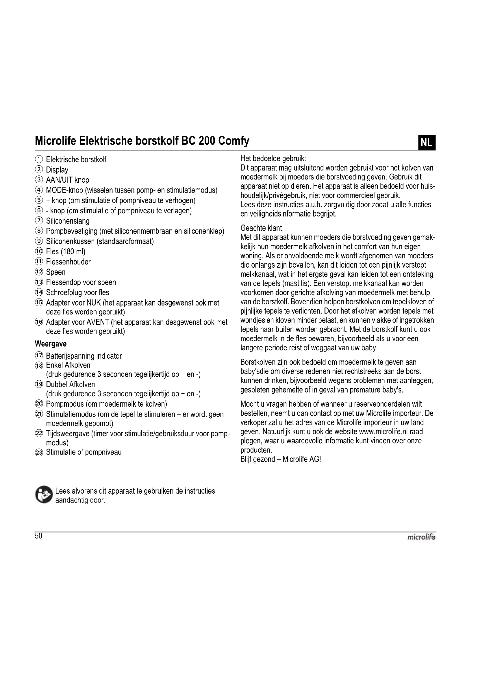 Alimentação: Pilhas alcalinas 4 x 1,5 V; tamanho AA Adaptador AC: Entrada: 100-240V AC 50/60Hz 0,5A Saída: 6V DC 1.0 A Duração da pilha: 500 horas Classe IP: IP21 Duração expectável de utilização: 500 horas Limites de funcionamento: 30 min. On / 30 min. Off Equipamento do tipo BF (unidade com grau específico de proteção contra perigos elétricos). Unidade adequada para utilização na ausência de atmosferas com gases comburentes ou explosivos, óxido nitroso.50 Weergave Lees alvorens dit apparaat te gebruiken de instructies aandachtig door. Het bedoelde gebruik: Dit apparaat mag uitsluitend worden gebruikt voor het kolven van moedermelk bij moeders die borstvoeding geven. Gebruik dit apparaat niet op dieren. Het apparaat is alleen bedoeld voor huis- houdelijk/privégebruik, niet voor commercieel gebruik. Lees deze instructies a.u.b. zorgvuldig door zodat u alle functies en veiligheidsinformatie begrijpt. Geachte klant, Met dit apparaat kunnen moeders die borstvoeding geven gemak- kelijk hun moedermelk afkolven in het comfort van hun eigen woning. Als er onvoldoende melk wordt afgenomen van moeders die onlangs zijn bevallen, kan dit leiden tot een pijnlijk verstopt melkkanaal, wat in het ergste geval kan leiden tot een ontsteking van de tepels (mastitis). Een verstopt melkkanaal kan worden voorkomen door gerichte afkolving van moedermelk met behulp van de borstkolf. Bovendien helpen borstkolven om tepelkloven of pijnlijke tepels te verlichten. Door het afkolven worden tepels met wondjes en kloven minder belast, en kunnen vlakke of ingetrokken tepels naar buiten worden gebracht. Met de borstkolf kunt u ook moedermelk in de fles bewaren, bijvoorbeeld als u voor een langere periode reist of weggaat van uw baby. Borstkolven zijn ook bedoeld om moedermelk te geven aan baby'sdie om diverse redenen niet rechtstreeks aan de borst kunnen drinken, bijvoorbeeld wegens problemen met aanleggen, gespleten gehemelte of in geval van premature baby's. Mocht u vragen hebben of wanneer u reserveonderdelen wilt bestellen, neemt u dan contact op met uw Microlife importeur. De verkoper zal u het adres van de Microlife importeur in uw land geven. Natuurlijk kunt u ook de website www.microlife.nl raad- plegen, waar u waardevolle informatie kunt vinden over onze producten. Blijf gezond – Microlife AG! Microlife Elektrische borstkolf BC 200 Comfy