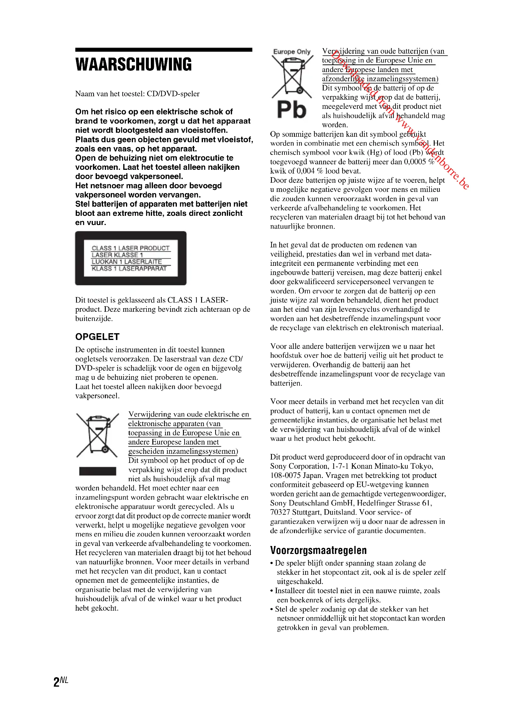 WAARSCHUWING Naam van het toestel: CD/DVD-spelerOm het risico op een elektrische schok of brand te voorkomen, zorgt u dat het apparaat niet wordt blootgesteld aan vloeistoffen. Plaats dus geen objecten gevuld met vloeistof, zoals een vaas, op het apparaat.Open de behuizing niet om elektrocutie te voorkomen. Laat het toestel alleen nakijken door bevoegd vakpersoneel. Het netsnoer mag alleen door bevoegd vakpersoneel worden vervangen.Stel batterijen of apparaten met batterijen niet bloot aan extreme hitte, zoals direct zonlicht en vuur.Dit toestel is geklasseerd als CLASS 1 LASER-product. Deze markering bevindt zich achteraan op de buitenzijde. OPGELET De optische instrumenten in dit toestel kunnen oogletsels veroorzaken. De laserstraal van deze CD/DVD-speler is schadelijk voor de ogen en bijgevolg mag u de behuizing niet proberen te openen.Laat het toestel alleen nakijken door bevoegd vakpersoneel.Verwijdering van oude elektrische en elektronische apparaten (van toepassing in de Europese Unie en andere Europese landen met gescheiden inzamelingssystemen)Dit symbool op het product of op de verpakking wijst erop dat dit product niet als huishoudelijk afval mag worden behandeld. Het moet echter naar een inzamelingspunt worden gebracht waar elektrische en elektronische apparatuur wordt gerecycled. Als u ervoor zorgt dat dit product op de correcte manier wordt verwerkt, helpt u mogelijke negatieve gevolgen voor mens en milieu die zouden kunnen veroorzaakt worden in geval van verkeerde afvalbehandeling te voorkomen. Het recycleren van materialen draagt bij tot het behoud van natuurlijke bronnen. Voor meer details in verband met het recyclen van dit product, kan u contact opnemen met de gemeentelijke instanties, de organisatie belast met de verwijdering van huishoudelijk afval of de winkel waar u het product hebt gekocht.Verwijdering van oude batterijen (van toepassing in de Europese Unie en andere Europese landen met afzonderlijke inzamelingssystemen)Dit symbool op de batterij of op de verpakking wijst erop dat de batterij, meegeleverd met van dit product niet als huishoudelijk afval behandeld mag worden.Op sommige batterijen kan dit symbool gebruikt worden in combinatie met een chemisch symbool. Het chemisch symbool voor kwik (Hg) of lood (Pb) wordt toegevoegd wanneer de batterij meer dan 0,0005 % kwik of 0,004 % lood bevat.Door deze batterijen op juiste wijze af te voeren, helpt u mogelijke negatieve gevolgen voor mens en milieu die zouden kunnen veroorzaakt worden in geval van verkeerde afvalbehandeling te voorkomen. Het recycleren van materialen draagt bij tot het behoud van natuurlijke bronnen.In het geval dat de producten om redenen van veiligheid, prestaties dan wel in verband met data-integriteit een permanente verbinding met een ingebouwde batterij vereisen, mag deze batterij enkel door gekwalificeerd servicepersoneel vervangen te worden. Om ervoor te zorgen dat de batterij op een juiste wijze zal worden behandeld, dient het product aan het eind van zijn levenscyclus overhandigd te worden aan het desbetreffende inzamelingspunt voor de recyclage van elektrisch en elektronisch materiaal.Voor alle andere batterijen verwijzen we u naar het hoofdstuk over hoe de batterij veilig uit het product te verwijderen. Overhandig de batterij aan het desbetreffende inzamelingspunt voor de recyclage van batterijen.Voor meer details in verband met het recyclen van dit product of batterij, kan u contact opnemen met de gemeentelijke instanties, de organisatie het belast met de verwijdering van huishoudelijk afval of de winkel waar u het product hebt gekocht.Dit product werd geproduceerd door of in opdracht van Sony Corporation, 1-7-1 Konan Minato-ku Tokyo, 108-0075 Japan. Vragen met betrekking tot product conformiteit gebaseerd op EU-wetgeving kunnen worden gericht aan de gemachtigde vertegenwoordiger, Sony Deutschland GmbH, Hedelfinger Strasse 61, 70327 Stuttgart, Duitsland. Voor service- of garantiezaken verwijzen wij u door naar de adressen in de afzonderlijke service of garantie documenten. Voorzorgsmaatregelen
